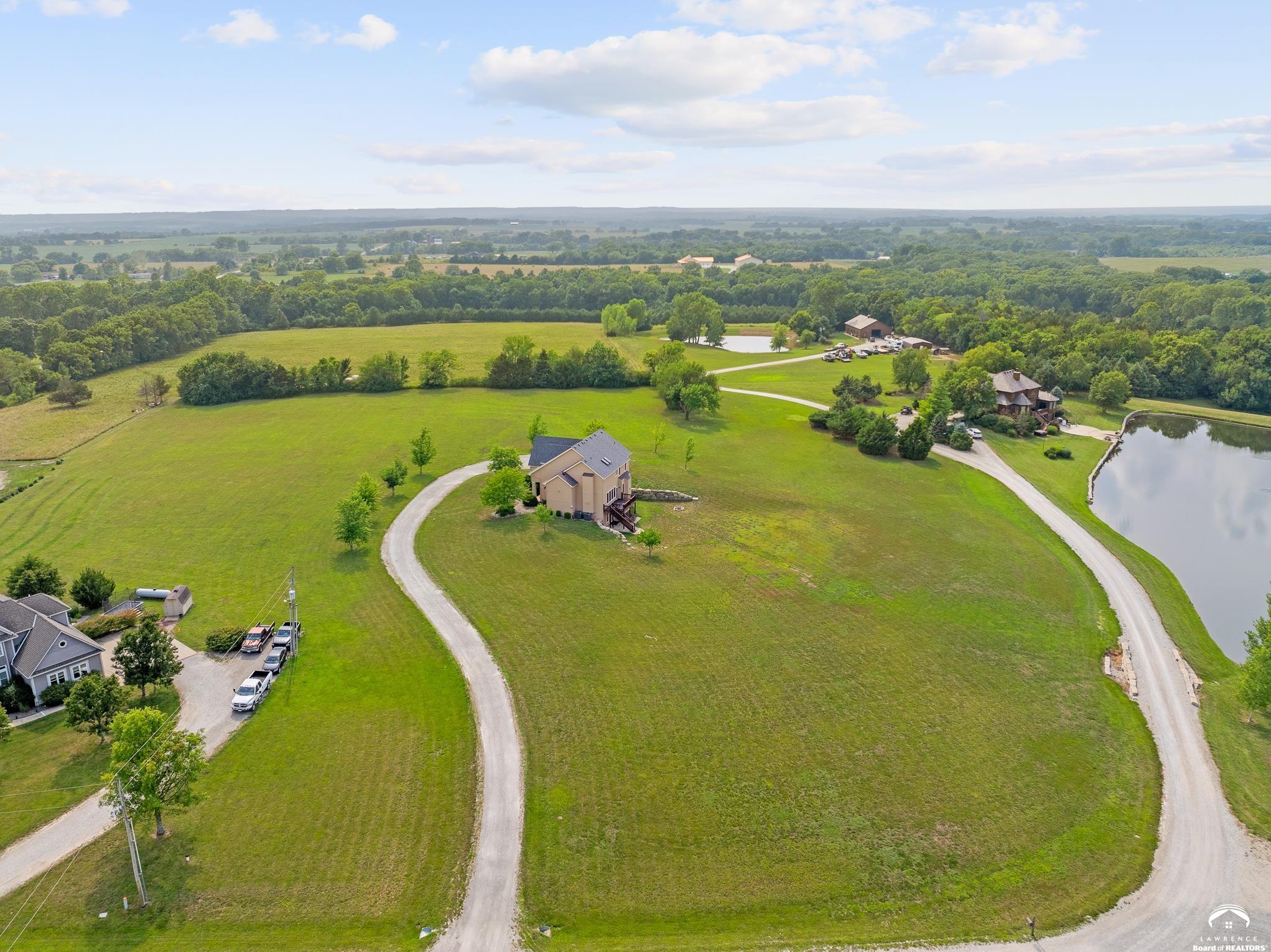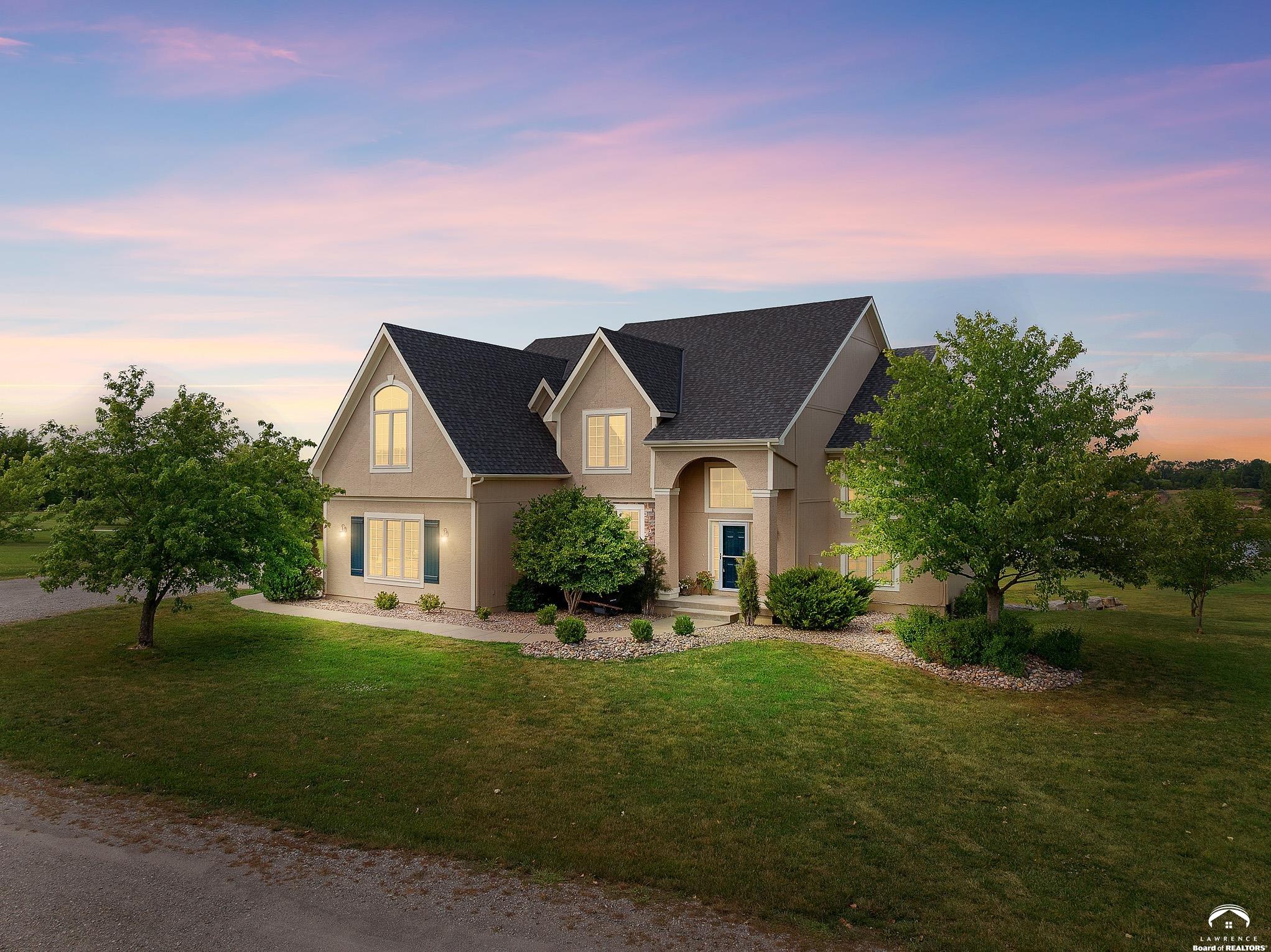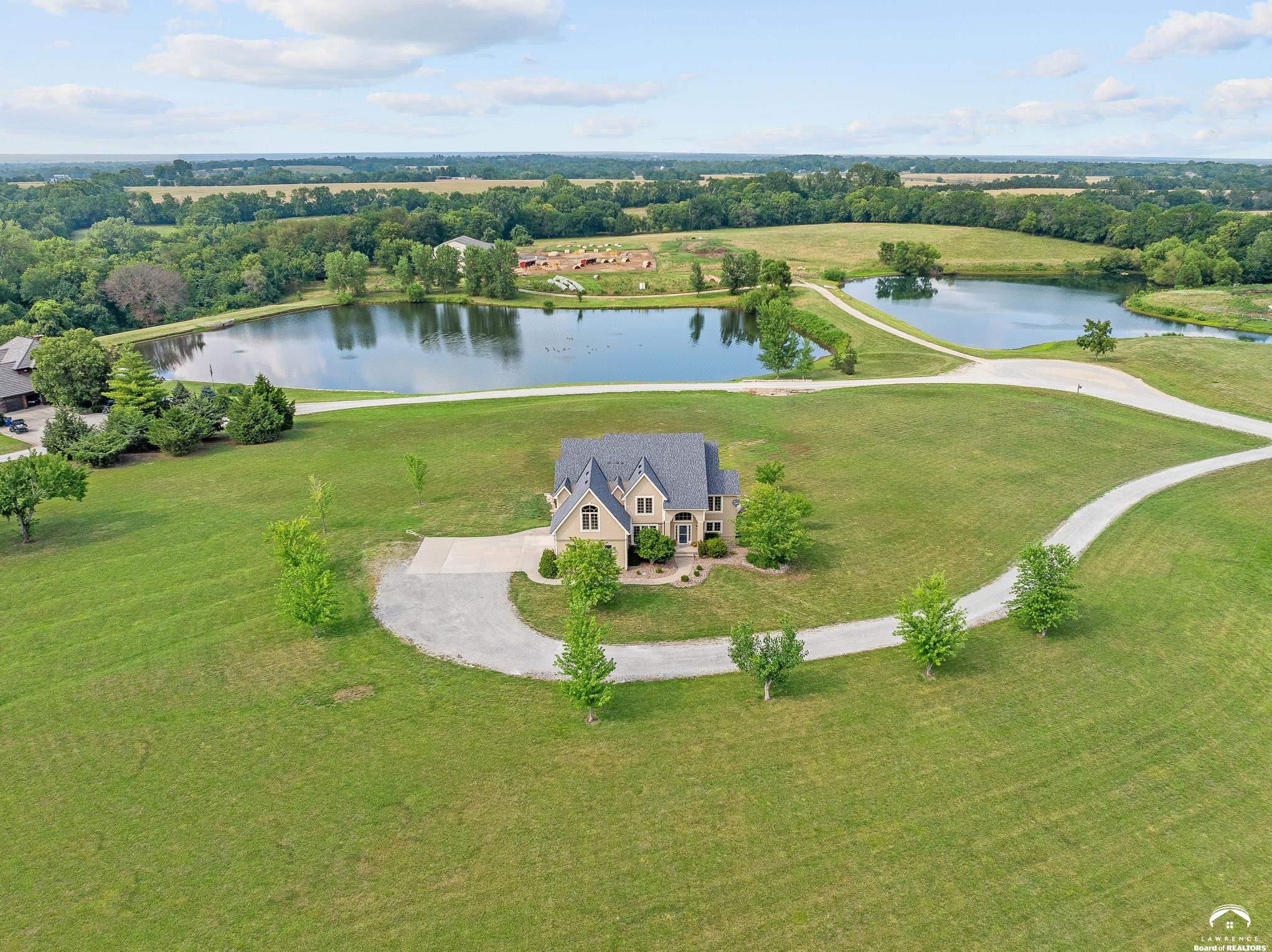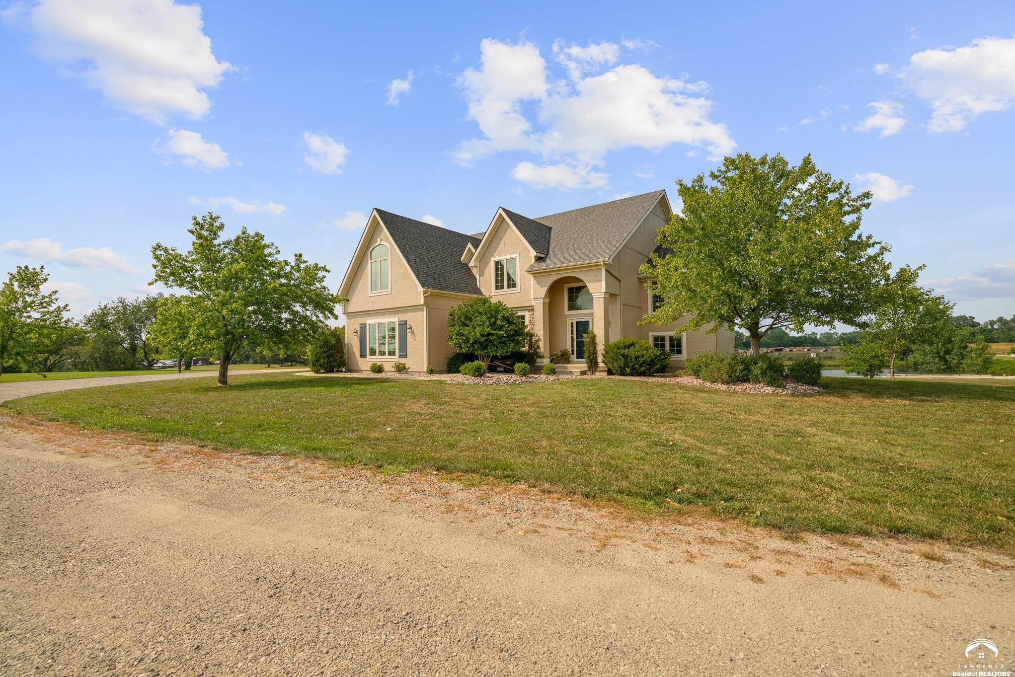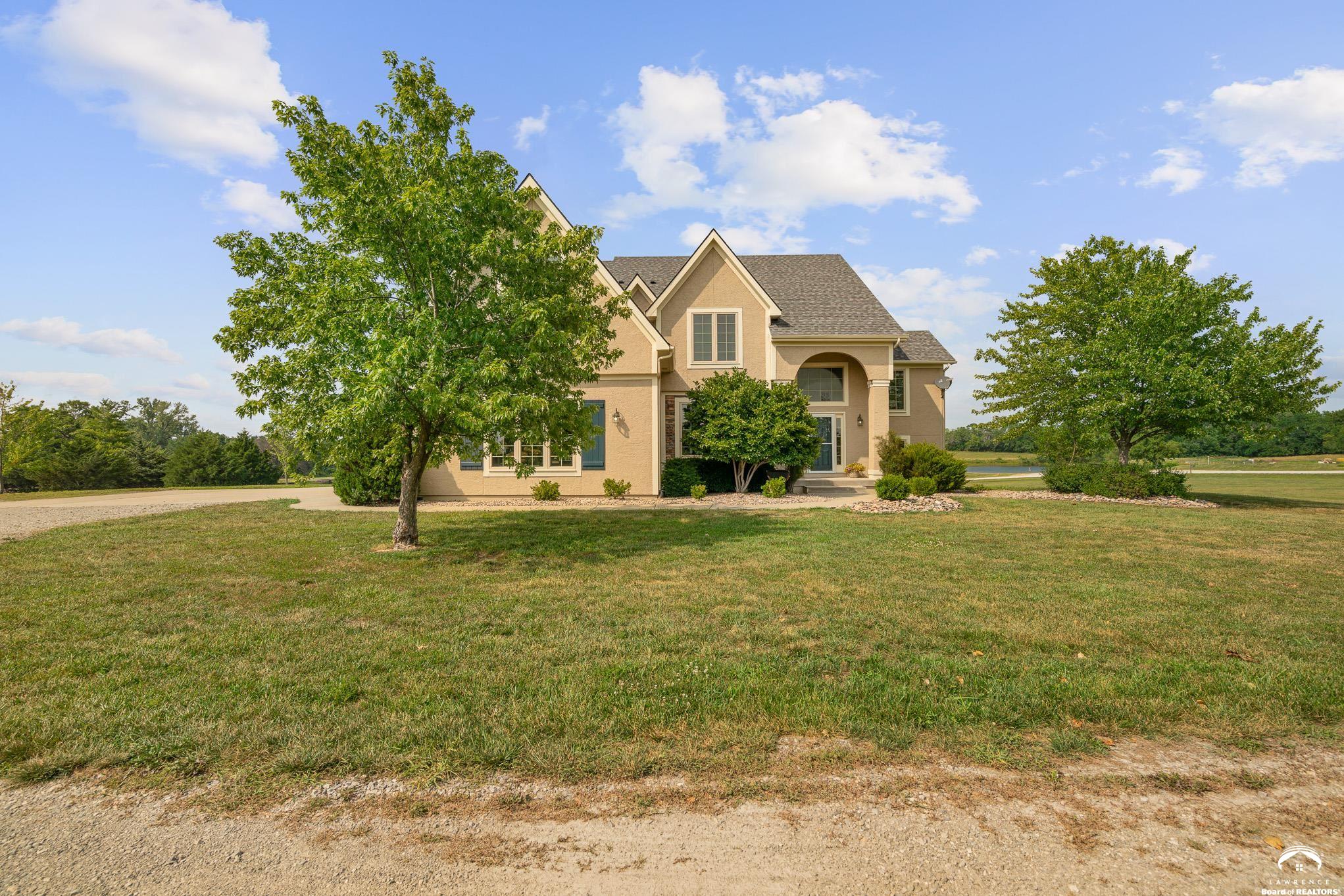 Beautiful two story home positioned perfectly on 4+/- acres overlooking a manicured pond just east of Lawrence! Lovingly maintained with updates throughout including fresh paint, updated carpeting, light fixtures, a new roof, 3 fireplaces, built in bookcases, beautiful primary en-suite. Kitchen has lots of cabinet room and a walk-in pantry. Finished walk-out basement including a family room, bedroom, bathroom and storage. Come and see this beauty today! All taxes and msmts are approx.