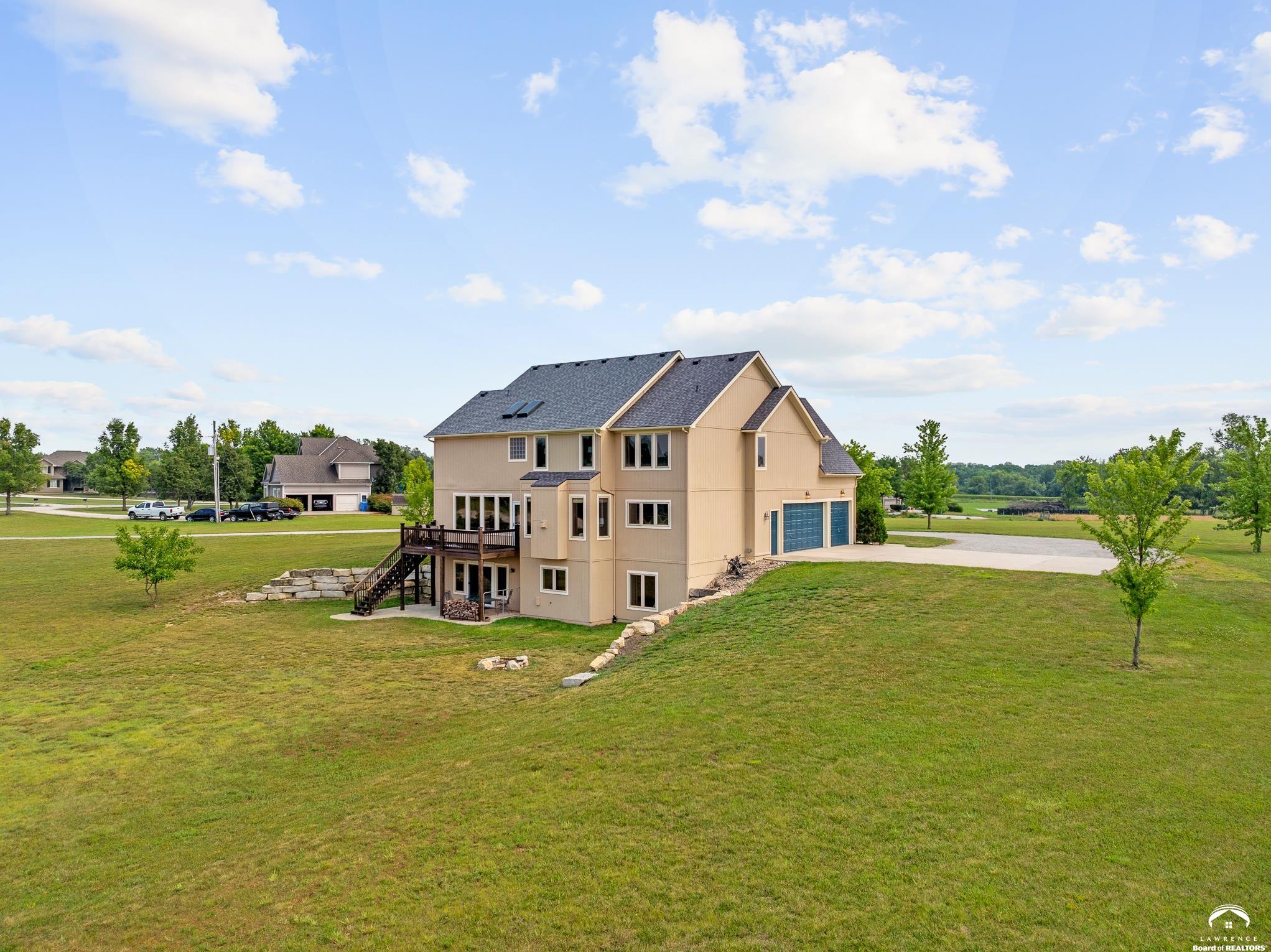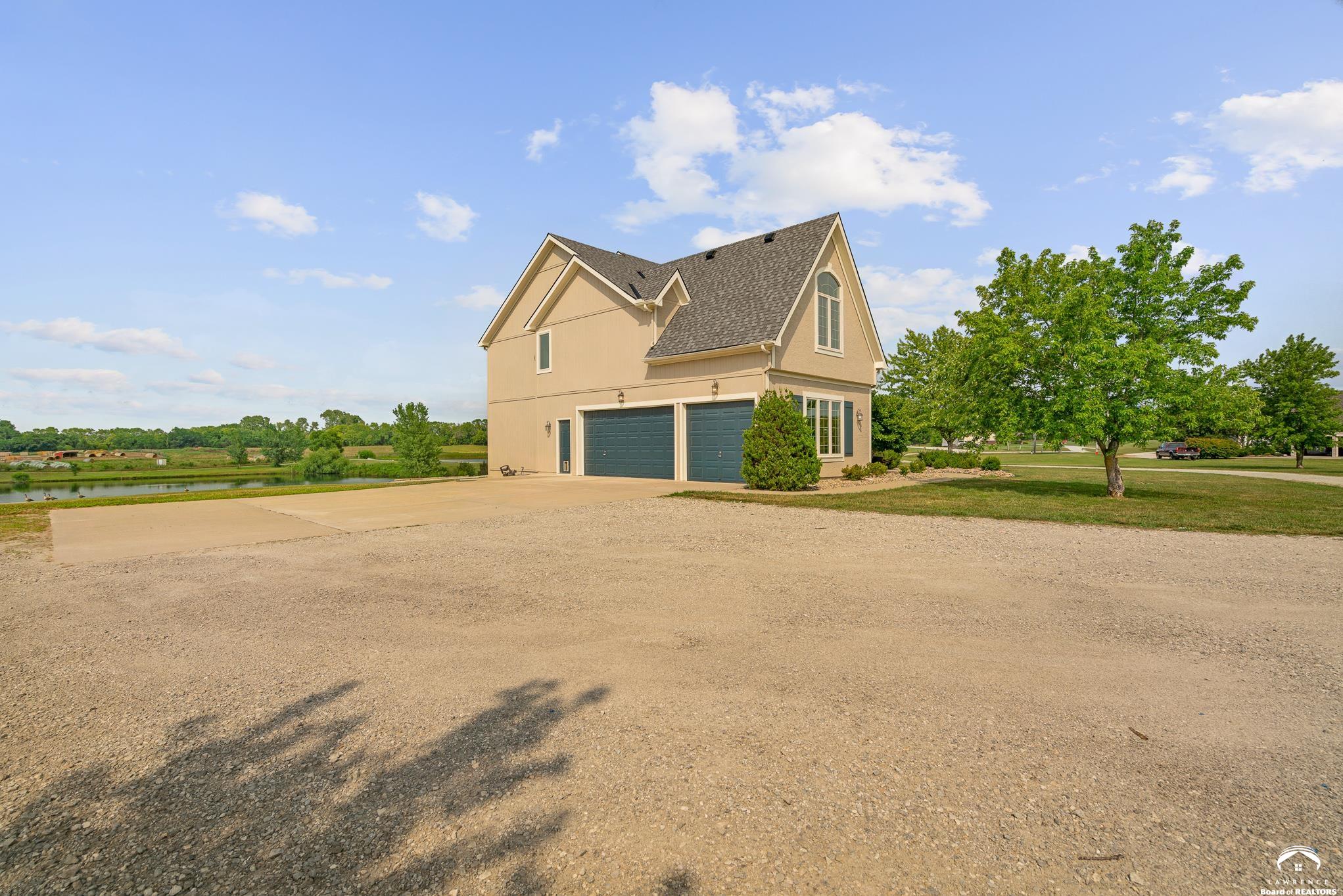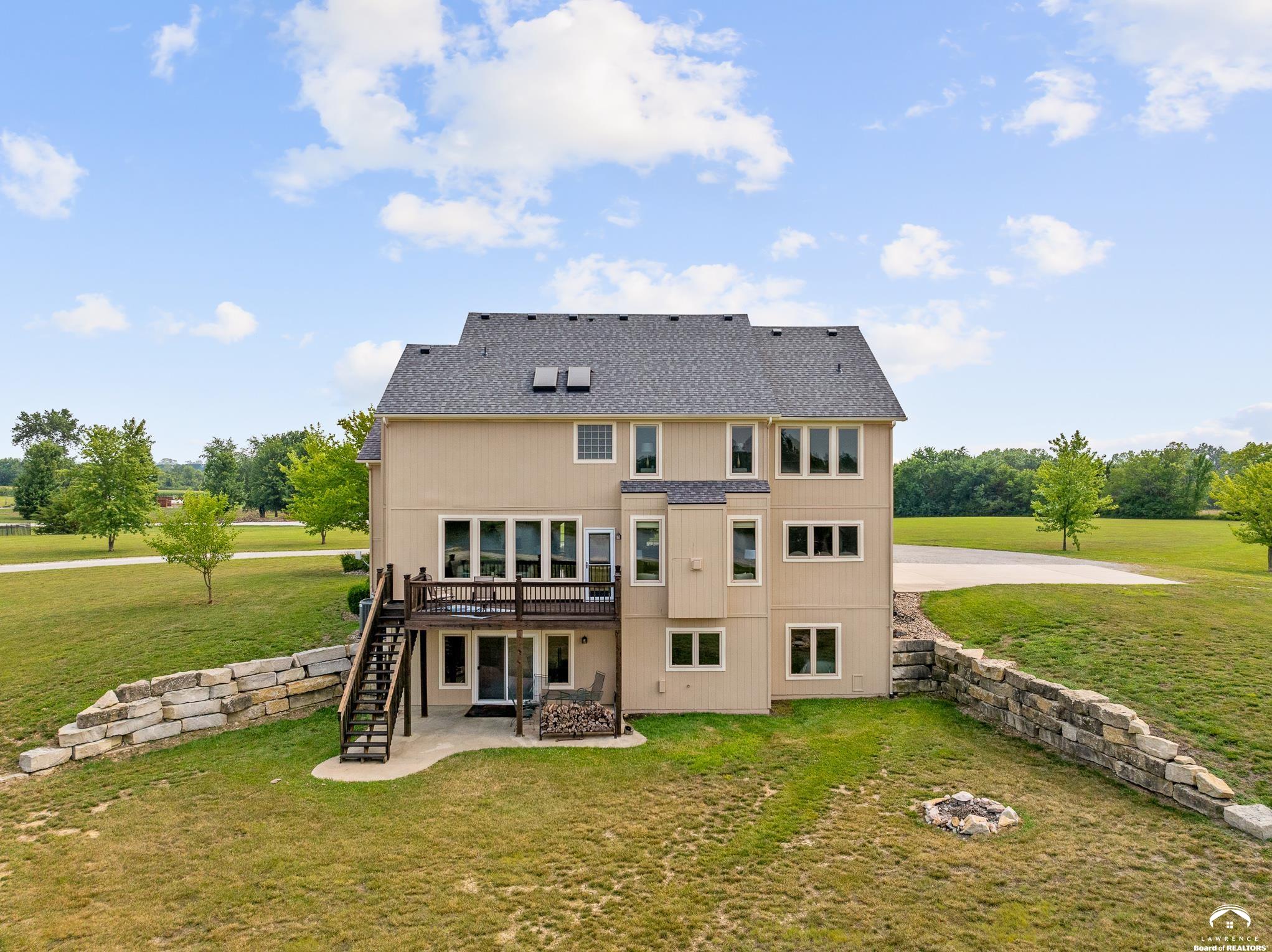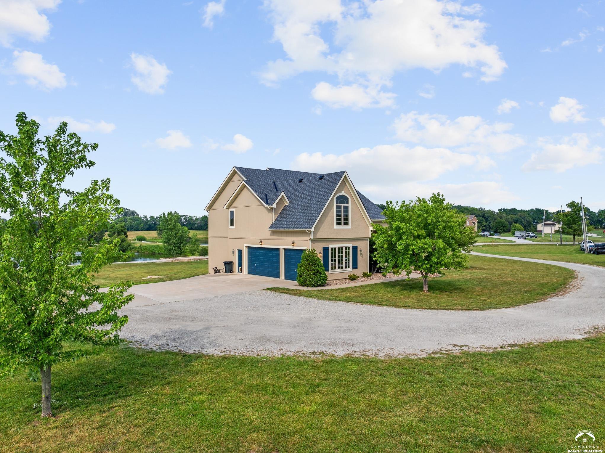 Beautiful two story home positioned perfectly on 4+/- acres overlooking a manicured pond just east of Lawrence! Lovingly maintained with updates throughout including fresh paint, updated carpeting, light fixtures, a new roof, 3 fireplaces, built in bookcases, beautiful primary en-suite. Kitchen has lots of cabinet room and a walk-in pantry. Finished walk-out basement including a family room, bedroom, bathroom and storage. Come and see this beauty today! All taxes and msmts are approx.