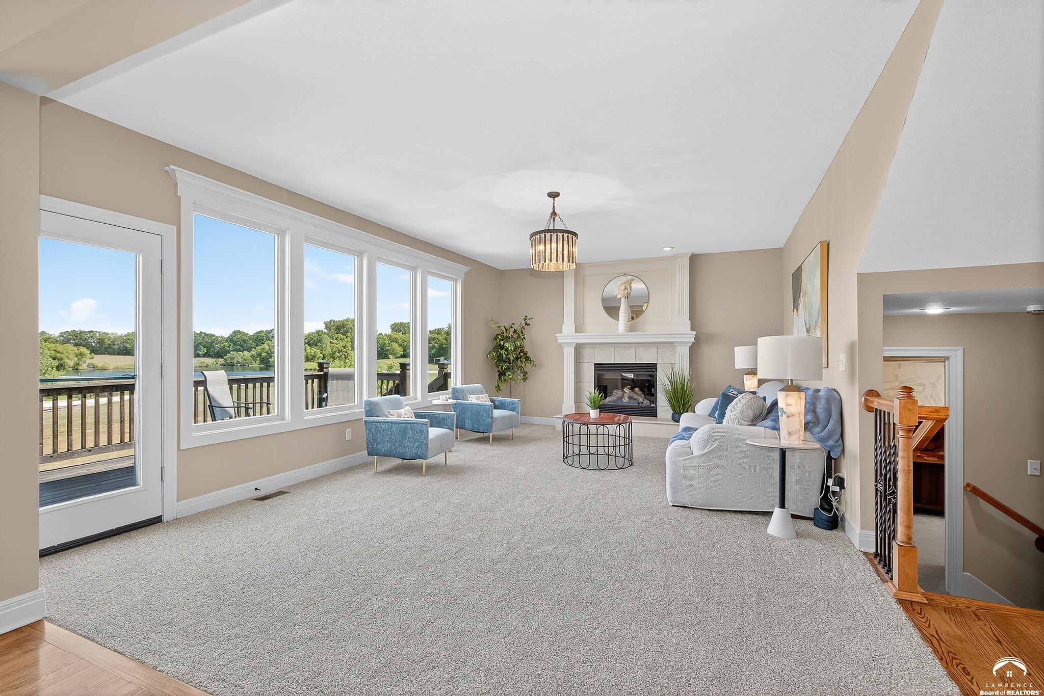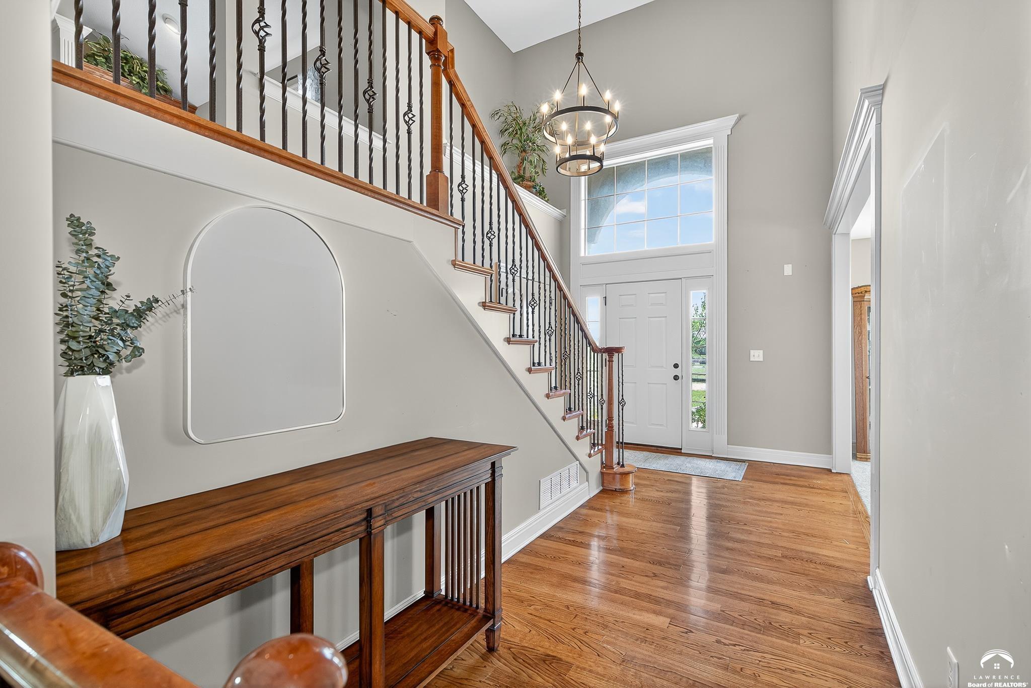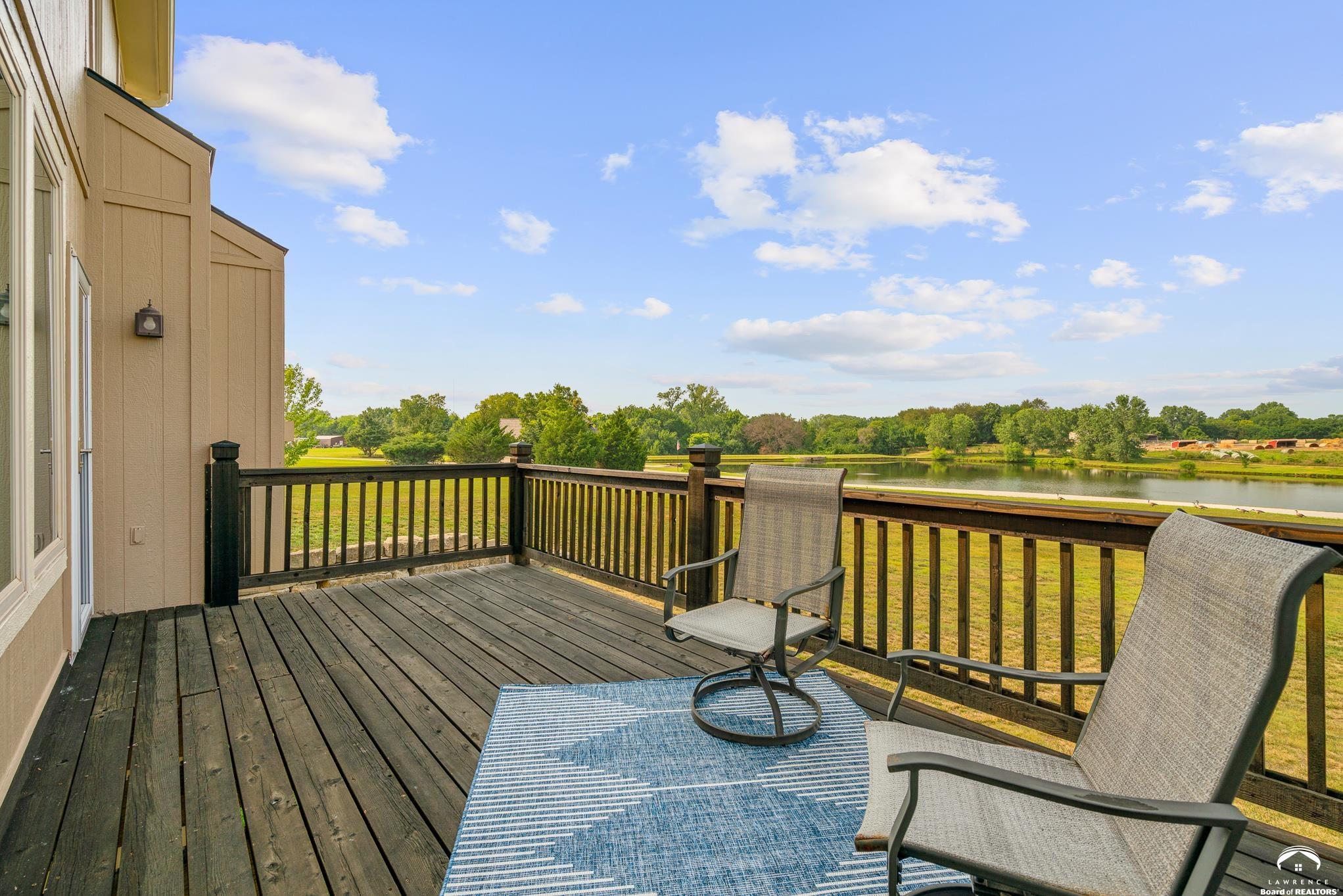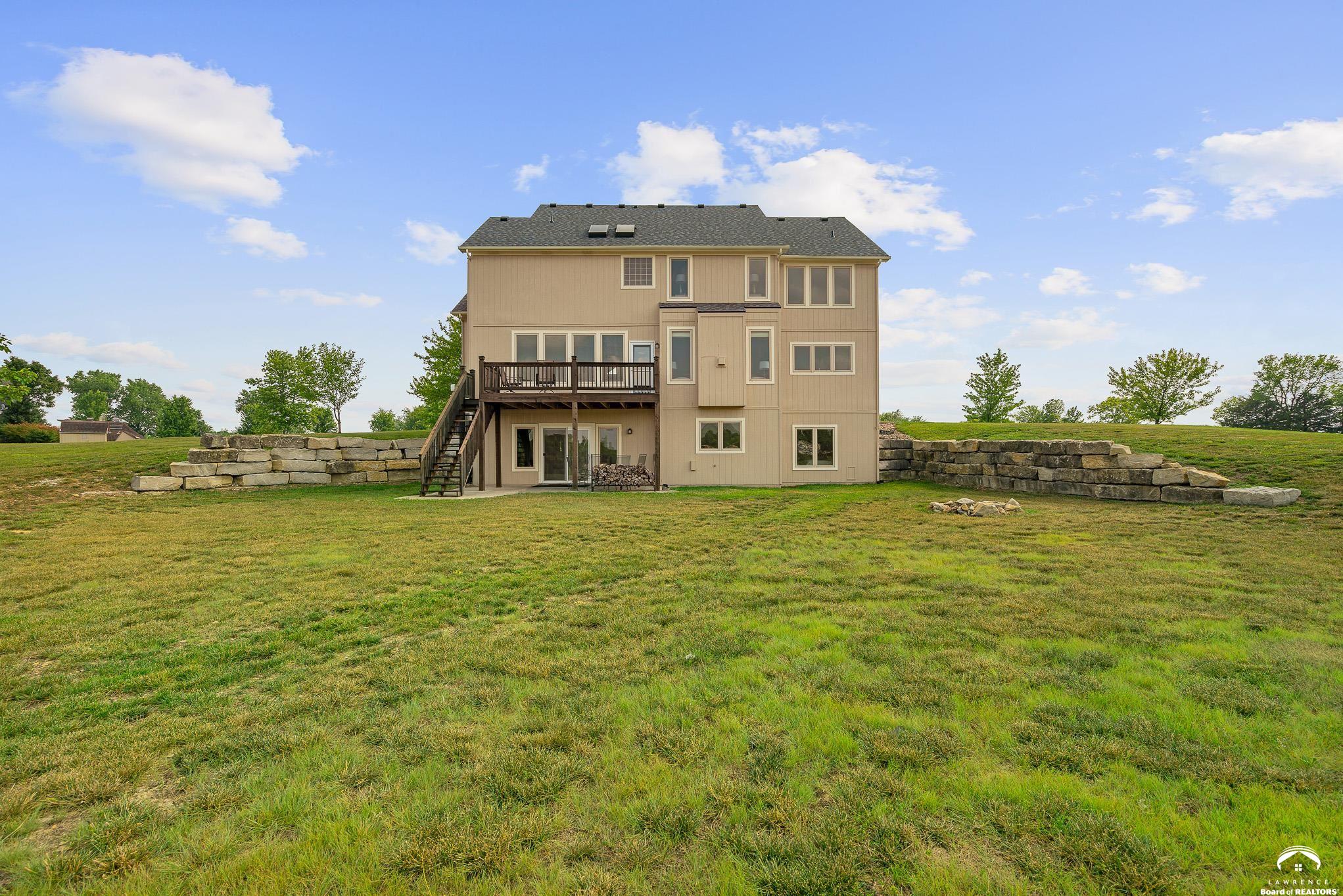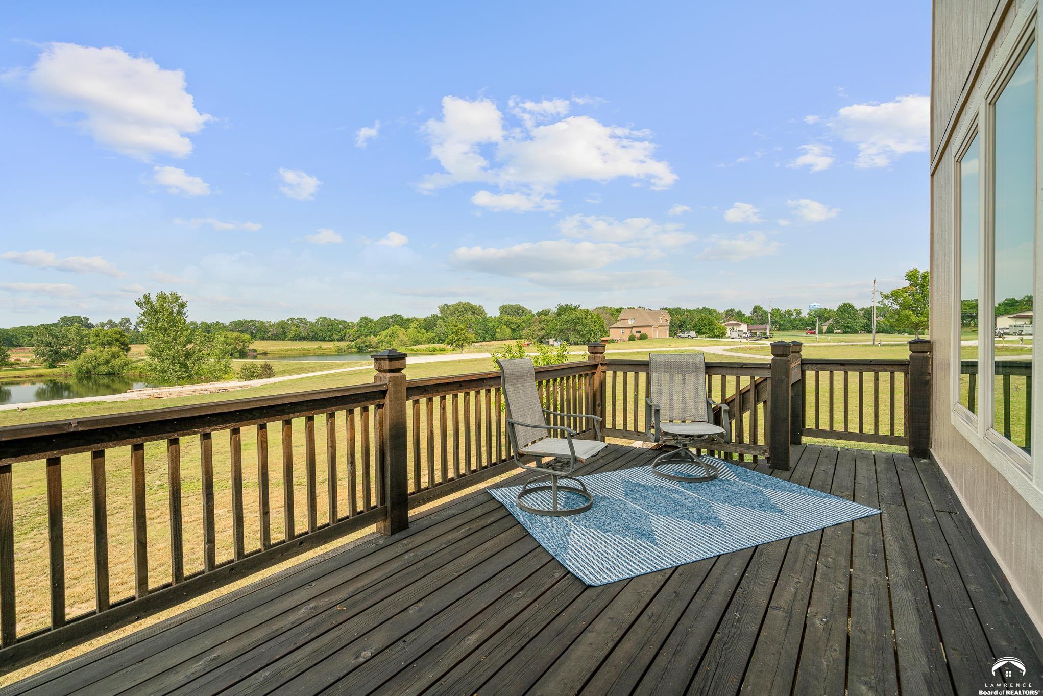 Beautiful two story home positioned perfectly on 4+/- acres overlooking a manicured pond just east of Lawrence! Lovingly maintained with updates throughout including fresh paint, updated carpeting, light fixtures, a new roof, 3 fireplaces, built in bookcases, beautiful primary en-suite. Kitchen has lots of cabinet room and a walk-in pantry. Finished walk-out basement including a family room, bedroom, bathroom and storage. Come and see this beauty today! All taxes and msmts are approx.