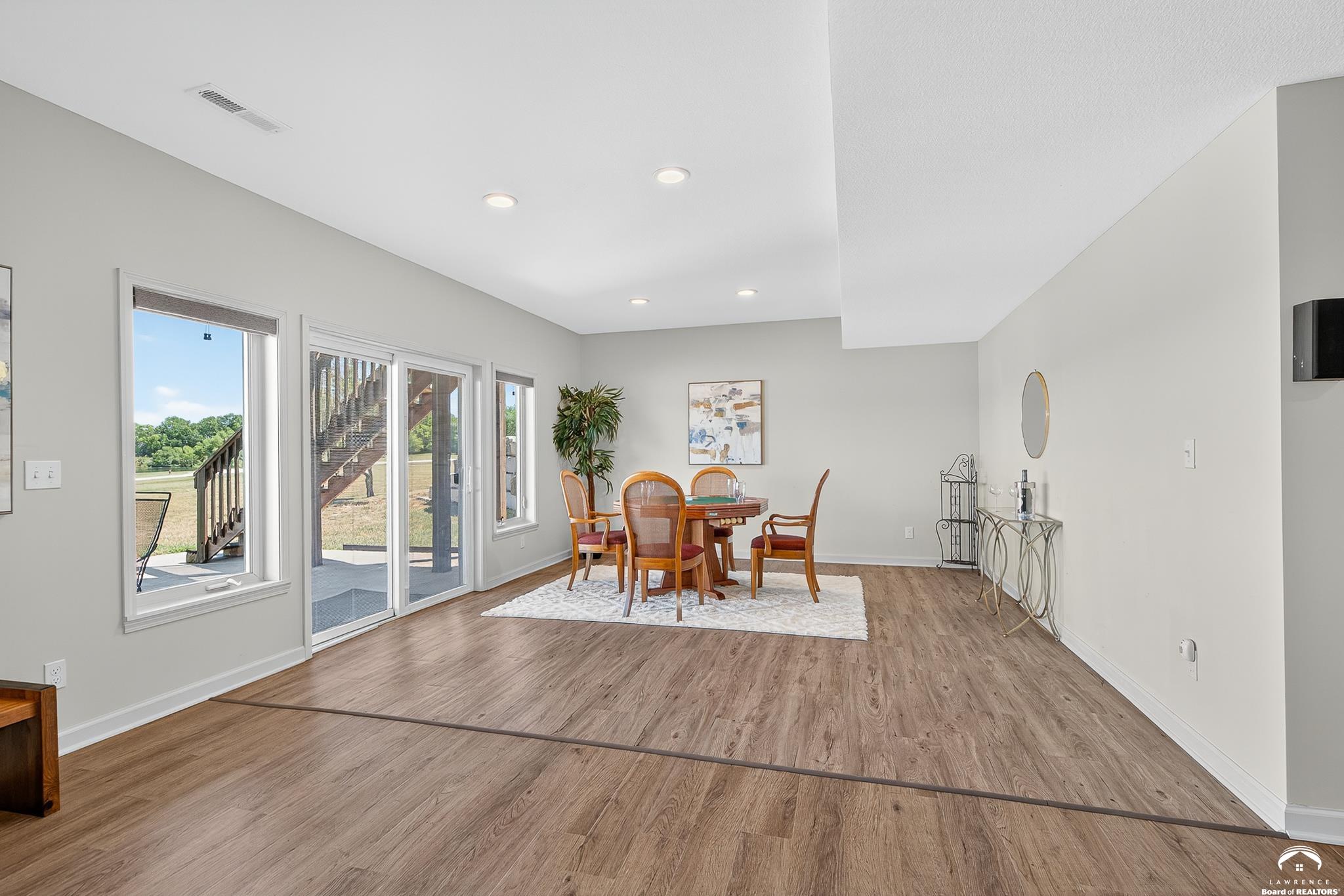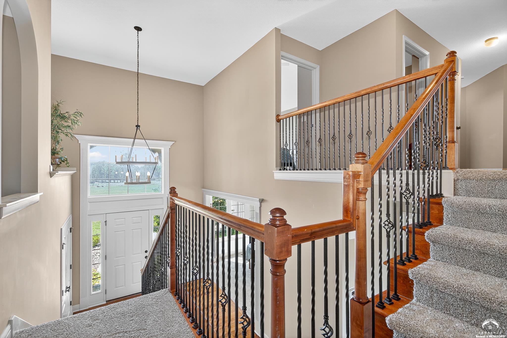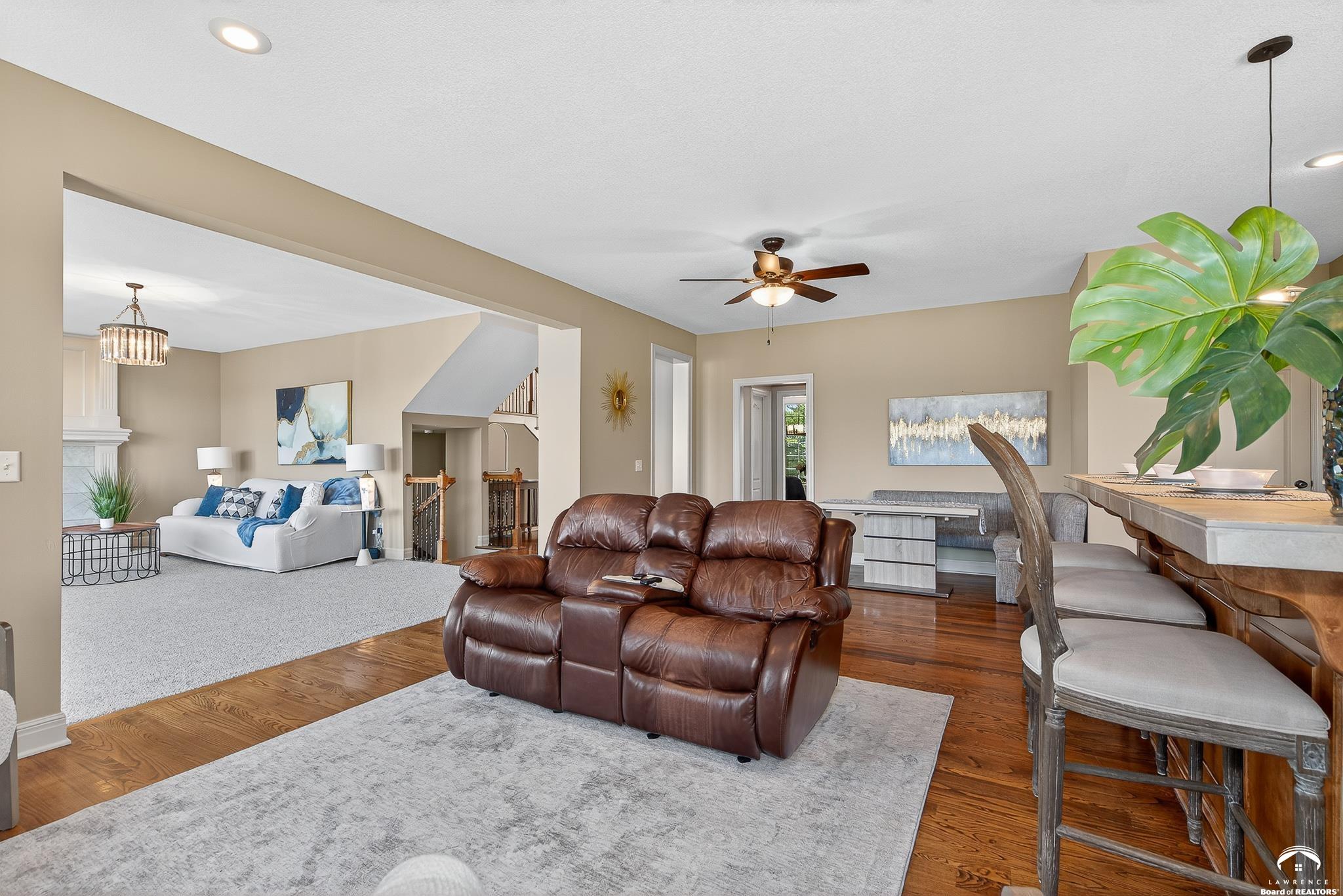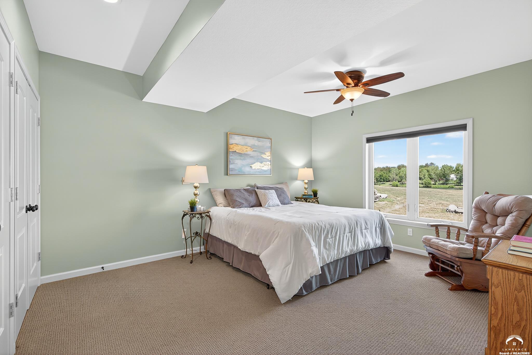Beautiful two story home positioned perfectly on 4+/- acres overlooking a manicured pond just east of Lawrence! Lovingly maintained with updates throughout including fresh paint, updated carpeting, light fixtures, a new roof, 3 fireplaces, built in bookcases, beautiful primary en-suite. Kitchen has lots of cabinet room and a walk-in pantry. Finished walk-out basement including a family room, bedroom, bathroom and storage. Come and see this beauty today! All taxes and msmts are approx.