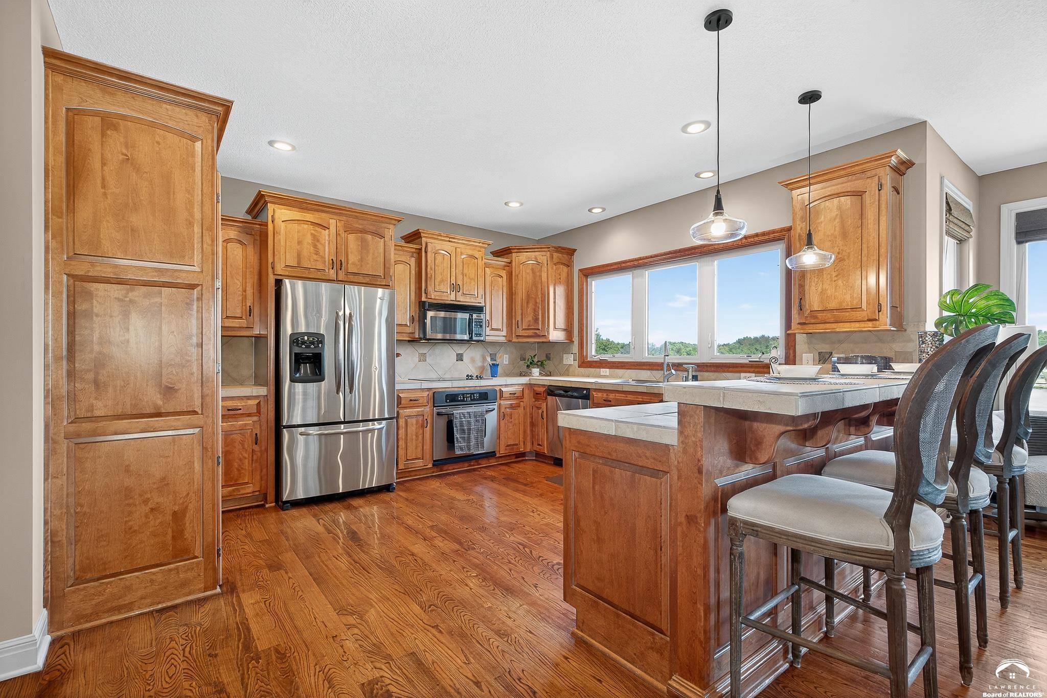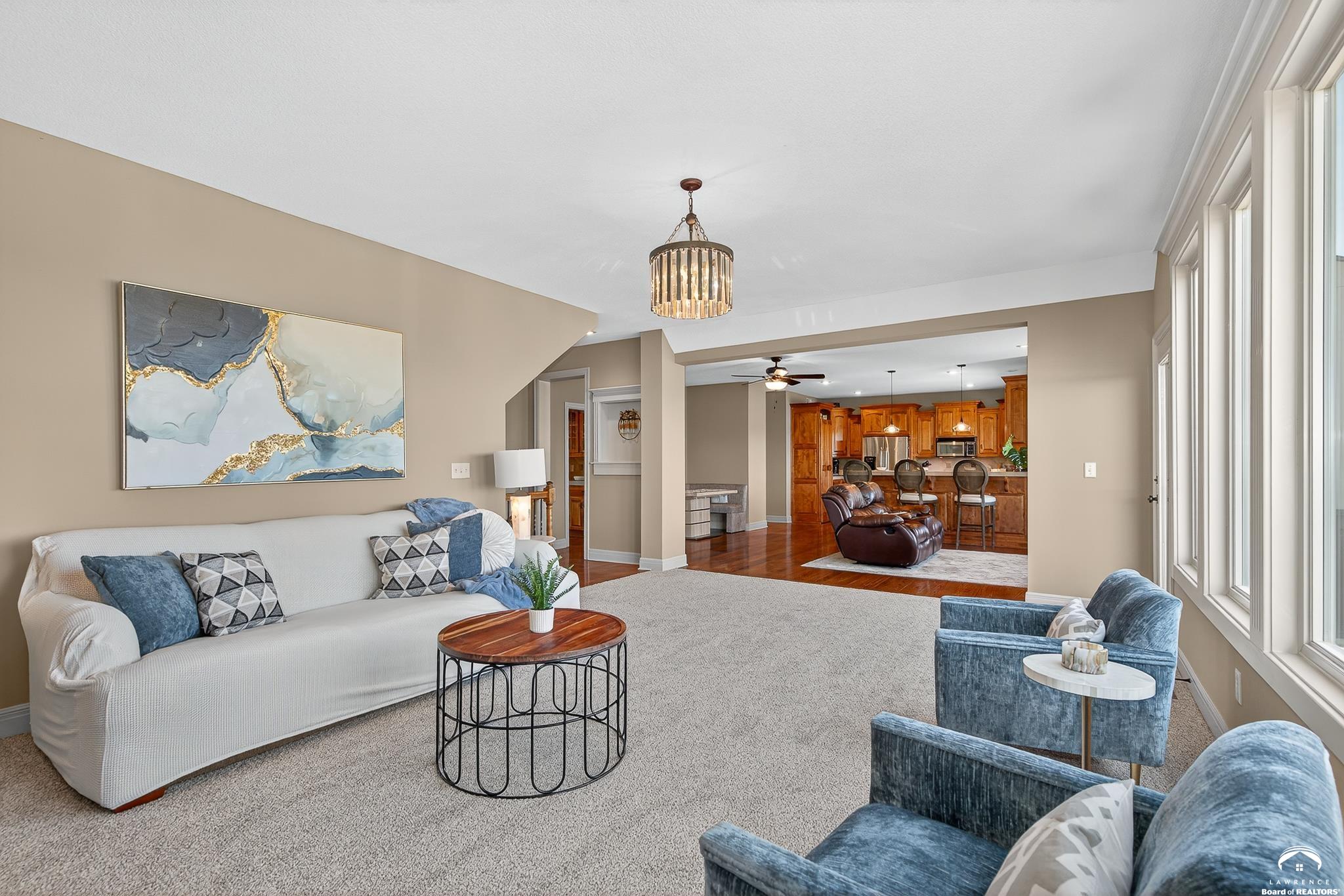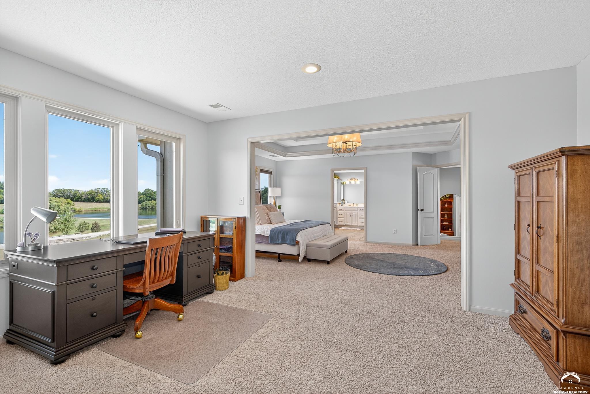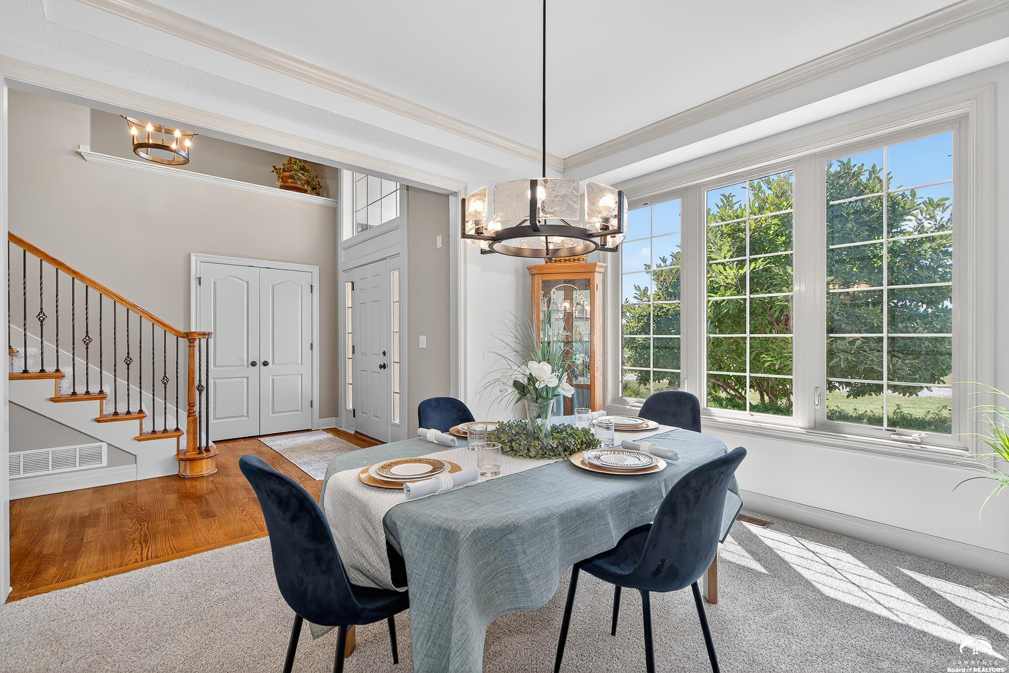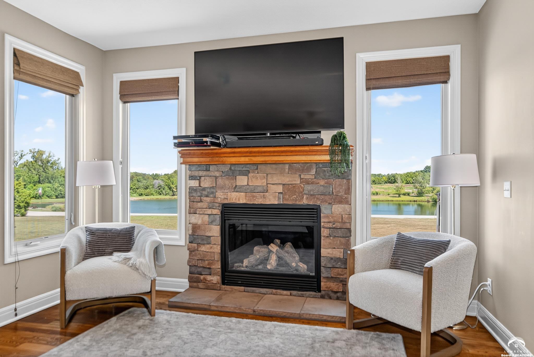 Beautiful two story home positioned perfectly on 4+/- acres overlooking a manicured pond just east of Lawrence! Lovingly maintained with updates throughout including fresh paint, updated carpeting, light fixtures, a new roof, 3 fireplaces, built in bookcases, beautiful primary en-suite. Kitchen has lots of cabinet room and a walk-in pantry. Finished walk-out basement including a family room, bedroom, bathroom and storage. Come and see this beauty today! All taxes and msmts are approx.