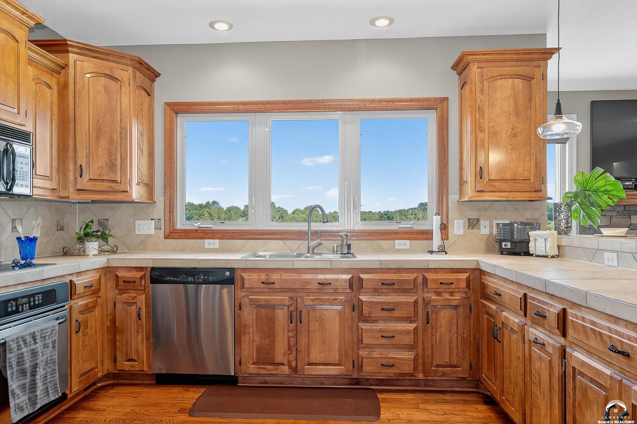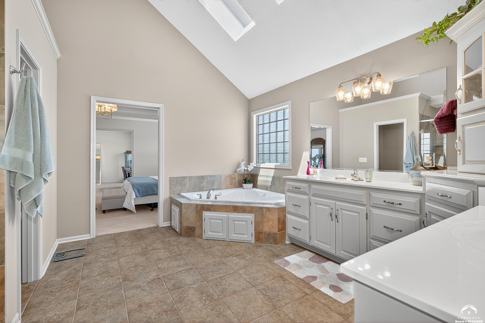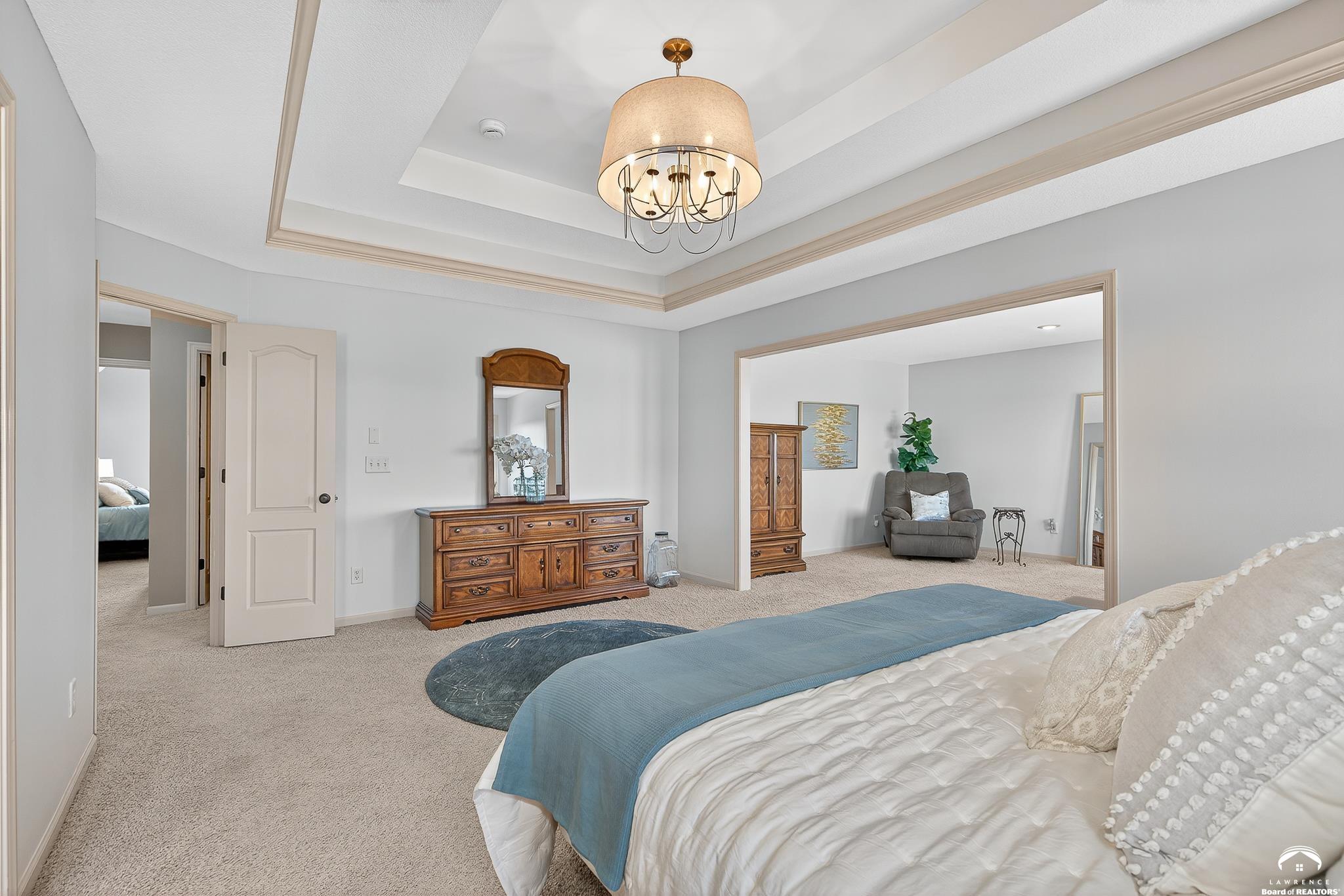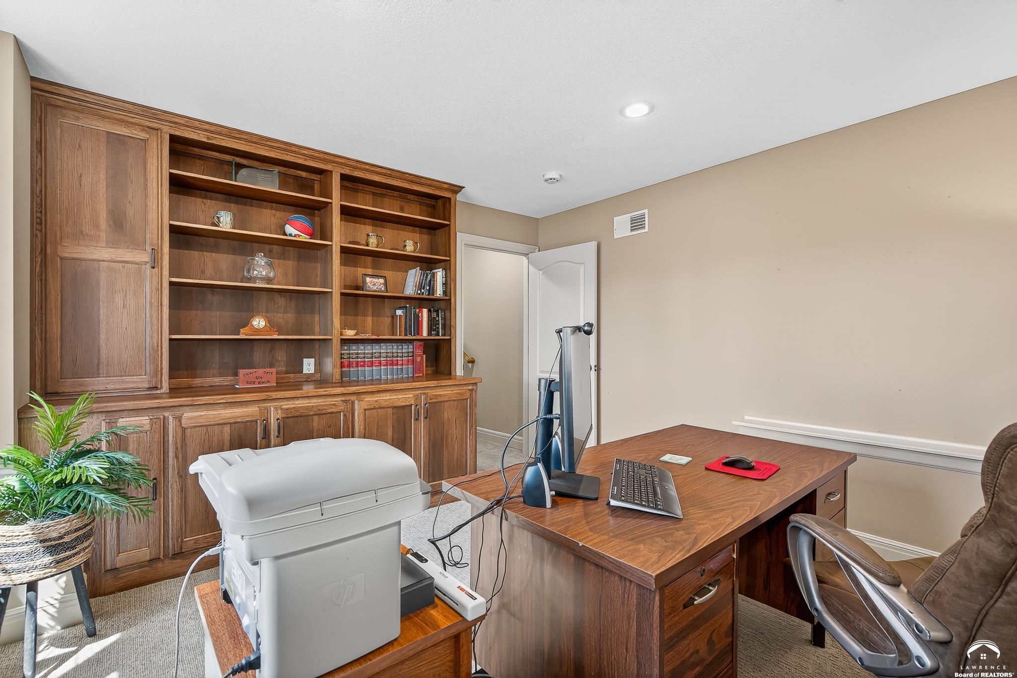 Beautiful two story home positioned perfectly on 4+/- acres overlooking a manicured pond just east of Lawrence! Lovingly maintained with updates throughout including fresh paint, updated carpeting, light fixtures, a new roof, 3 fireplaces, built in bookcases, beautiful primary en-suite. Kitchen has lots of cabinet room and a walk-in pantry. Finished walk-out basement including a family room, bedroom, bathroom and storage. Come and see this beauty today! All taxes and msmts are approx.