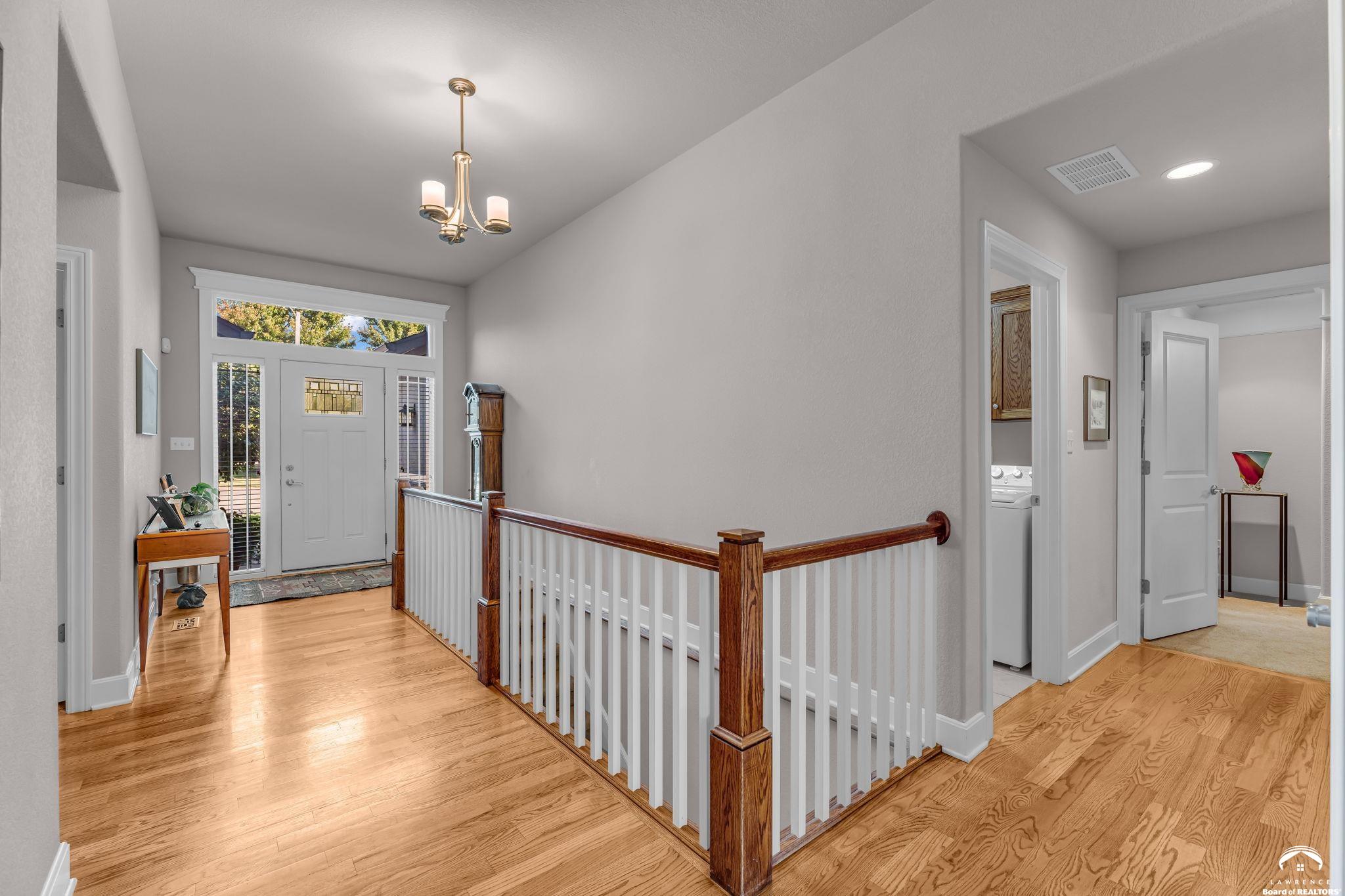 Welcome to this gorgeous 5 Bedroom/3 bath/3 car garage home with main level living at its finest in the Langston Hughes school neighborhood. This beautifully maintained one owner home has been meticulously maintained and offers 3 spacious bedrooms and 2 full baths on the first floor plus finished walk out basement. With gorgeous curb appeal, high ceilings and an open concept layout, this home is full of character and thoughtfully designed for modern living. The bright and airy kitchen opens to a generous dining area and living room, creating the perfect space for entertaining or everyday comfort. Enjoy the covered deck off kitchen overlooking backyard & nature trail w/mature trees and fabulous landscaping. Privacy + a serene setting showcases this peaceful view & opportunity. The walk out basement adds versatility, featuring a large family room, wet bar, two additional bedrooms and a full bath, ideal for guests, a home office, or for multi-generational living. Bonus large storage room adds extra benefits for great storage or a workshop. Don't miss this opportunity for comfort, space and privacy in a fantastic location.