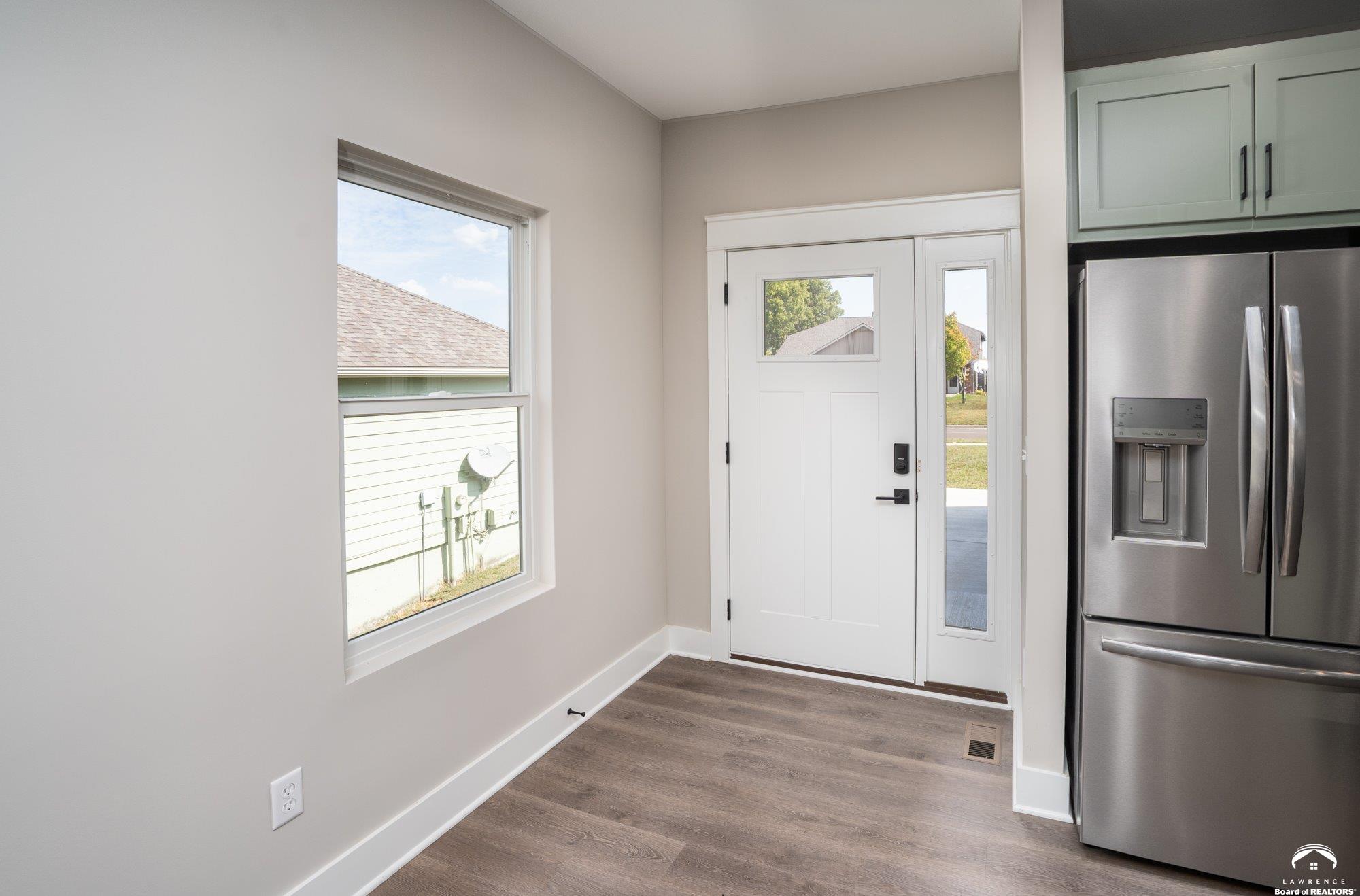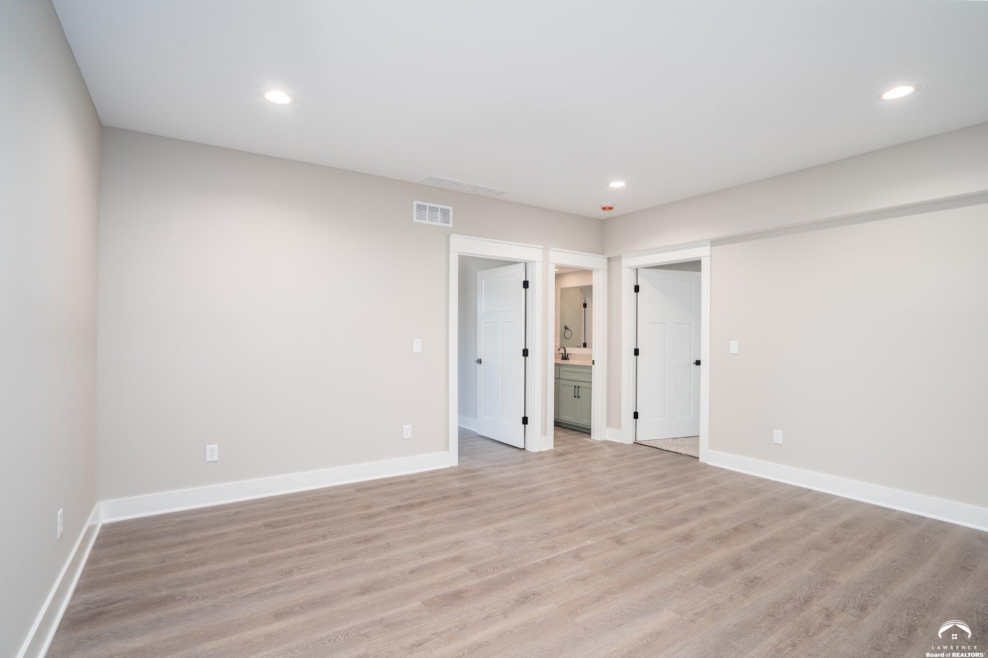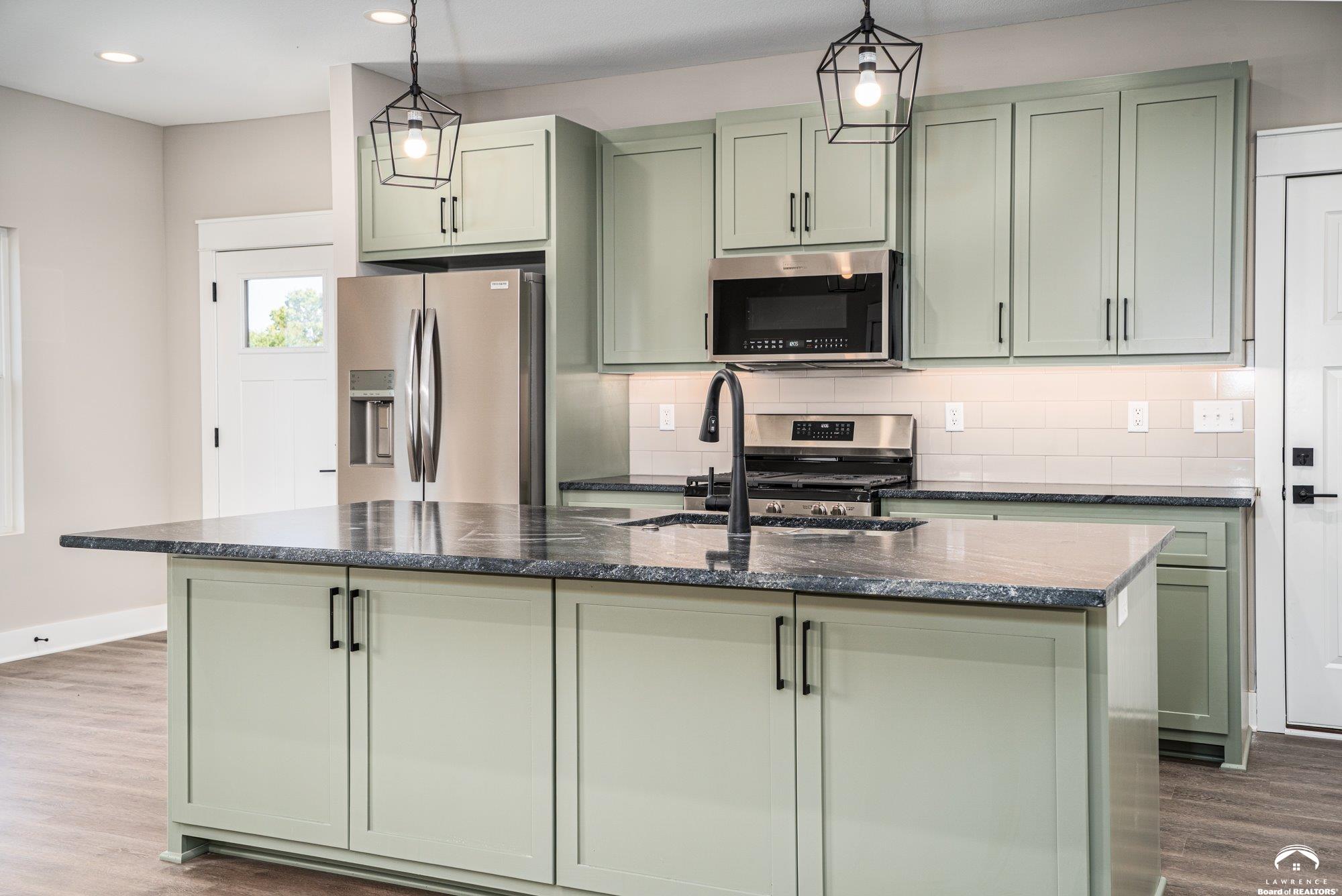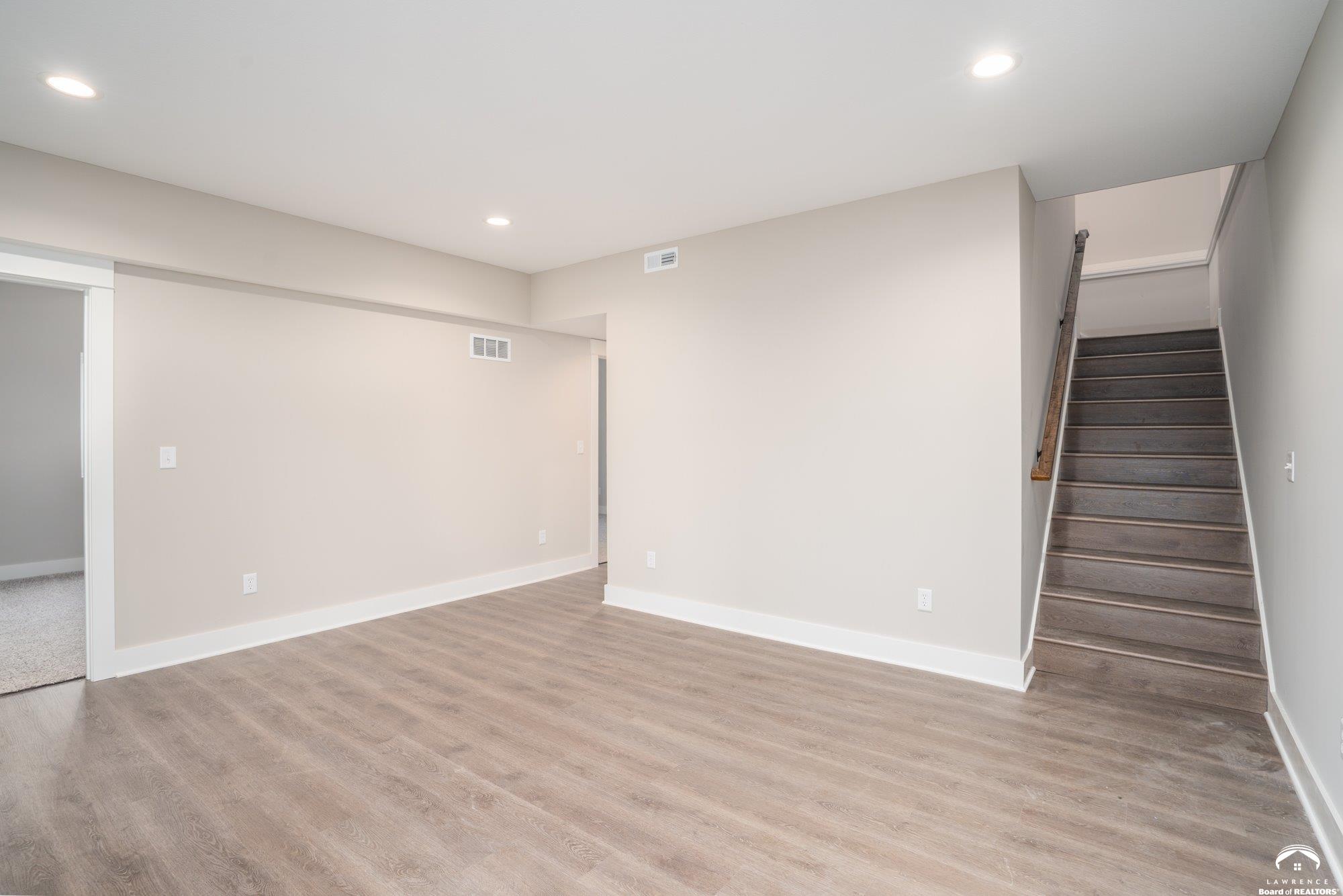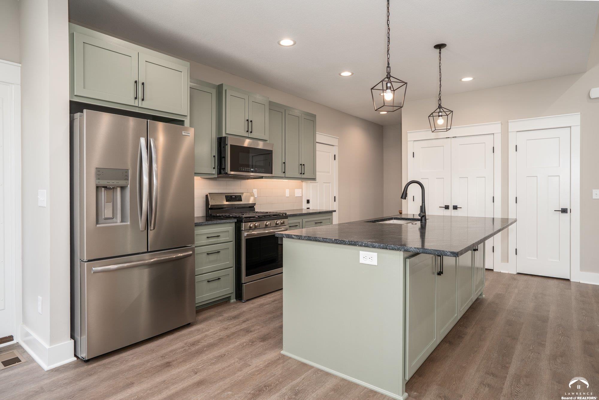 New construction townhome with main-level primary bedroom including double closets. The stylish kitchen is designed to be highly functional, with quartz countertops, a gas range, soft-close cabinets and drawers, and a large pantry. Storage is plentiful throughout this home. The main level bath offers a spacious, beautiful onyx shower. Downstairs, three additional bedrooms share a full bath. There's also extra living space and a spacious laundry room in the walkout basement. One of the downstairs bedrooms opens directly to a patio, providing a private spot to relax or enjoy the outdoors. LVP flooring runs through the main living areas, giving the home a modern look and durability. The neighborhood is just north of town, offering a quieter setting while keeping Highway 56, Gardner, and Lawrence within easy reach. Homeowners can also take advantage of a 5-year tax abatement by submitting proof of tax payment with the city each year to qualify for the rebate.