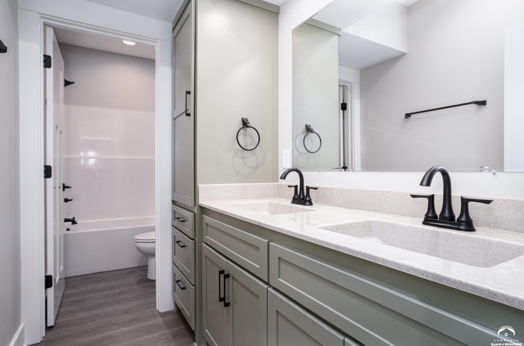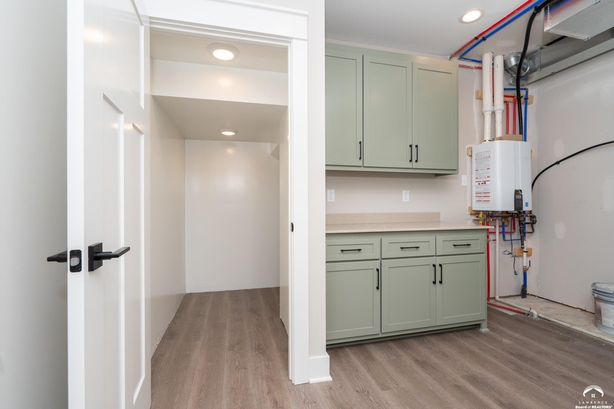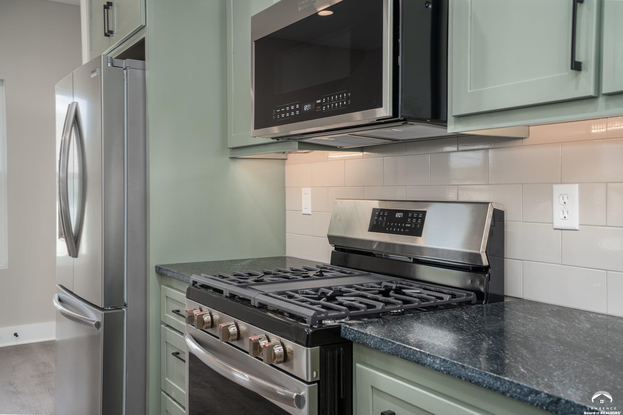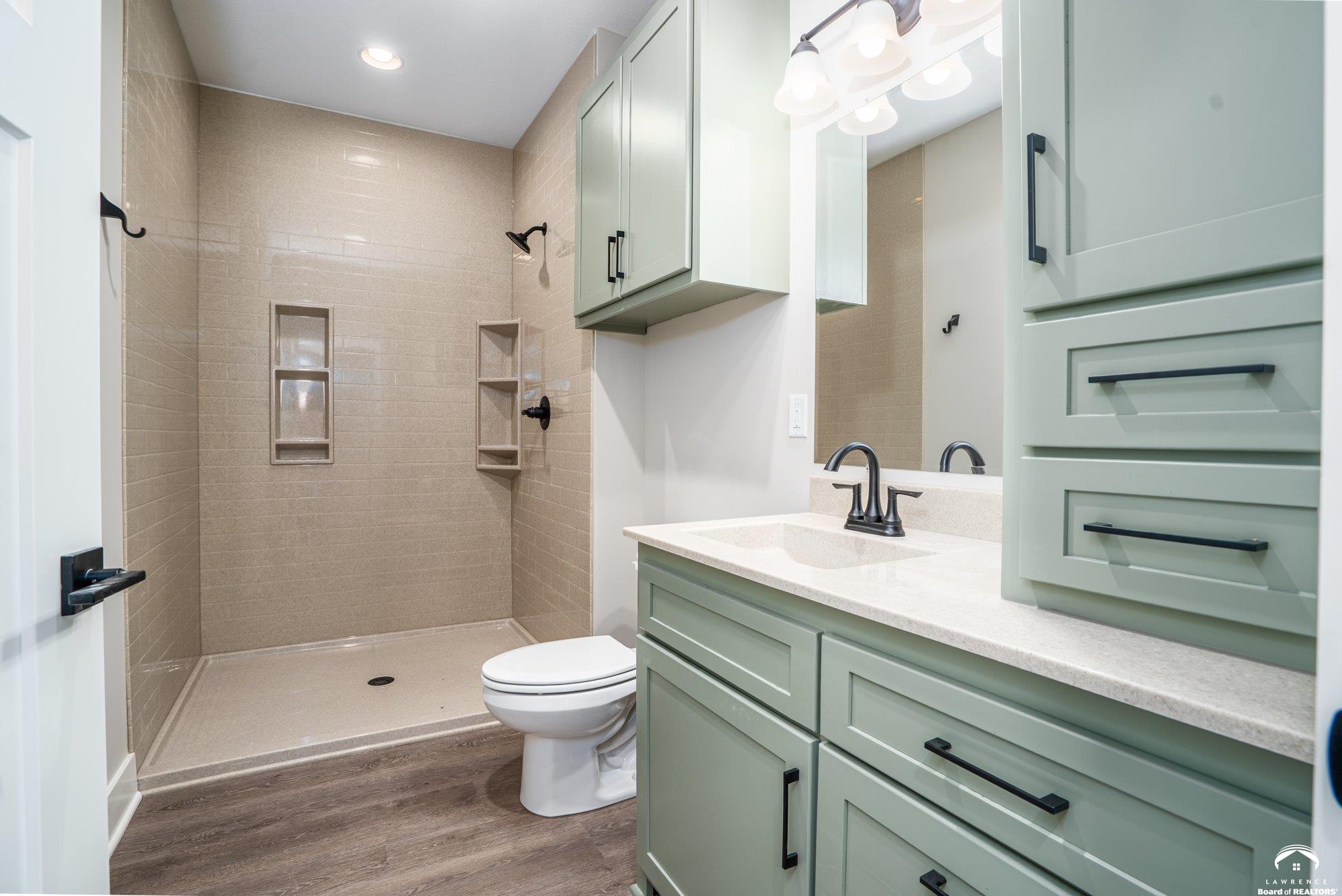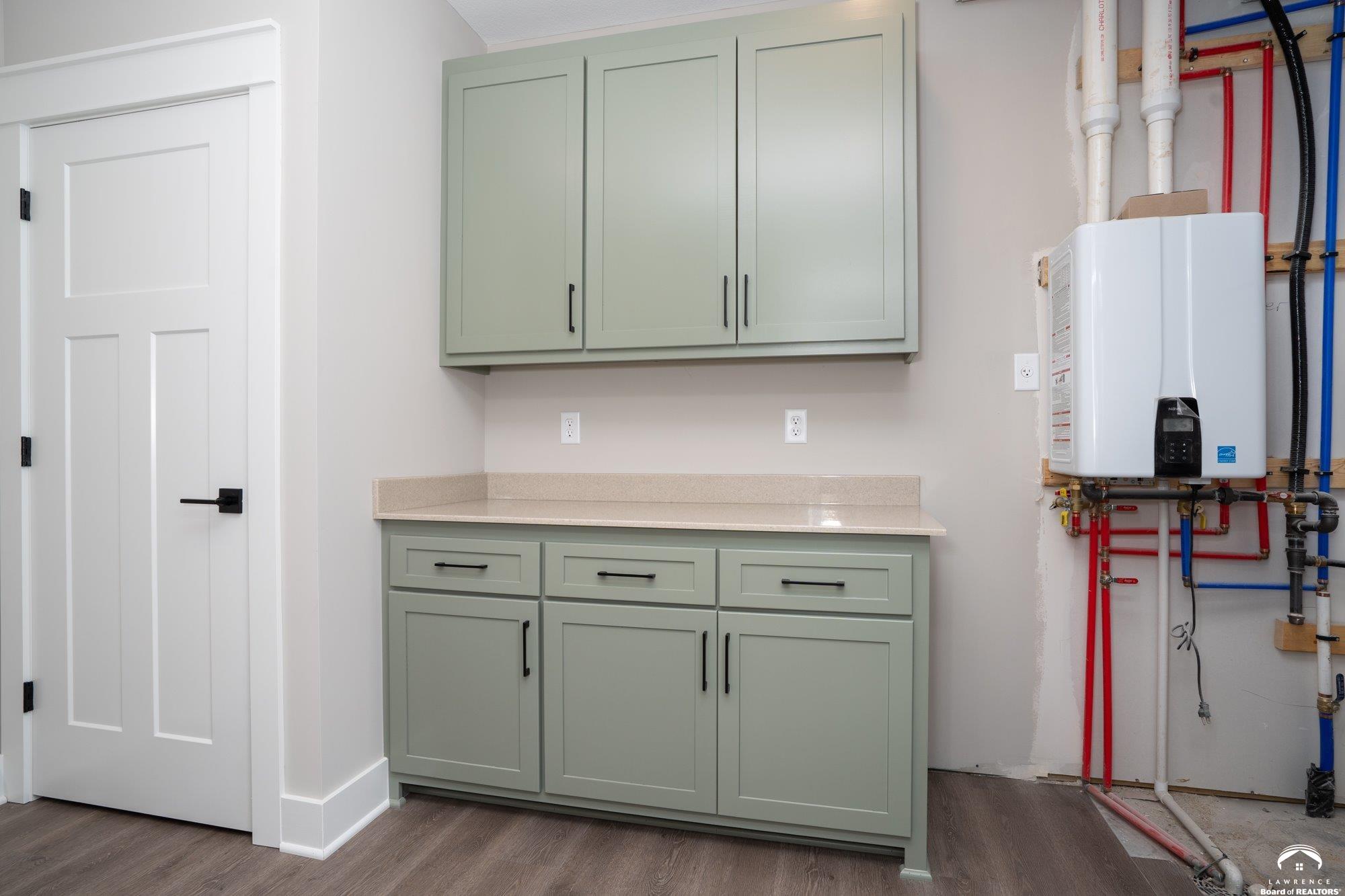 New construction townhome with main-level primary bedroom including double closets. The stylish kitchen is designed to be highly functional, with quartz countertops, a gas range, soft-close cabinets and drawers, and a large pantry. Storage is plentiful throughout this home. The main level bath offers a spacious, beautiful onyx shower. Downstairs, three additional bedrooms share a full bath. There's also extra living space and a spacious laundry room in the walkout basement. One of the downstairs bedrooms opens directly to a patio, providing a private spot to relax or enjoy the outdoors. LVP flooring runs through the main living areas, giving the home a modern look and durability. The neighborhood is just north of town, offering a quieter setting while keeping Highway 56, Gardner, and Lawrence within easy reach. Homeowners can also take advantage of a 5-year tax abatement by submitting proof of tax payment with the city each year to qualify for the rebate.