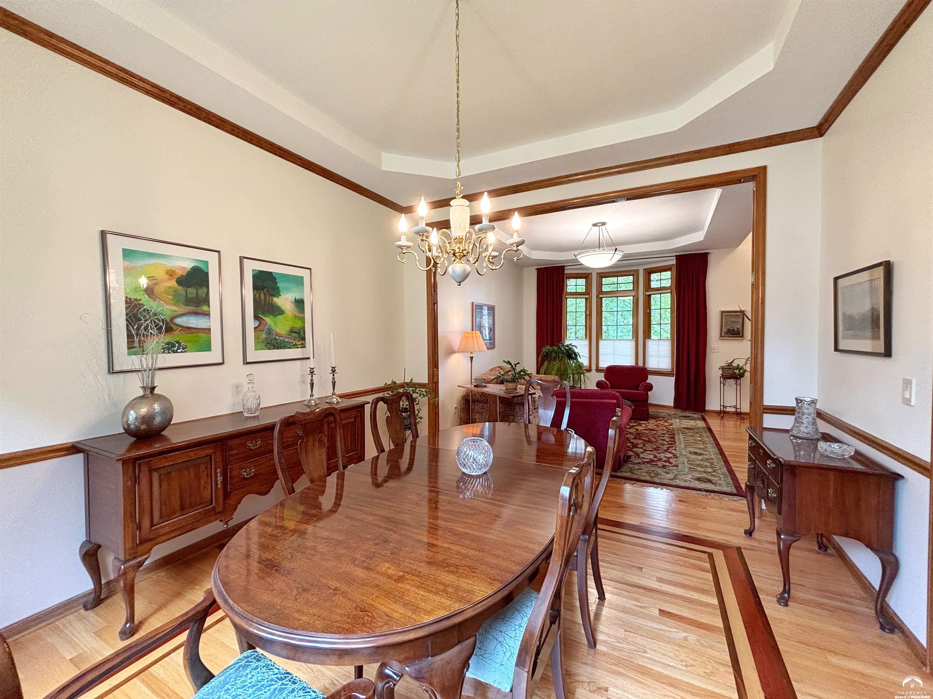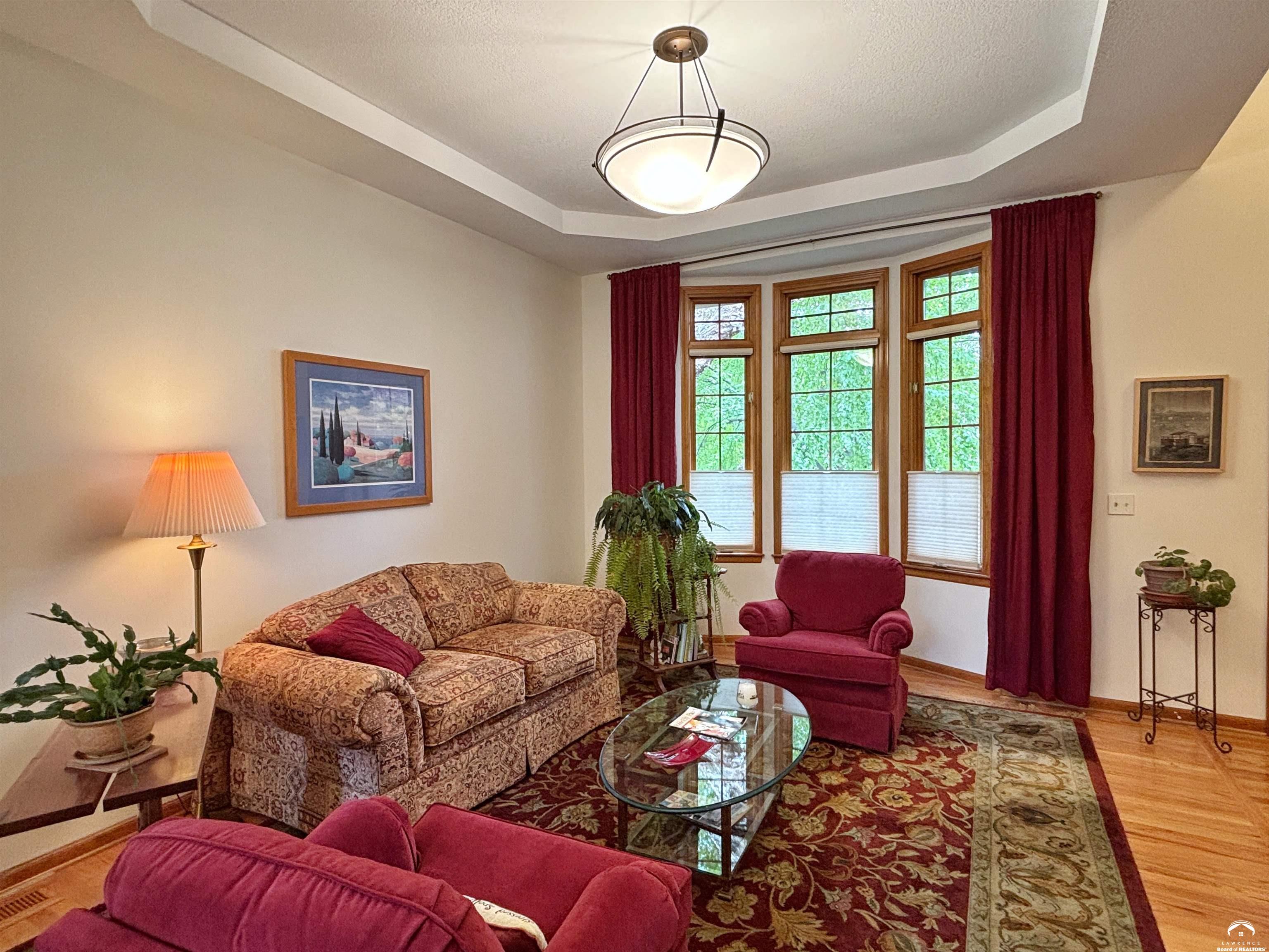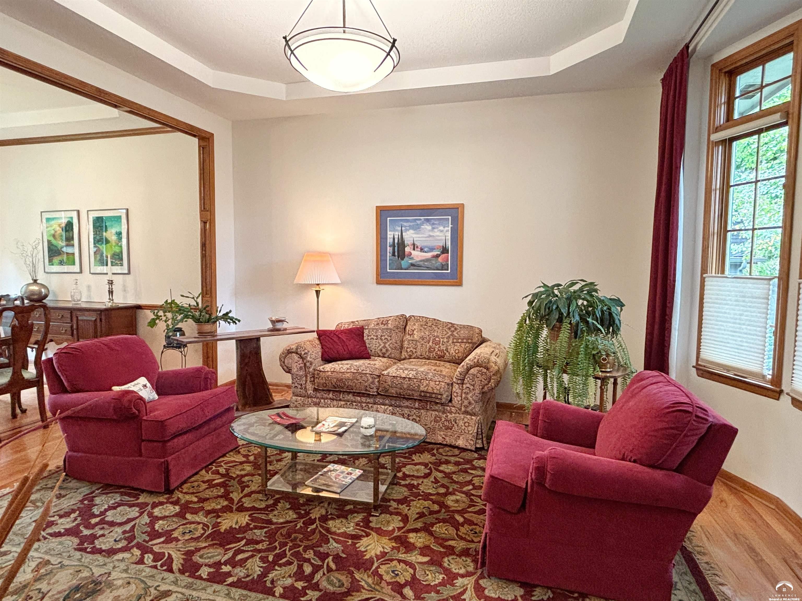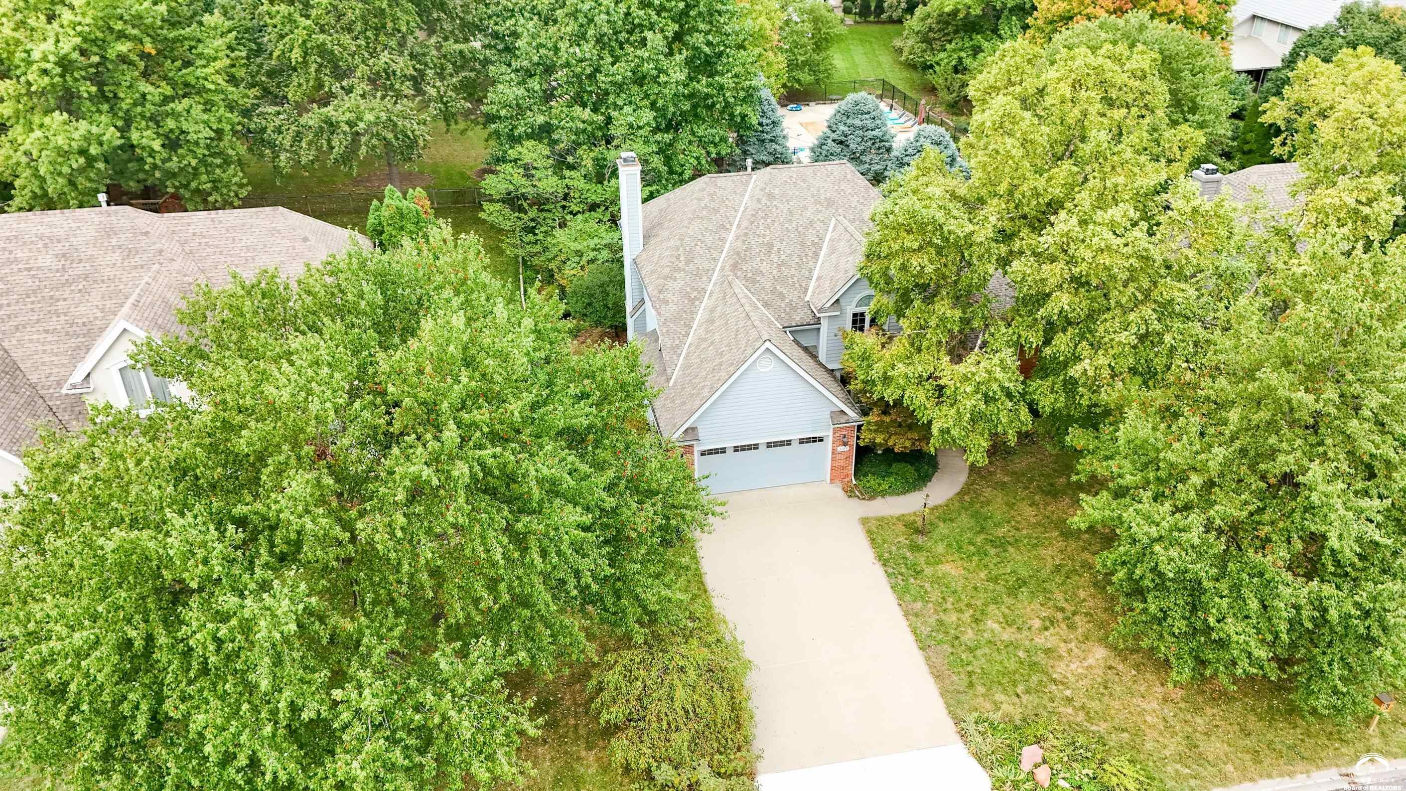 Gorgeous Home on a Grand, Tree-Lined Street in Alvamar West! Nestled among mature trees and surrounded by lush, detailed landscaping, this 4-bedroom home offers both timeless charm and modern updates in one of west Lawrence’s most sought-after neighborhoods and on one of the neighborhood's prettiest streets. Inside, you'll find a spacious and light-filled layout. The main level features a formal living and dining room with soaring tray ceilings and expansive windows that flood the space with natural light. The updated kitchen offers ample counter space, a convenient eat-in breakfast area, and opens to a cozy family room complete with a fireplace and eye-catching wood beam ceilings, perfect for relaxing or entertaining. Need a quiet space to work? The dedicated office/den offers flexibility for your lifestyle. Updates throughout the home includes wood floors with custom details, modern fixtures, up/down cellular shades. The generous primary suite is a true retreat with a large en suite bathroom featuring updated finishes and a walk-in closet. Three additional bedrooms provide plenty of room for family, guests, or hobbies. Downstairs, the full unfinished basement offers endless potential — finish it out to add value and square footage, or use it as-is for hobbies, workshop space, or storage. Step outside into a backyard that’s a gardener’s dream, brimming with native plants, mature trees, and landscape accents that make this home a standout from every angle. All of this is located close to neighborhood schools, parks, and just minutes from K-10 highway access for easy commuting. Don't miss your chance to own a truly special home in Alvamar West — where nature, space, and style come together beautifully