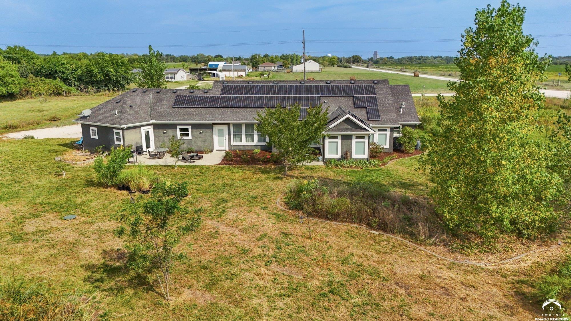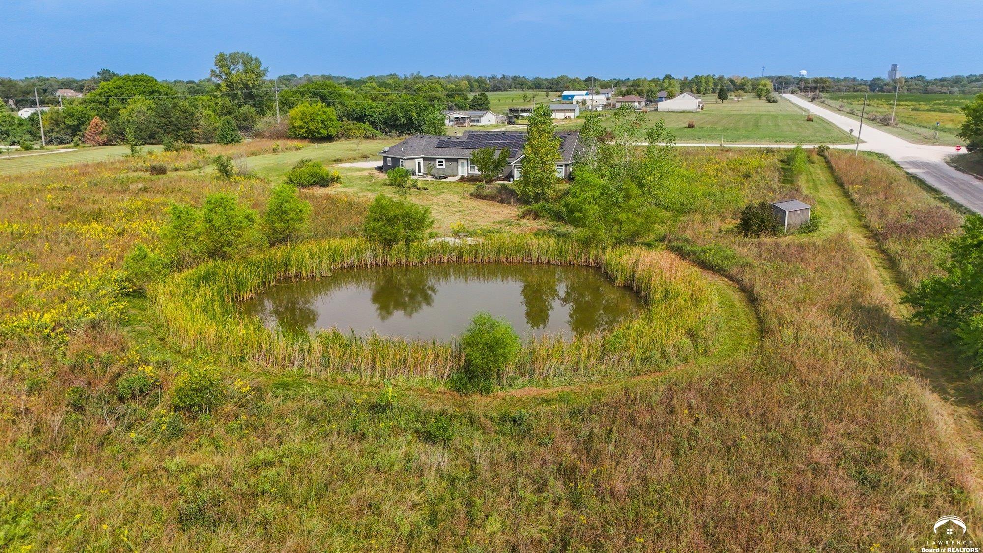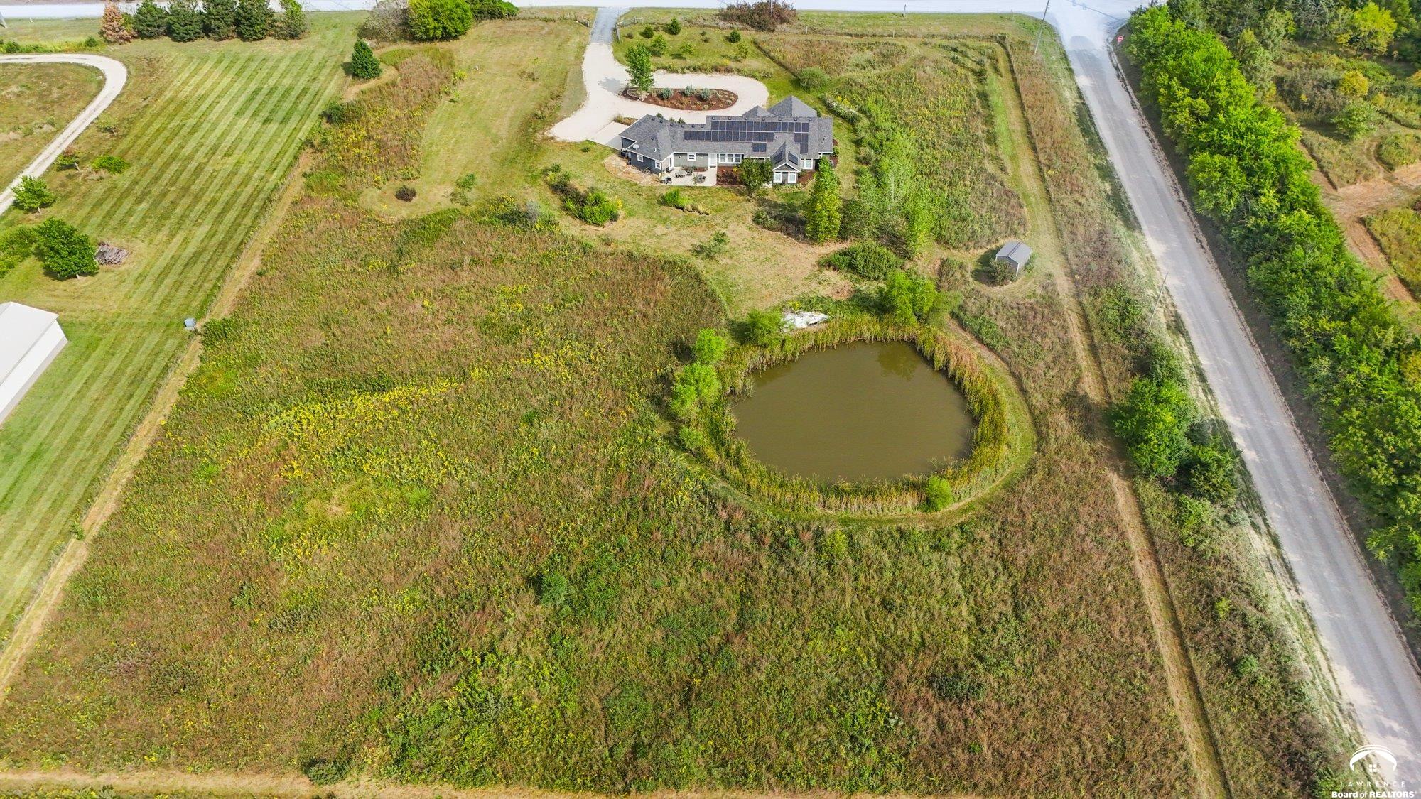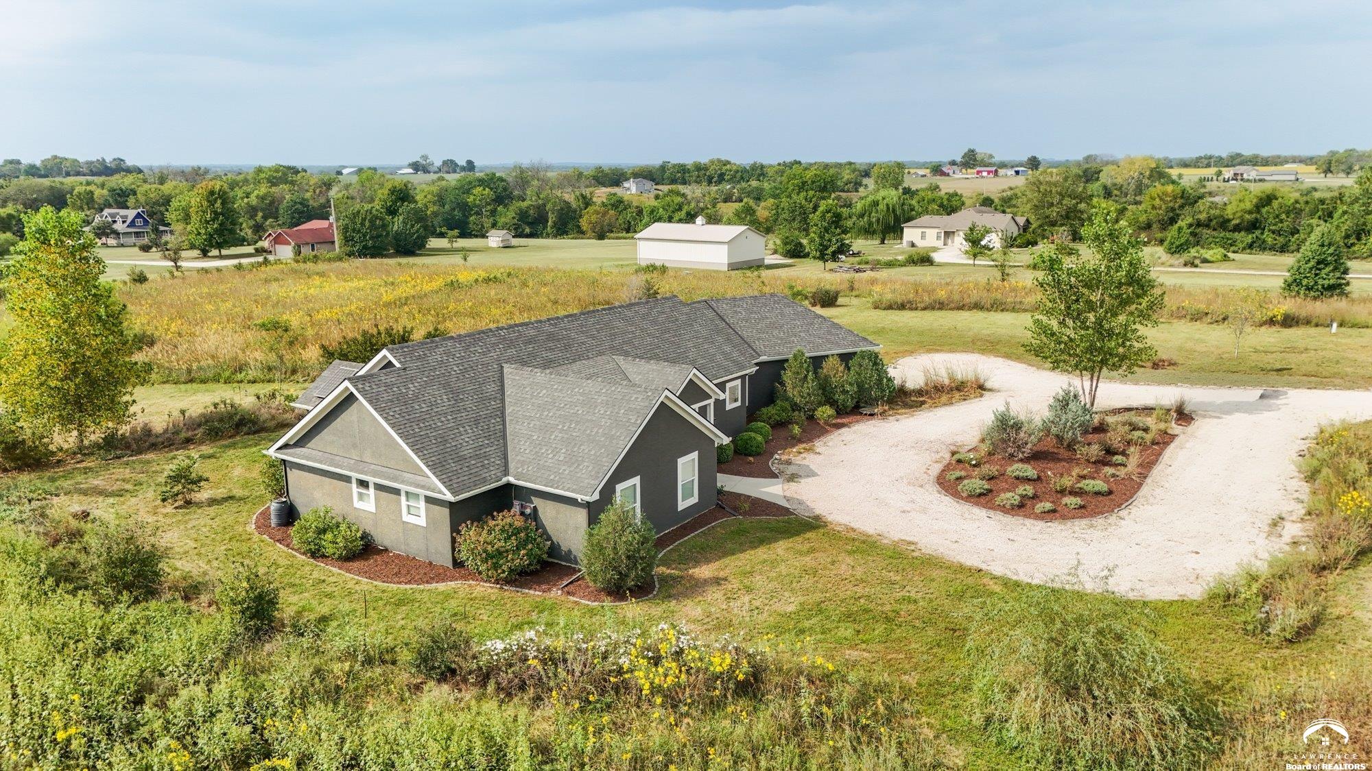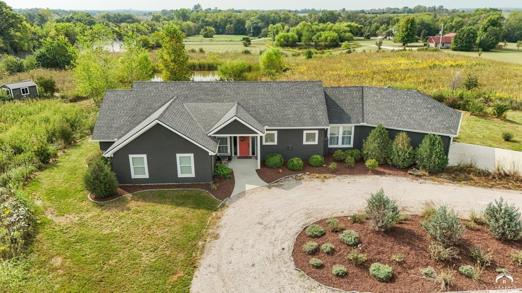 Welcome to Prairie Paradise! An exceptional, custom built, ranch style home with main-level living tucked away on 5 acres of serene countryside. This beautiful home features 4 spacious bedrooms, 2.5 bathrooms, a sunroom, sitting room, plus so much more!! As you step into the entryway, you are greeted with an open floorplan design, surrounded by large picture windows flooded with natural light & exceptional views. The spacious living room showcases a fireplace and beautiful built-ins, as well as an additional gathering space perfect for a piano, added seating, or area to entertain. The dining room, complete with a serving area/coffee bar, opens to the stunning kitchen with beautiful countertops and backsplash, a generous island for culinary space & seating for four, plus a huge walk-in pantry. Retreat to the private primary suite offering both comfort and relaxation, large windows, spacious walk-in closet, and access into the laundry area. Relax in the adjacent sunroom with your morning coffee or in the evening watching nature. Two additional bedrooms share a sitting area, perfect for guests, along with a jack and jill bathroom with hallway access to the 4th bedroom. Let's not forget the generous closet space, garage storm shelter, solar panels, geothermal, and radiant heat flooring. Step outside onto the peaceful back porch perfect for relaxing after a long day, or take a nature walk to the private pond. For those who love to entertain, explore, or retreat to a private & peaceful country lifestyle, this property has it all, while still being within reach of amenities in quaint downtown Baldwin City, and within an easy commute to KC, Lawrence, Ottawa, KC and surrounding.