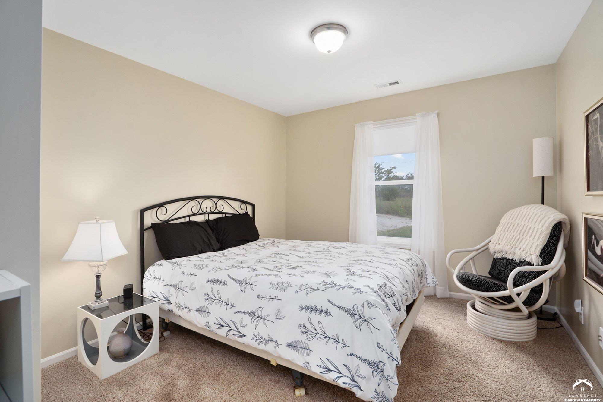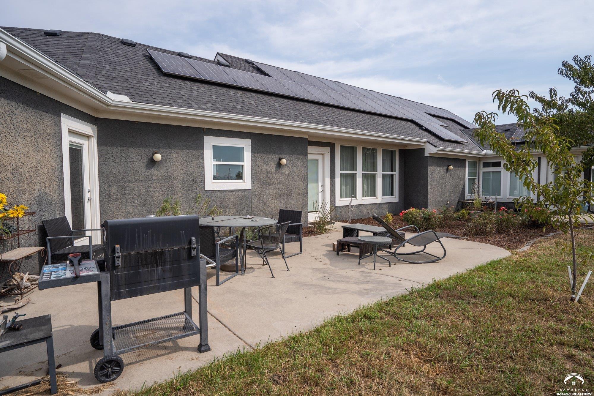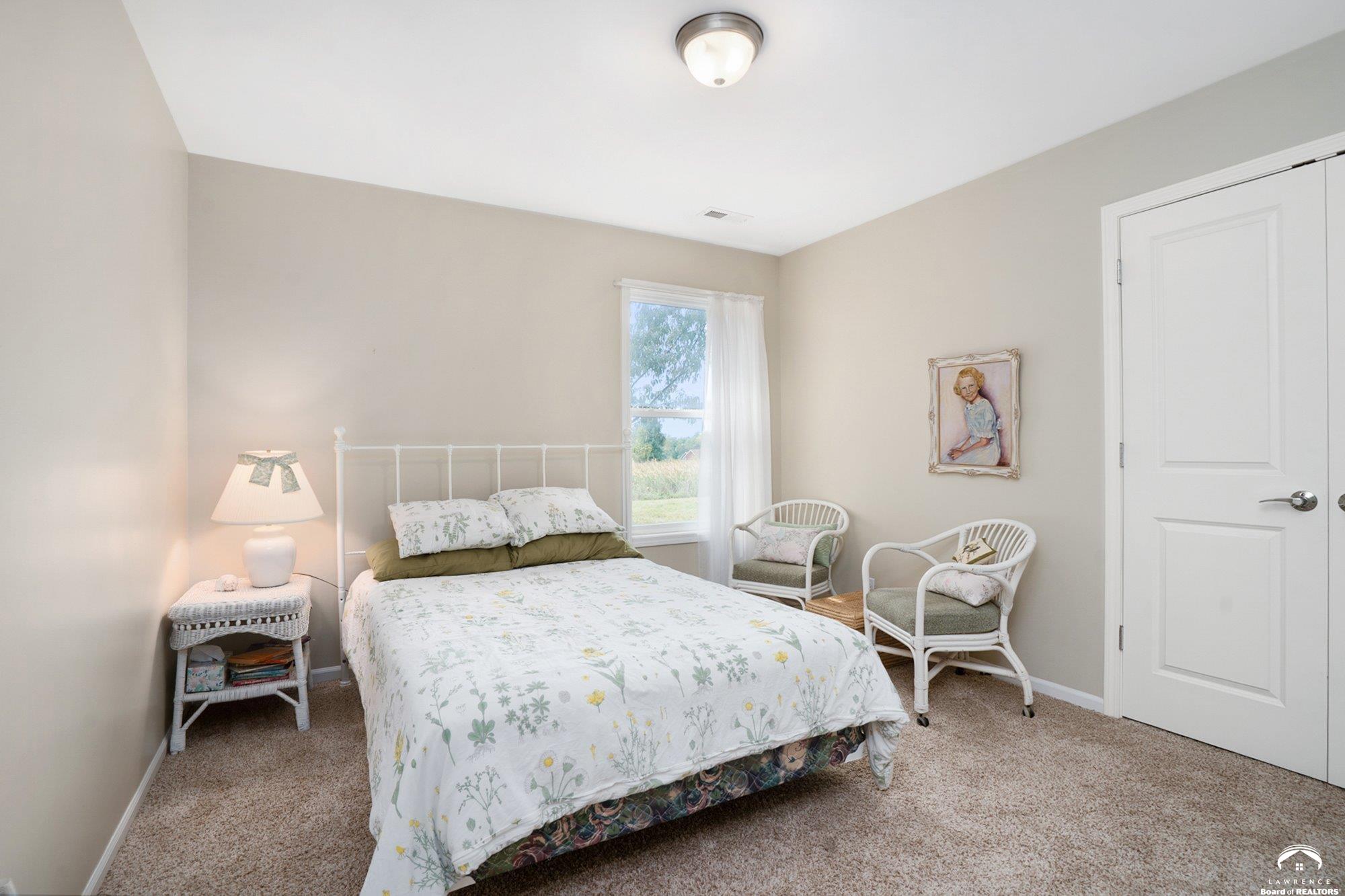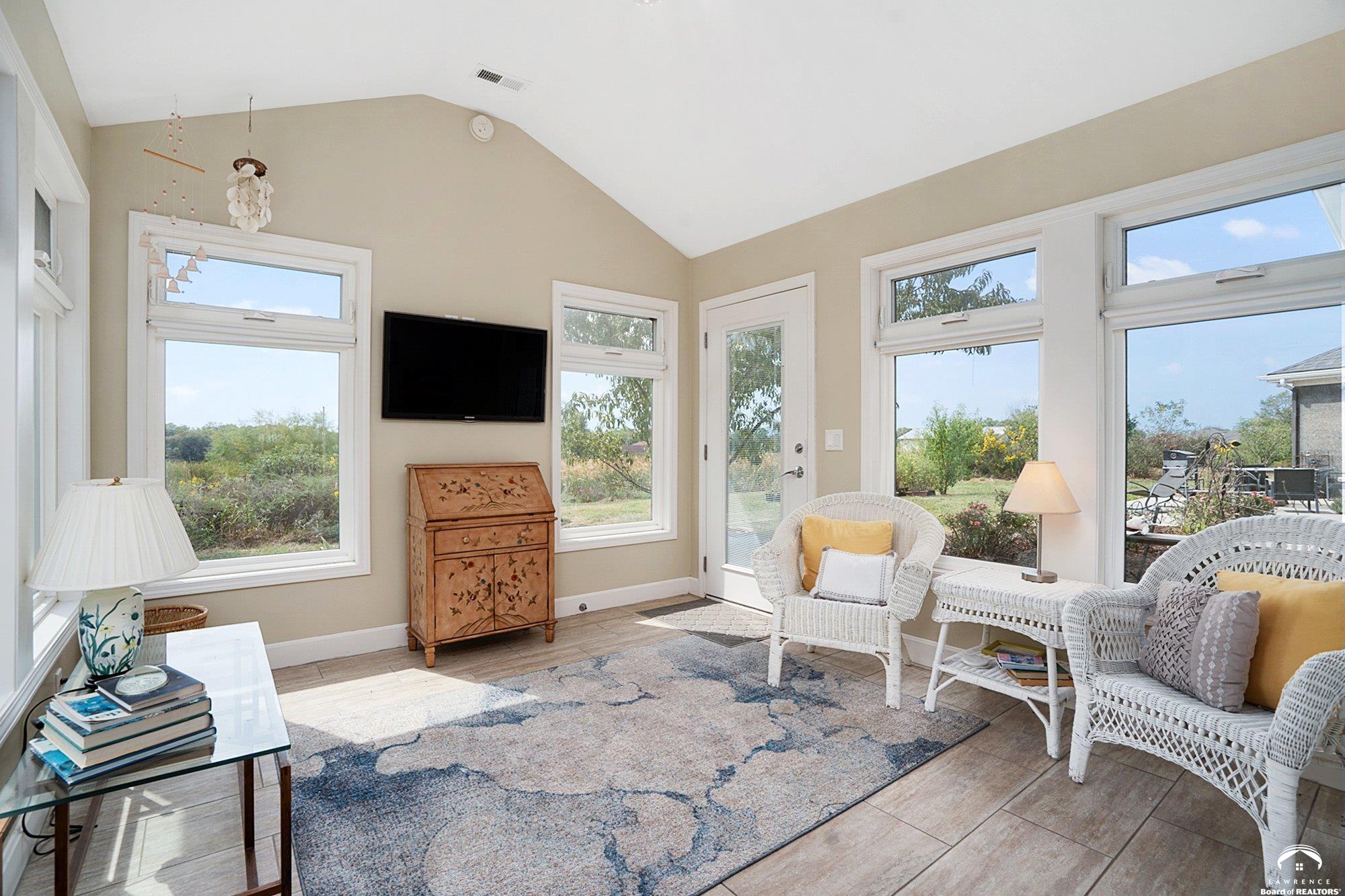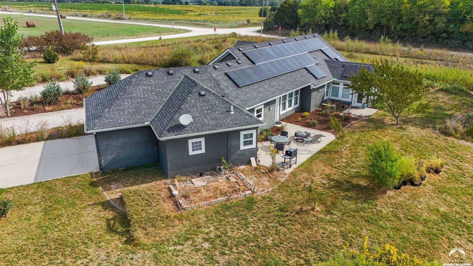 Welcome to Prairie Paradise! An exceptional, custom built, ranch style home with main-level living tucked away on 5 acres of serene countryside. This beautiful home features 4 spacious bedrooms, 2.5 bathrooms, a sunroom, sitting room, plus so much more!! As you step into the entryway, you are greeted with an open floorplan design, surrounded by large picture windows flooded with natural light & exceptional views. The spacious living room showcases a fireplace and beautiful built-ins, as well as an additional gathering space perfect for a piano, added seating, or area to entertain. The dining room, complete with a serving area/coffee bar, opens to the stunning kitchen with beautiful countertops and backsplash, a generous island for culinary space & seating for four, plus a huge walk-in pantry. Retreat to the private primary suite offering both comfort and relaxation, large windows, spacious walk-in closet, and access into the laundry area. Relax in the adjacent sunroom with your morning coffee or in the evening watching nature. Two additional bedrooms share a sitting area, perfect for guests, along with a jack and jill bathroom with hallway access to the 4th bedroom. Let's not forget the generous closet space, garage storm shelter, solar panels, geothermal, and radiant heat flooring. Step outside onto the peaceful back porch perfect for relaxing after a long day, or take a nature walk to the private pond. For those who love to entertain, explore, or retreat to a private & peaceful country lifestyle, this property has it all, while still being within reach of amenities in quaint downtown Baldwin City, and within an easy commute to KC, Lawrence, Ottawa, KC and surrounding.