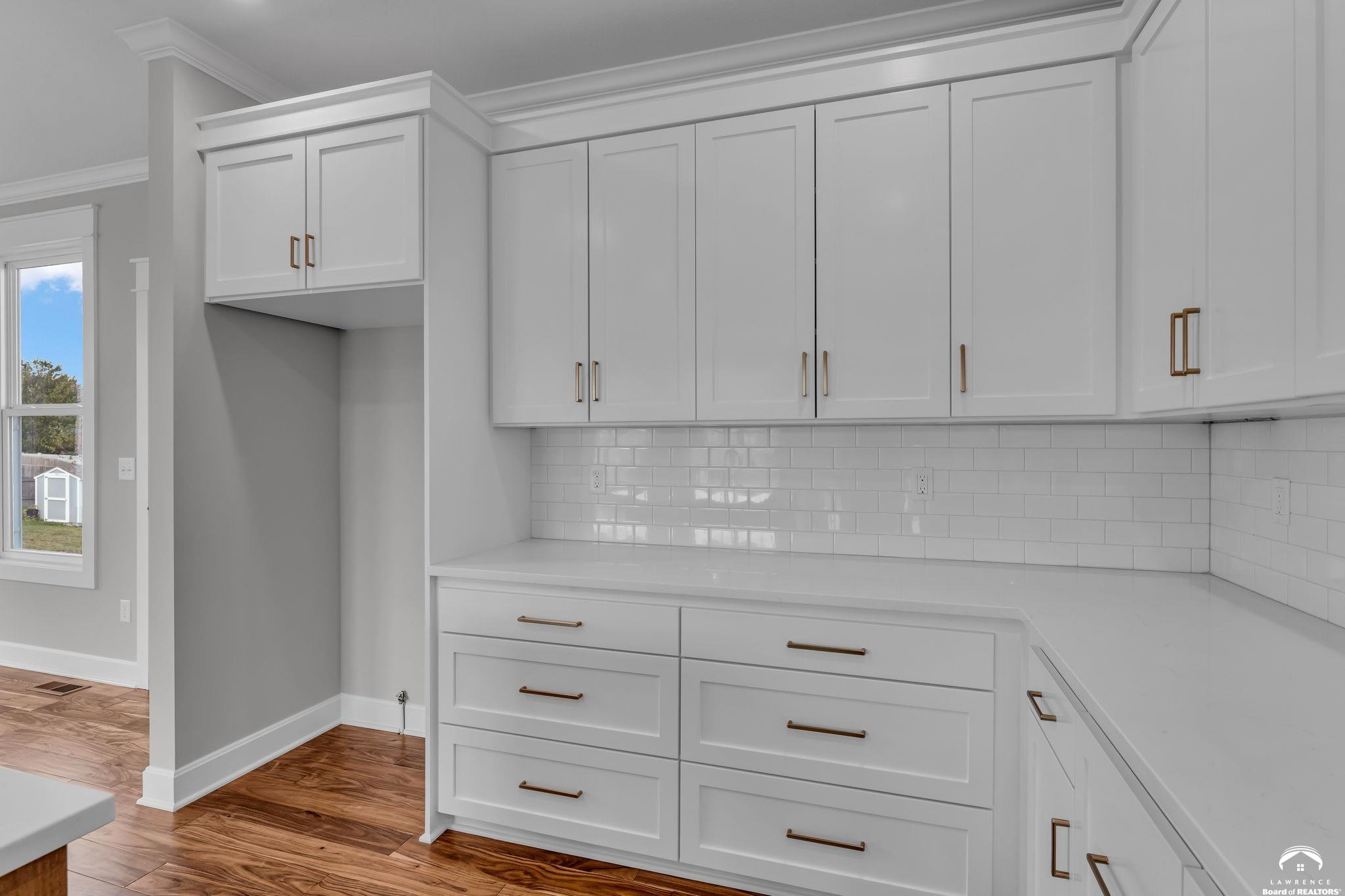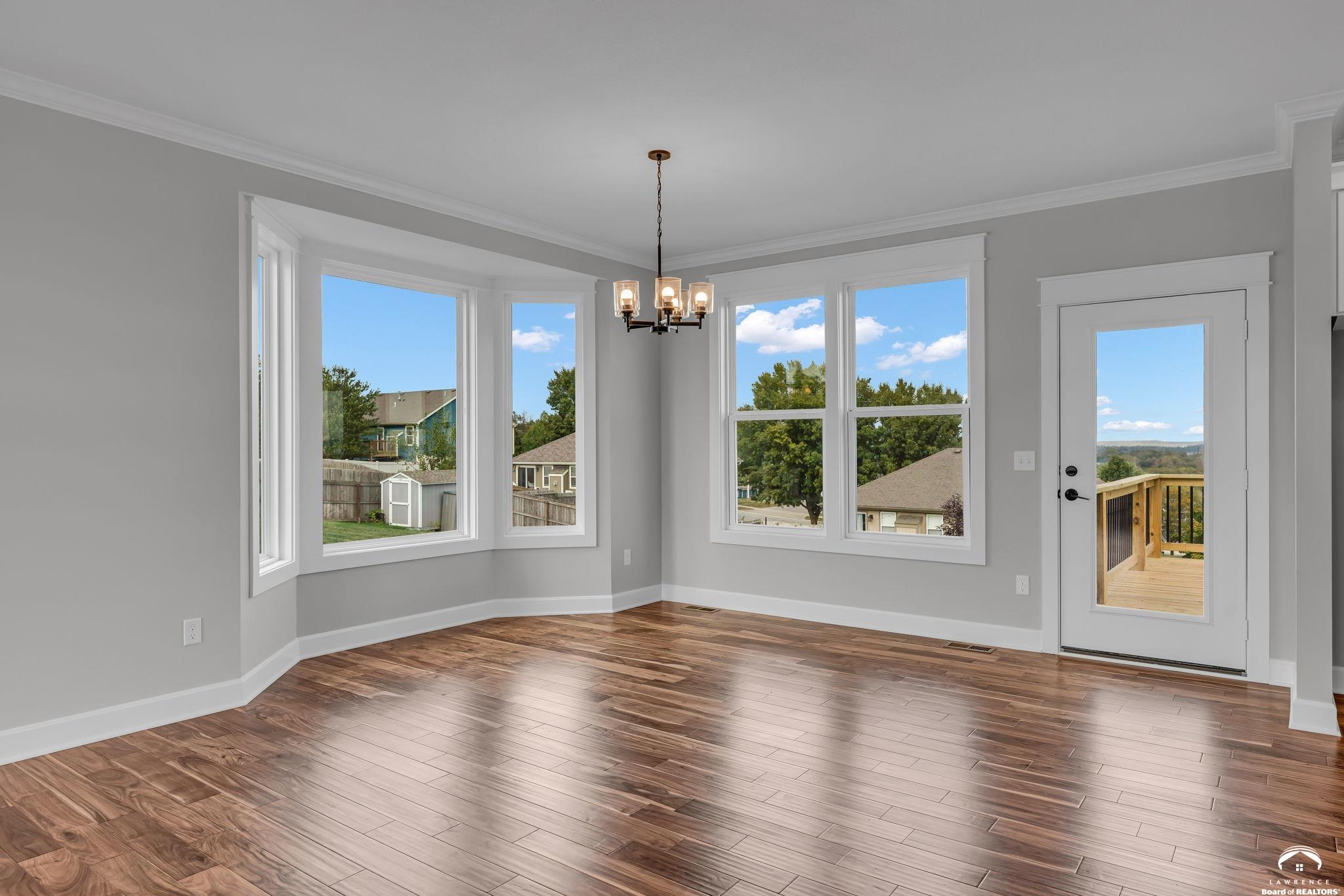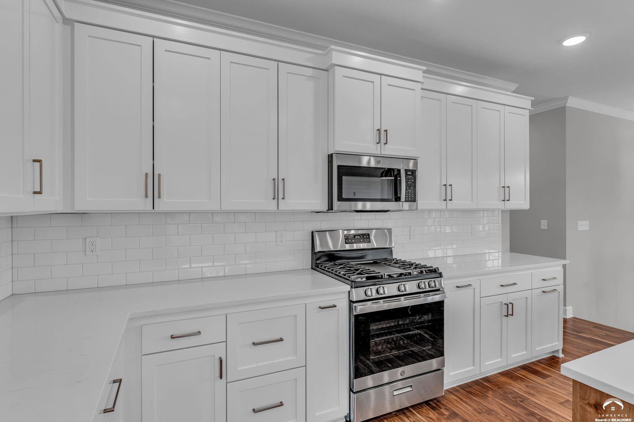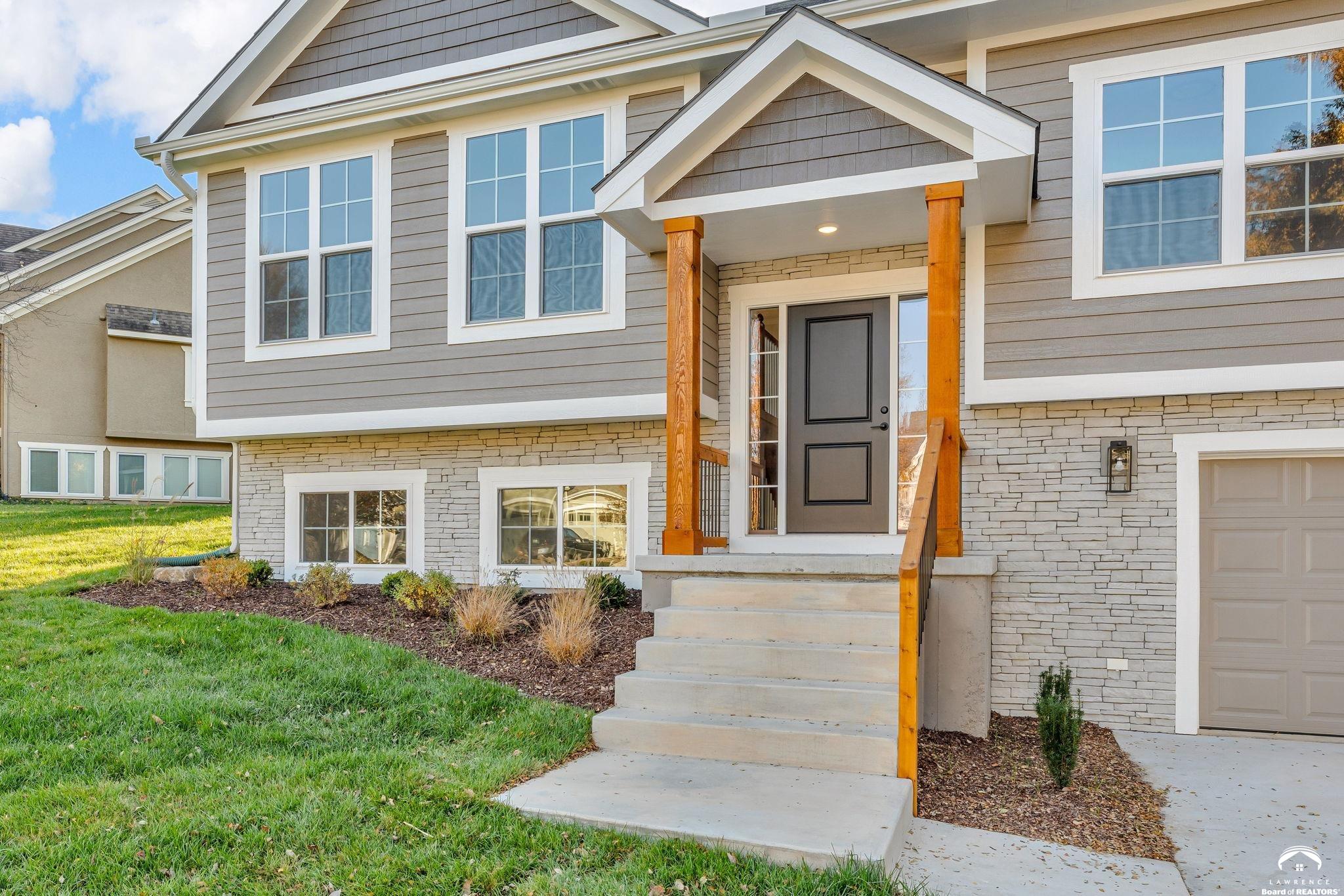 Bright and light new construction bi-level home, nestled in Sunflower Park's already established neighborhood. Gorgeous kitchen with custom made enameled cabinetry, large island, farmhouse sink, and gas range. Engineered hardwood flooring in living room, dining room, and kitchen. Custom cabinetry and quartz countertops throughout. Basement area features family room, laundry, full bath, and 4th bedroom. Enjoy the back deck and private backyard. Extended garage area. Lot is fully sodded with sprinkler system installed. Great location, close to the K-10 bypass, schools, and shopping. A must see in this price range! *Interior pics are of the same plan, different property address.