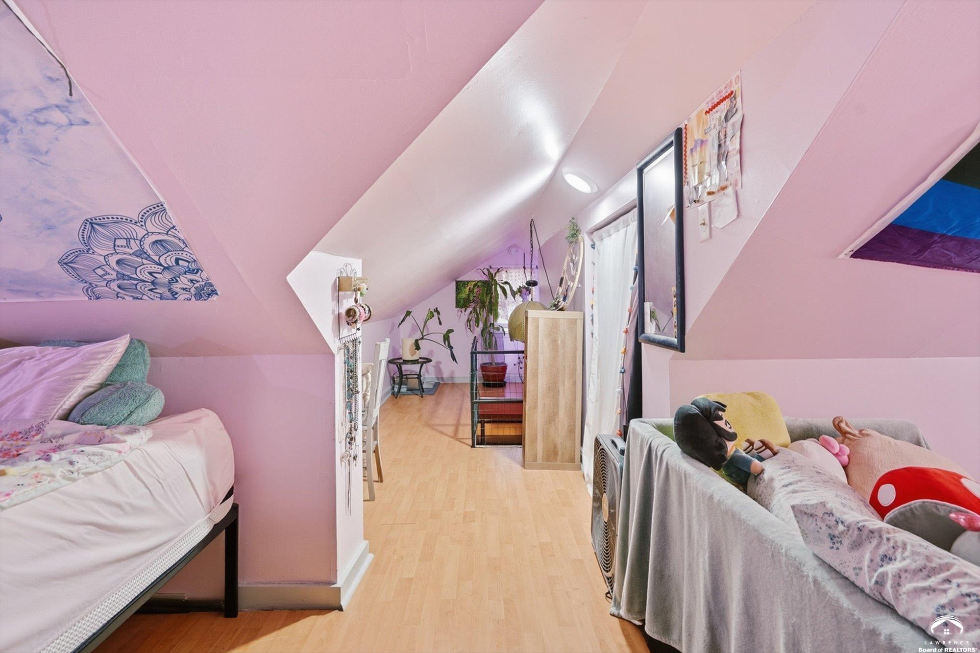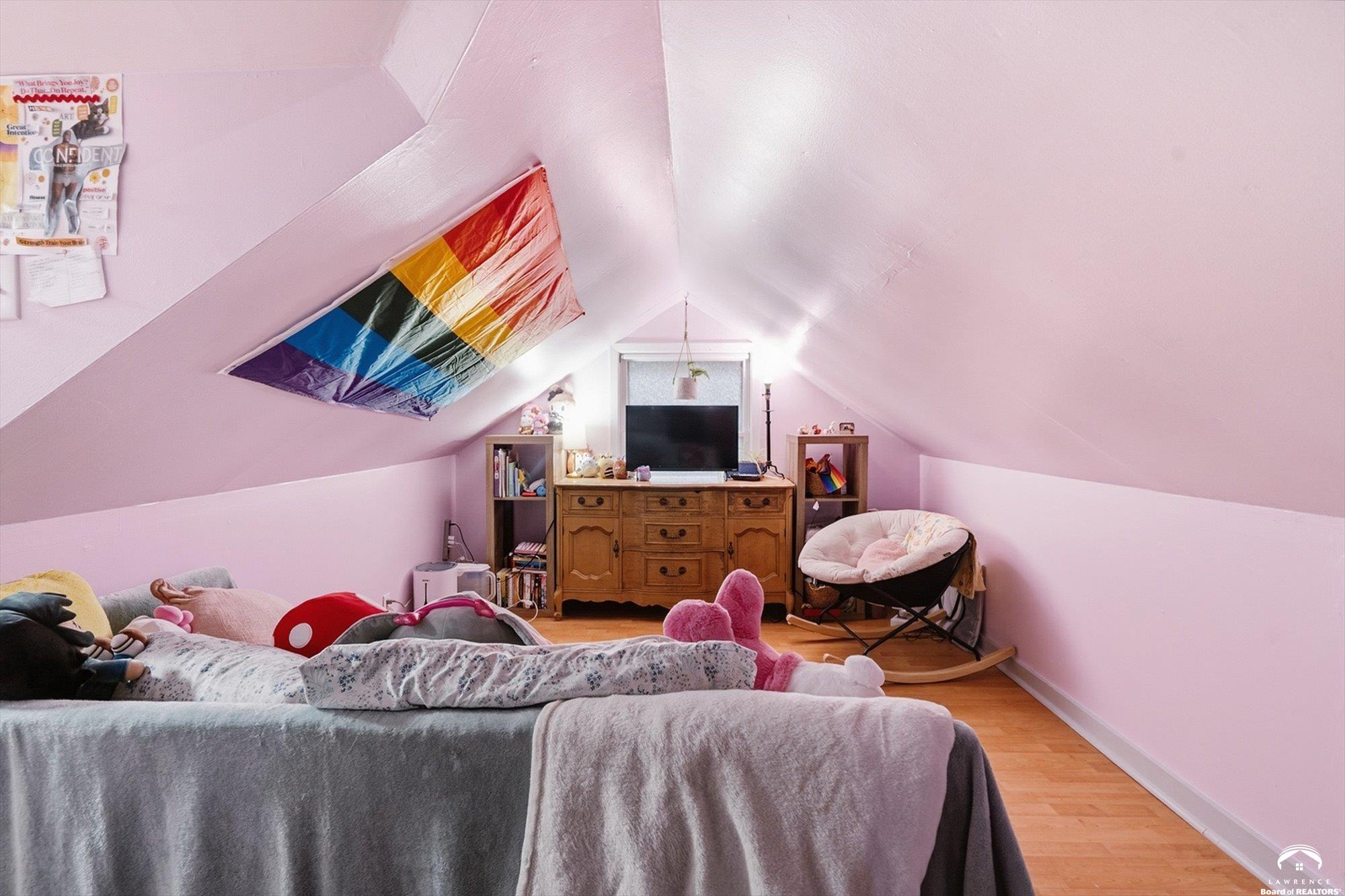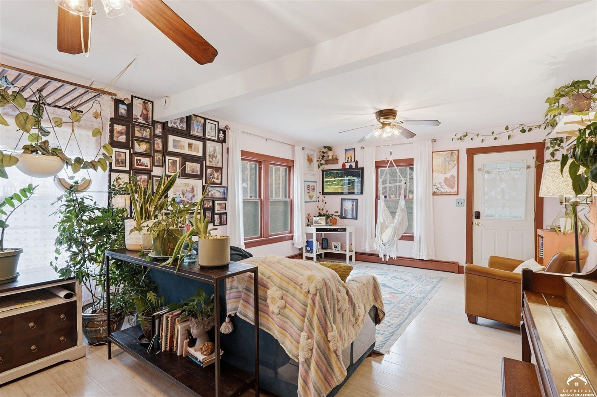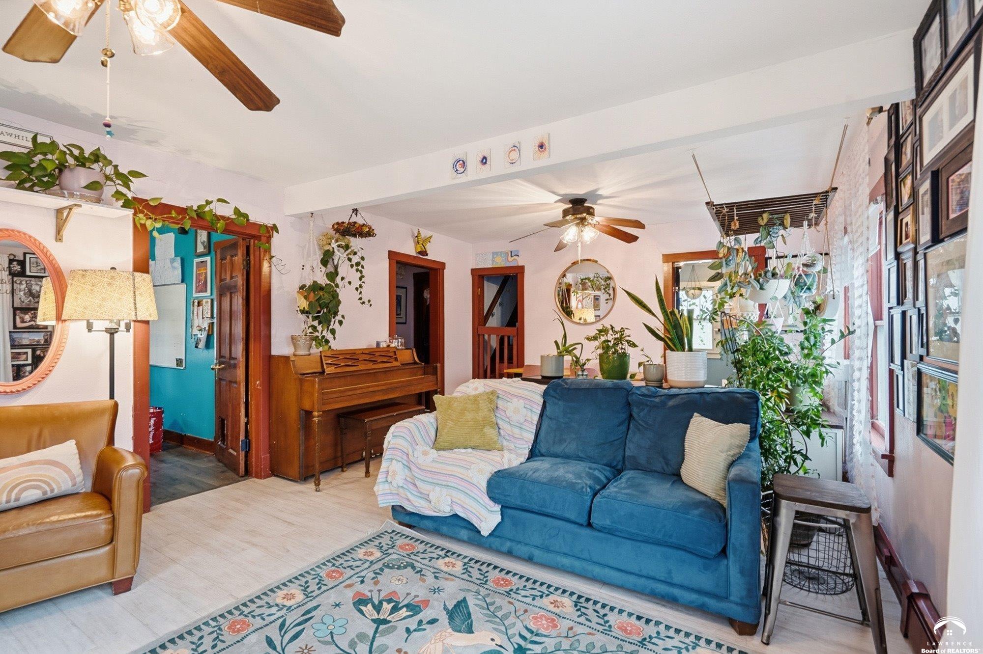 Location, location, location! Here's the cozy Barker neighborhood bungalow you've been waiting for! Full of the charm and character that you'd expect from a well-loved, nearly 100 year old home in a neighborhood that's known for its historic homes and mature trees. Nestled on the same block as the Barker Cafe & Bakery, you'll be close to nearly everything! Located near the grocery & hardware stores, the farmers market at Cottin's, restaurants, downtown Lawrence, KU and more! This home features a spacious living room full of windows and natural sunlight with newer hard surface flooring. The delightful kitchen has a newer stainless steel range/oven & ventilation system, and all appliances stay! There are two bedrooms on the main level accompanied with a full bathroom. Upstairs you'll find a 3rd bedroom featuring cozy and unique spaces created by the esthetically pleasing dormers. The basement features a 4th bedroom with an egress window, hard surface flooring and a walk-in closet accompanied by a convenient 3/4 bathroom and laundry room. Improvements over the last eight years include a NEW roof in Sept/2025, foundation work by Advanced Systems of NE KS, regrading, tankless water heater for endless hot water, new gutters in 2022, beautiful privacy fenced backyard with river rock landscaping & firepit perfect for entertaining. Spacious driveway for plenty of off-street parking! Imagine relaxing on the inviting covered front porch enjoying the wonderful Barker neighborhood, conveniently located to so many amenities and schedule your private showing today. Seller prefers to sell "AS IS". Inspections welcome.