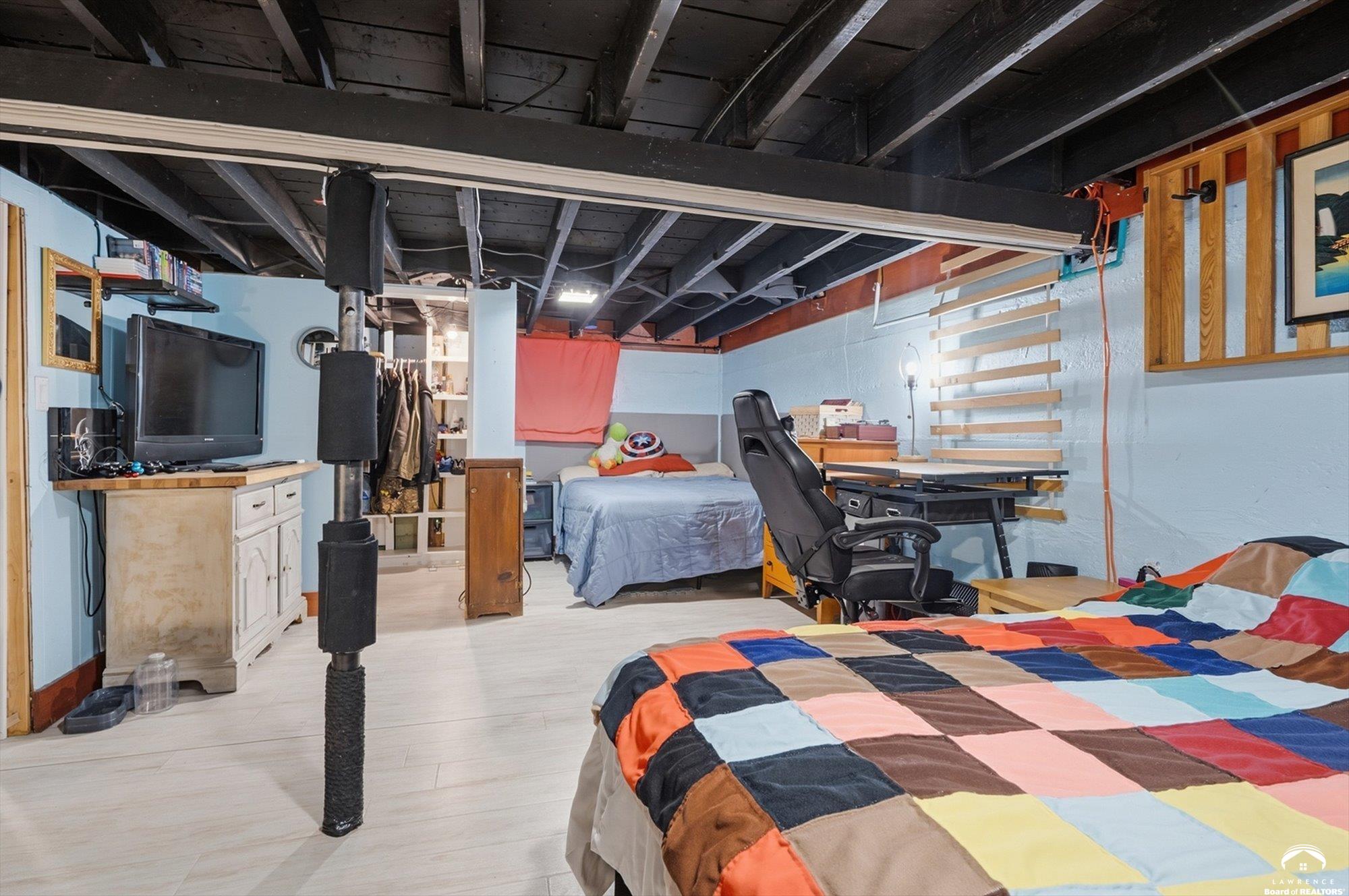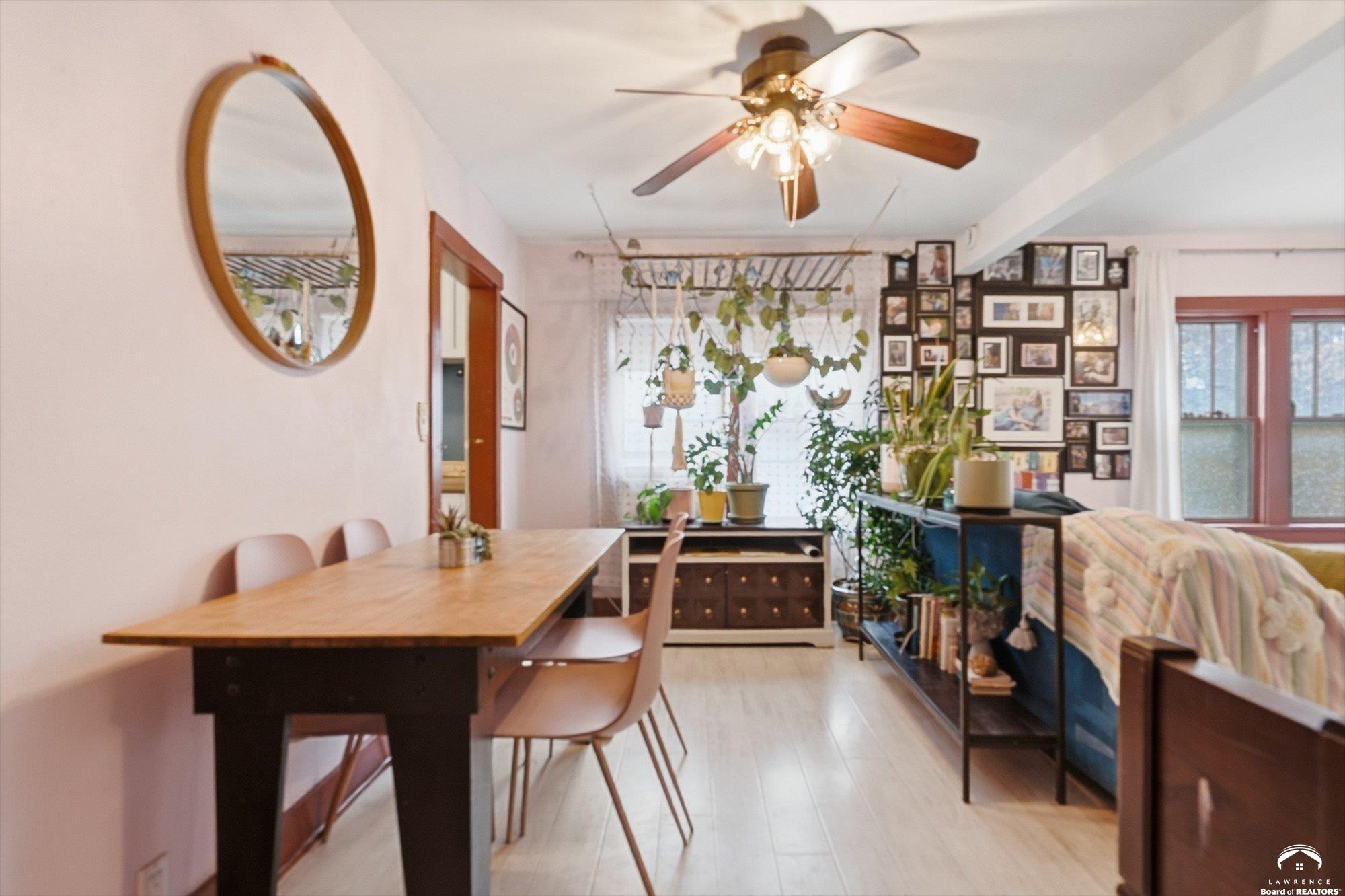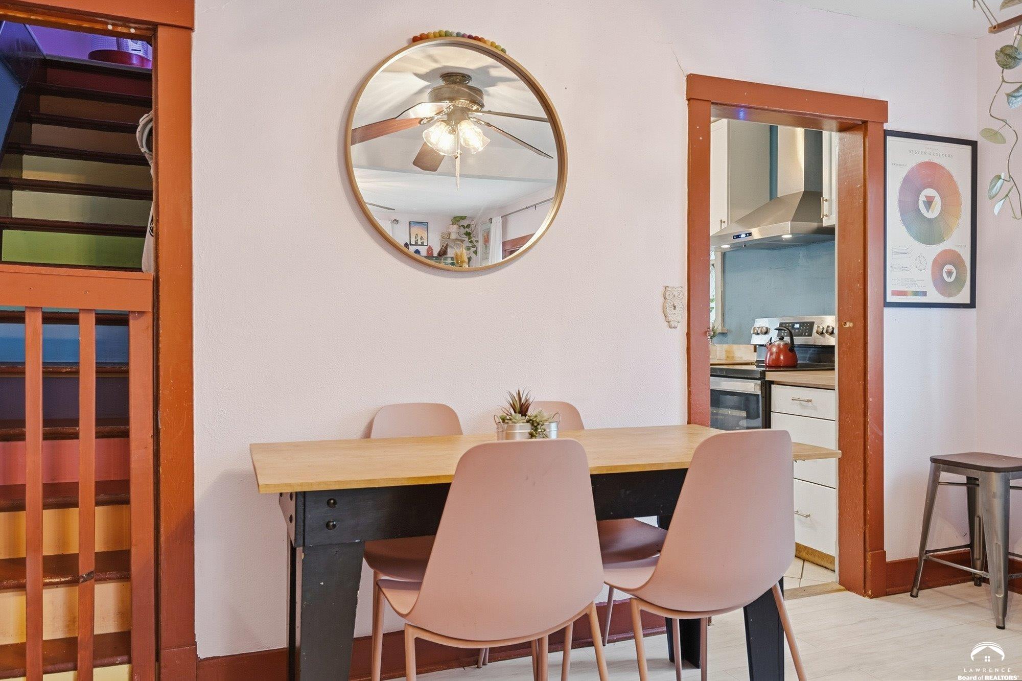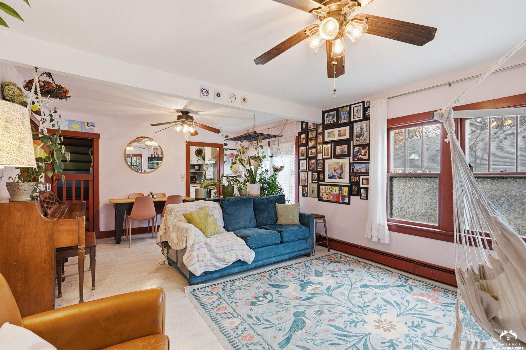 Location, location, location! Here's the cozy Barker neighborhood bungalow you've been waiting for! Full of the charm and character that you'd expect from a well-loved, nearly 100 year old home in a neighborhood that's known for its historic homes and mature trees. Nestled on the same block as the Barker Cafe & Bakery, you'll be close to nearly everything! Located near the grocery & hardware stores, the farmers market at Cottin's, restaurants, downtown Lawrence, KU and more! This home features a spacious living room full of windows and natural sunlight with newer hard surface flooring. The delightful kitchen has a newer stainless steel range/oven & ventilation system, and all appliances stay! There are two bedrooms on the main level accompanied with a full bathroom. Upstairs you'll find a 3rd bedroom featuring cozy and unique spaces created by the esthetically pleasing dormers. The basement features a 4th bedroom with an egress window, hard surface flooring and a walk-in closet accompanied by a convenient 3/4 bathroom and laundry room. Improvements over the last eight years include a NEW roof in Sept/2025, foundation work by Advanced Systems of NE KS, regrading, tankless water heater for endless hot water, new gutters in 2022, beautiful privacy fenced backyard with river rock landscaping & firepit perfect for entertaining. Spacious driveway for plenty of off-street parking! Imagine relaxing on the inviting covered front porch enjoying the wonderful Barker neighborhood, conveniently located to so many amenities and schedule your private showing today. Seller prefers to sell "AS IS". Inspections welcome.
