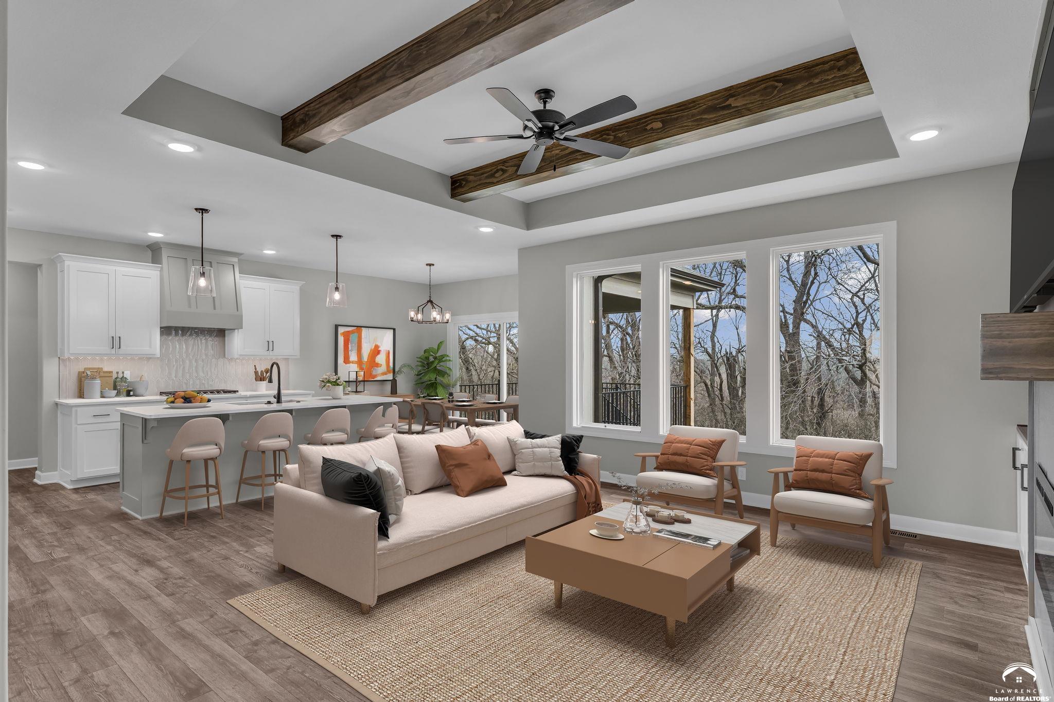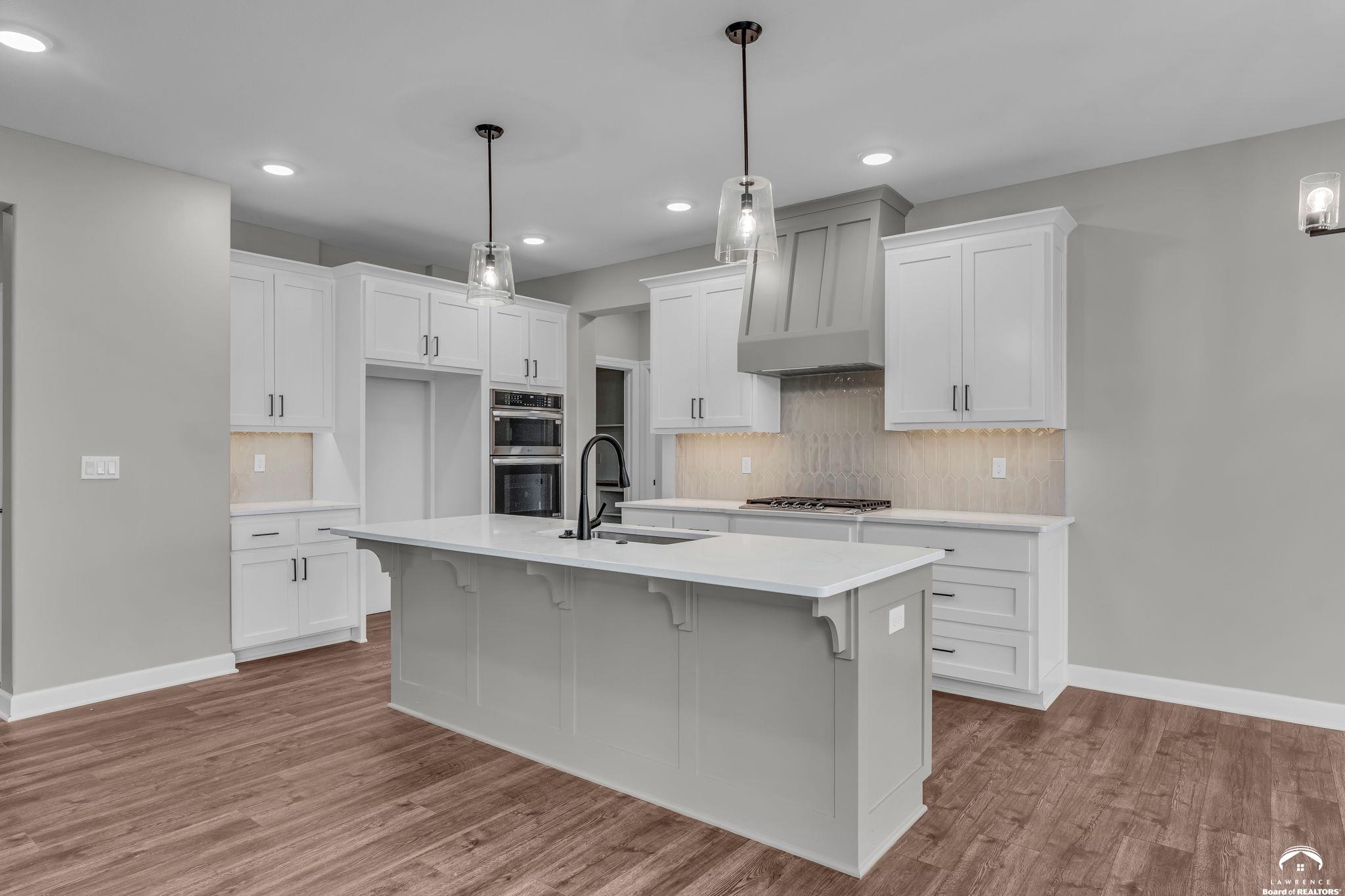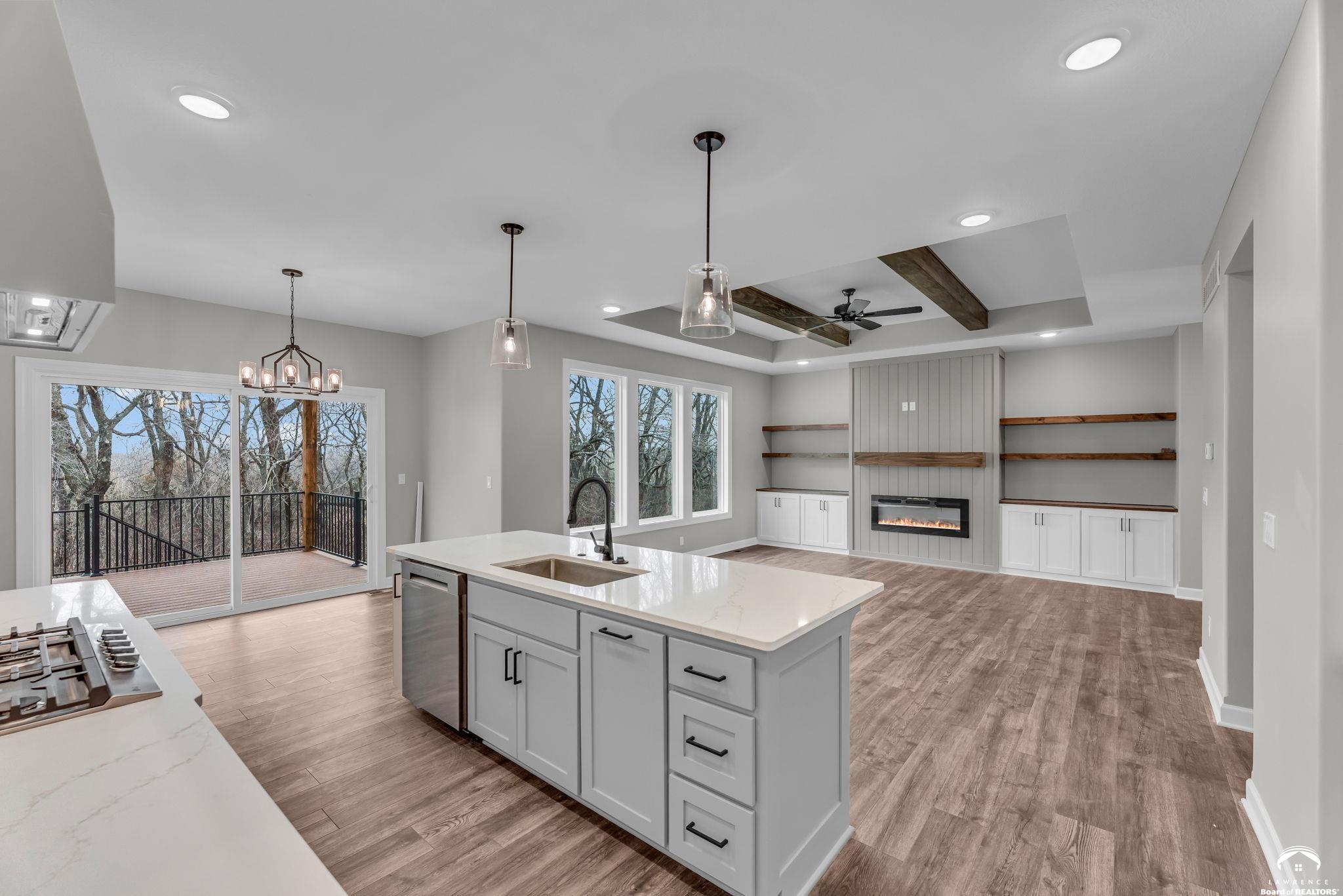 The Bridgeport II floorplan built by Drippé Homes. Open concept daylight basement with tons of natural light! Rustic ceiling beams, stucco front, and gorgeous built ins. Kitchen furnished with stainless appliances, gas cooktop, hood vent, microwave, wall oven, quartz countertops, large island with oversized sink and spacious butlers pantry. Two bedrooms on main with primary opposite other bedroom. Ensuite features double vanity, tiled walk-in shower, private water closet and gigantic closet with pass through to laundry. Mudroom off garage with boot bench. Finished basement with two additional bedrooms and rec room complete with wet bar, ready for hosting the next big game. Cozy up to the fireplace in the living room or enjoy the sunrise from the covered composite deck. Home backs to tree-line providing ultimate privacy with sod and sprinkler system included. Unfinished basement storage, built-ins and three car garage provide plenty of storage. Almost ready for your personal touch - schedule a showing today!