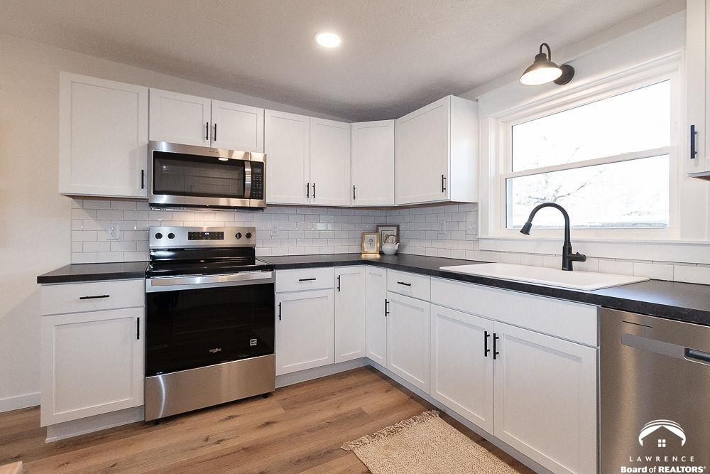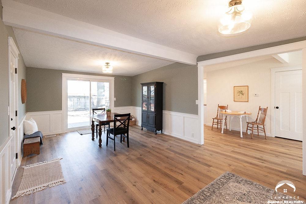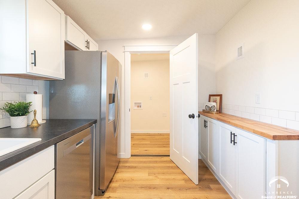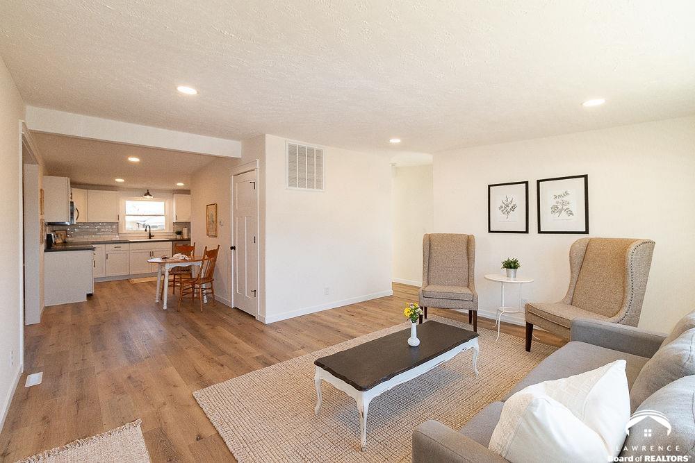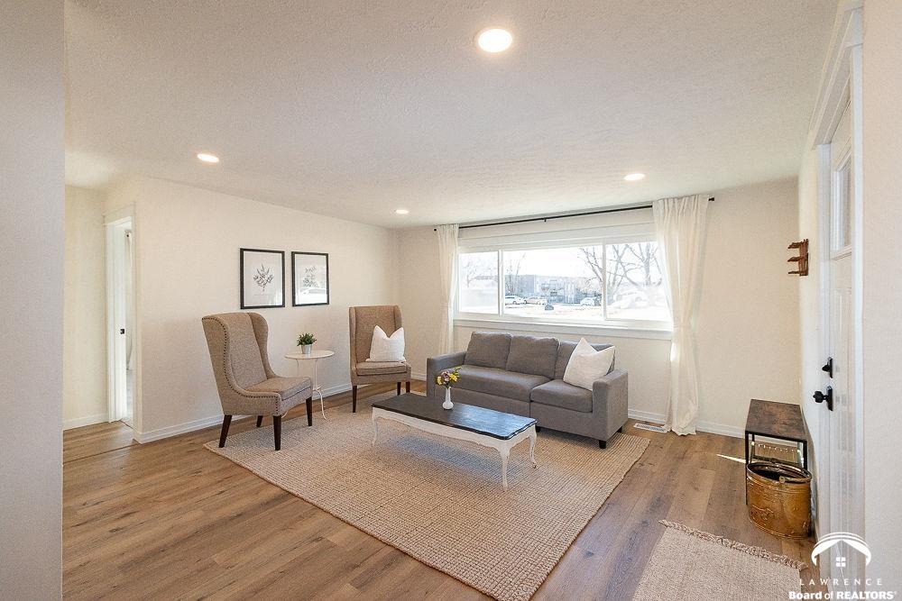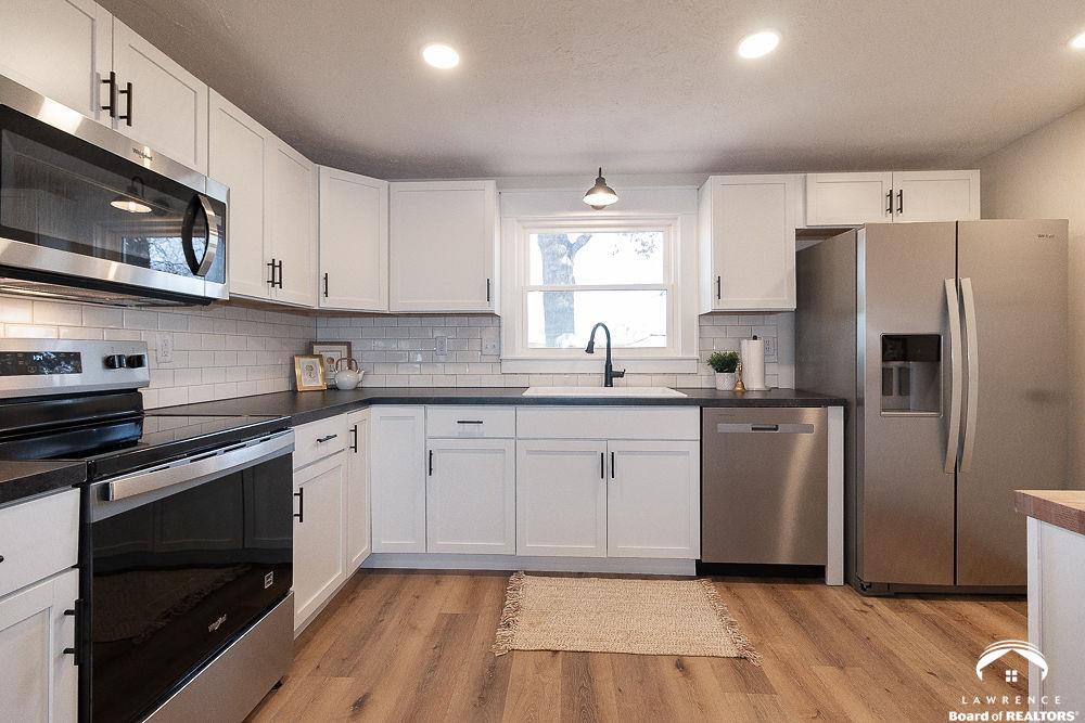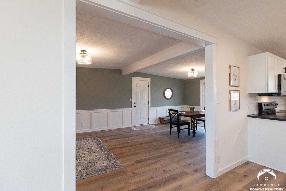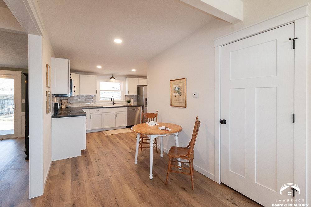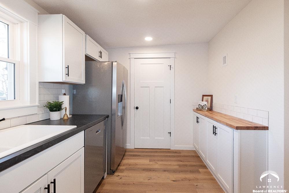 This lovely, remodeled home features expanded openings, dual living spaces and dining areas, and a fully renovated kitchen complete with new appliances, and a butcher block workspace. An upgraded header enhances the flow and architectural style throughout. All new windows, doors, trim, hardware, and garage doors have been replaced for a crisp, modern finish. The bathrooms are updated with new fixtures and vanities, while the laundry room has relocated hookups, new drain lines, and added shutoffs. New vinyl plank flooring, bedroom carpet, and newly interior paint on ceilings, trim, walls and doors, create a fresh, move-in-ready feel. Electrical upgrades include new lighting, switches, outlets, an updated panel and mast, plus added circuits. Added insulation, serviced HVAC components, and updated window treatments complete this transformation. Exterior improvements include new gutters, re-graded drainage, tree removal, fresh soffits and fascia, and roof repairs. Hosting and outdoor possibilities are abundant with this spacious corner lot and backyard area.