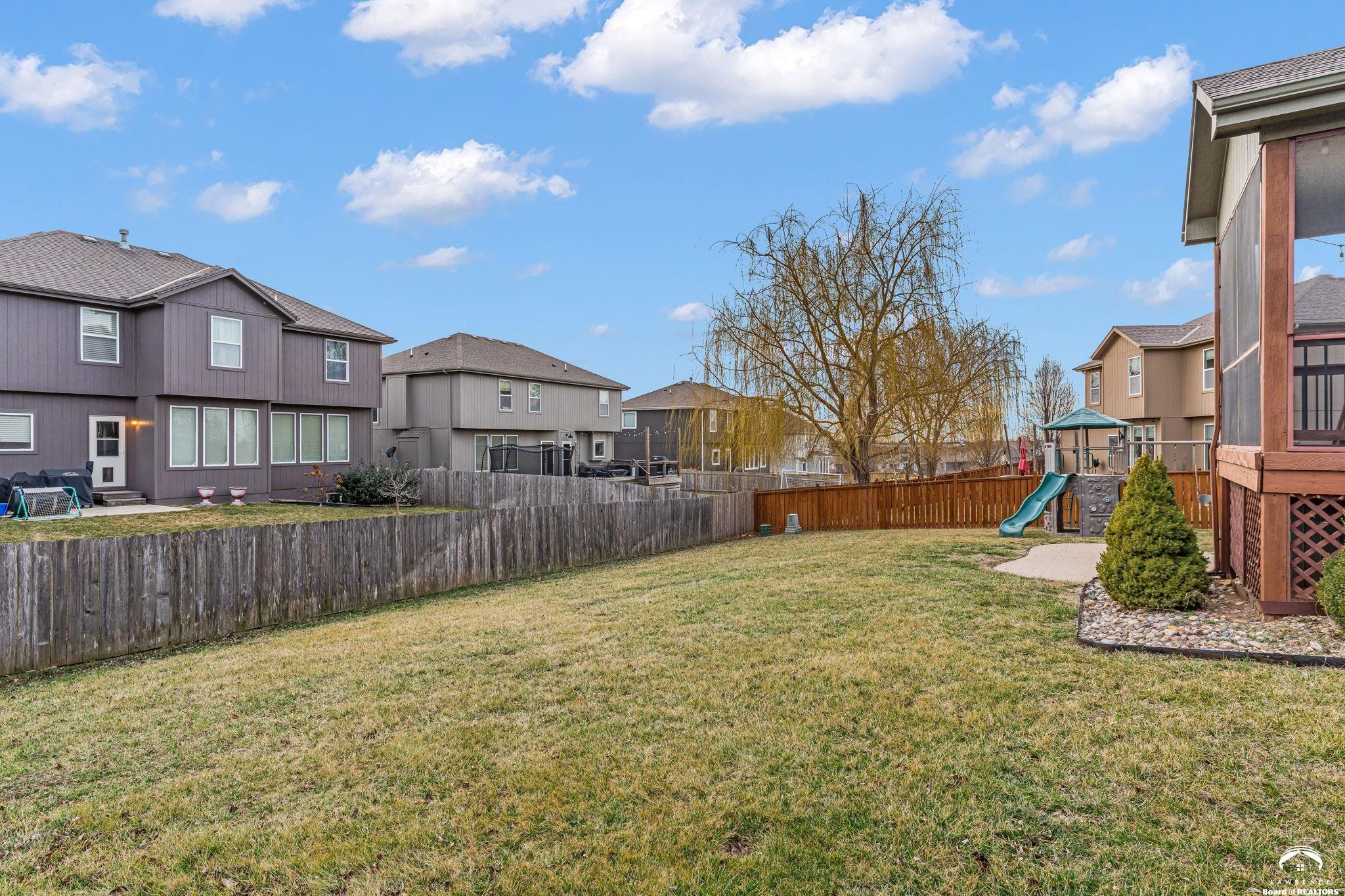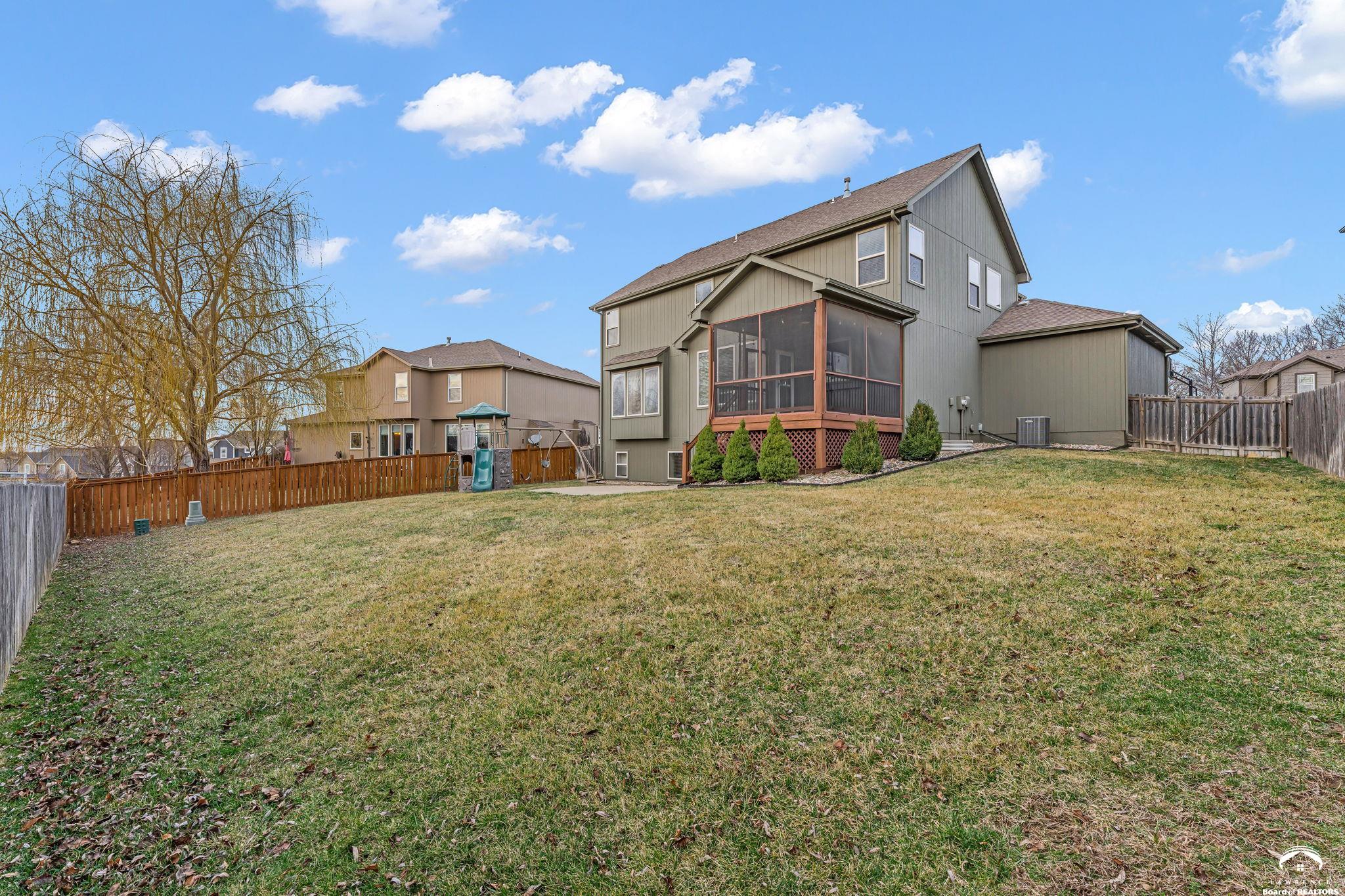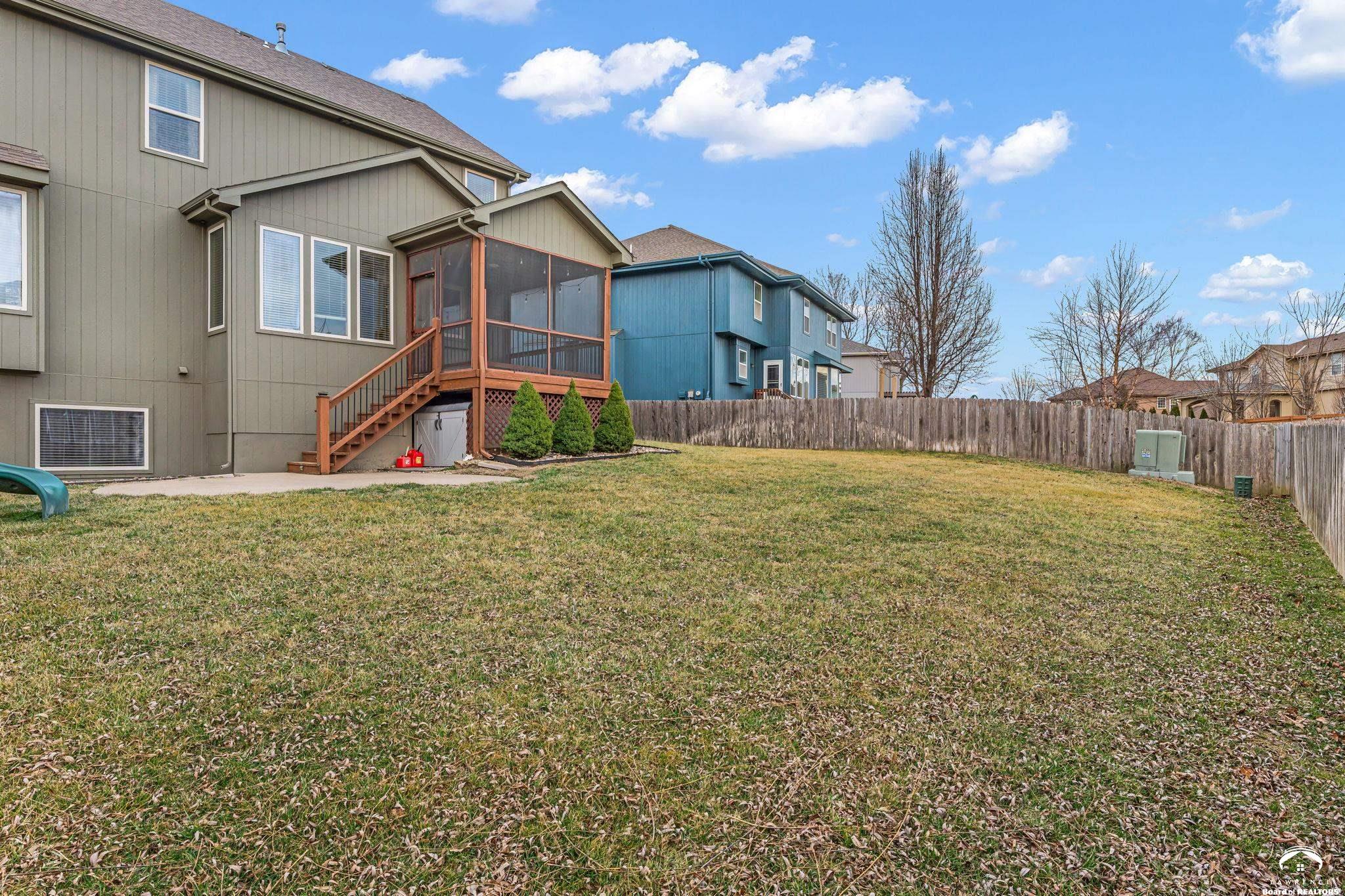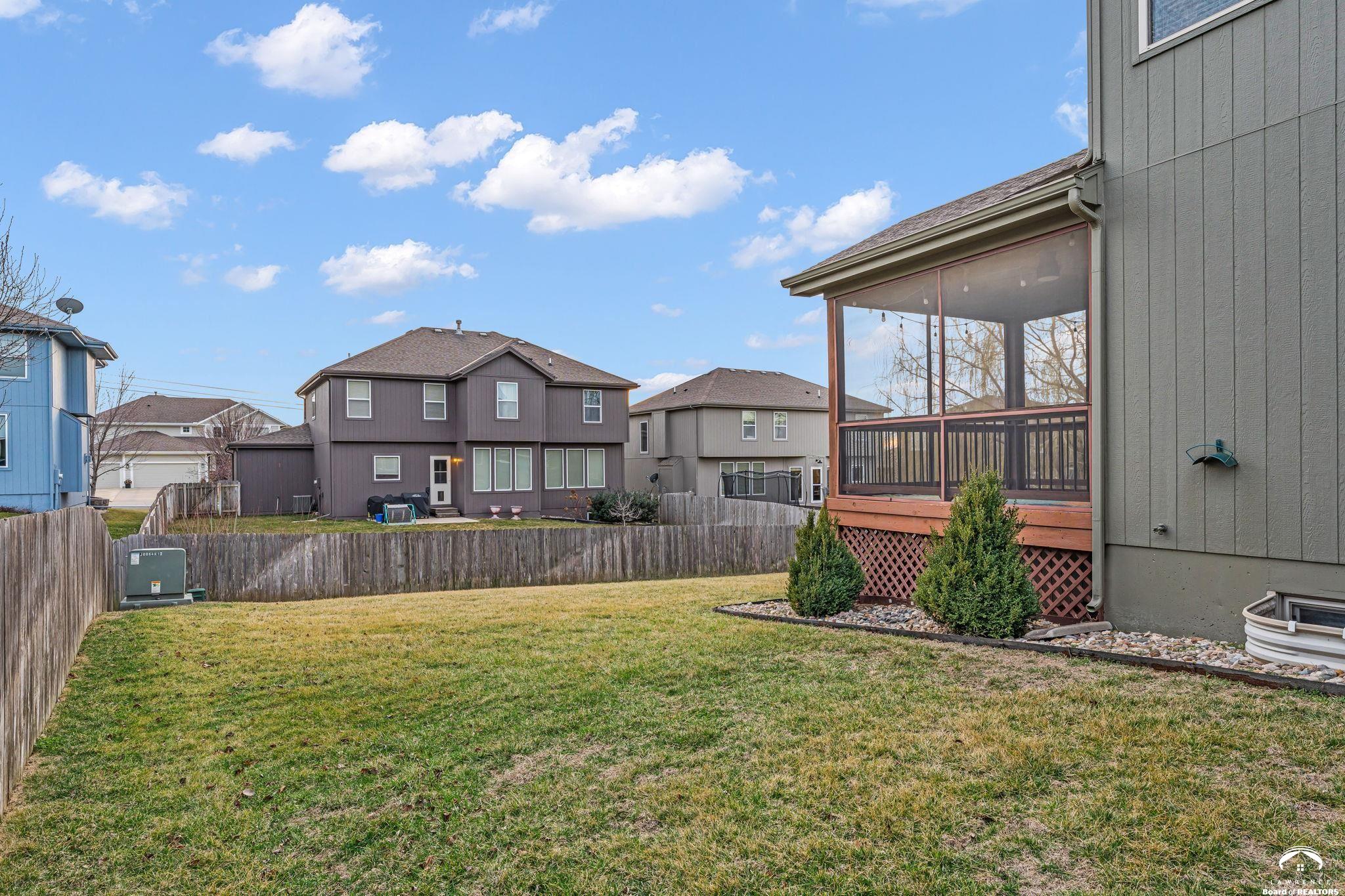 This 5-bedroom, 3.5-bathroom, two-story home offers a functional open floor plan with thoughtful upgrades throughout. The main level features hardwood floors and a well-designed kitchen that opens to the living area and eat-in dining space complete with abundant cabinetry, a walk-in pantry, and a center granite island. Custom blinds are installed throughout the first and second floors. A screened-in deck off the main level overlooks the fenced backyard. Upstairs includes four bedrooms with laundry conveniently located on the same level to add to the home’s functional layout. The large primary features a jetted tub, a walk-in shower with dual showerheads, and a spacious walk-in closet. Secondary bedrooms are equipped with upgraded light fixtures and dimmer switches. The finished basement, completed in 2014, adds significant additional living space and includes a living area with wet bar, a fifth bedroom, and a full bathroom – providing a private lower-level retreat. An additional bonus room offers flexibility for use as a home office, recreation space, or storage. Flooring and paint upgrades in 2021. The home also includes a 3-car garage with storage systems that remain with the property, a sprinkler system installed in 2016 and established landscaping. Conveniently located in the heart of Lenexa, this home is near Lenexa Lake, Lenexa parks and trails with easy access to Lenexa City Center, Shawnee Mission Park, and major highways. Situated in a desirable Johnson County location within the Olathe School District, including Manchester Park Elementary.