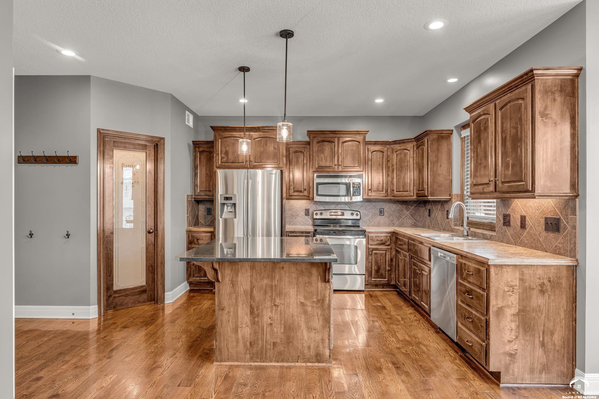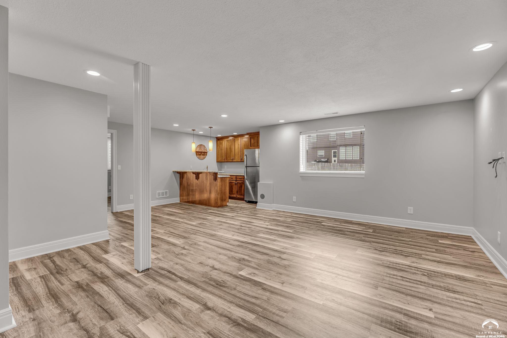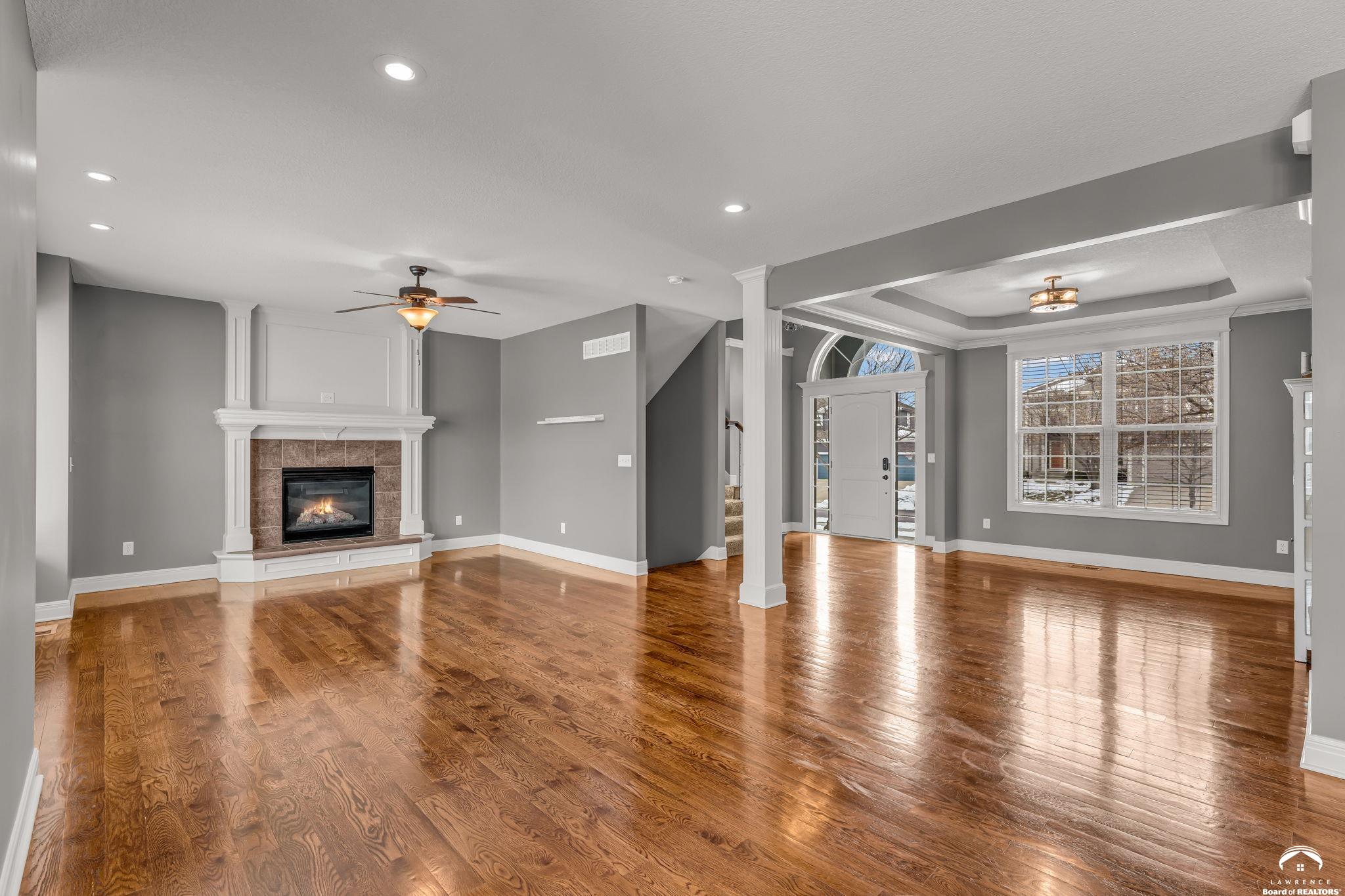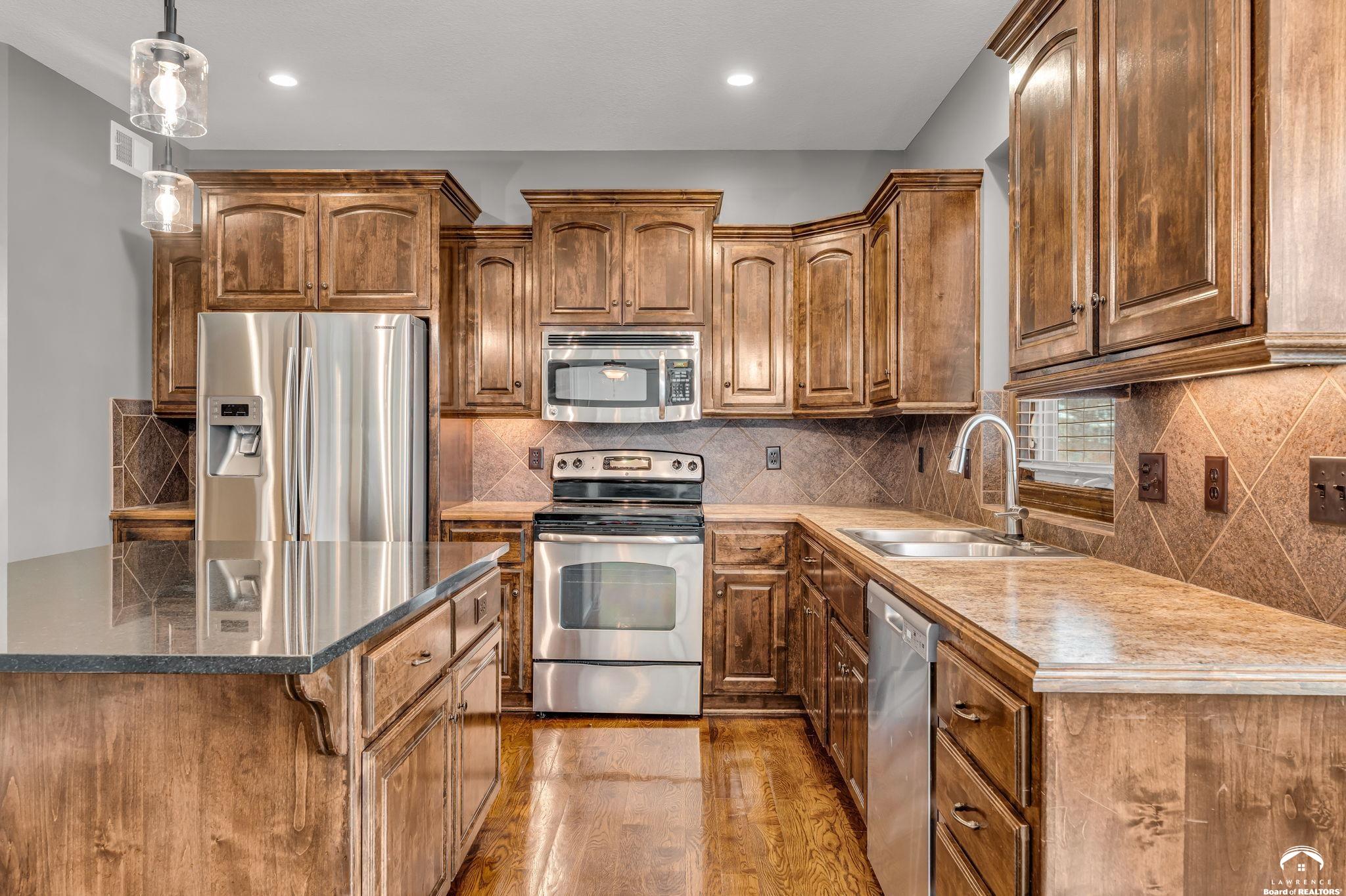 This 5-bedroom, 3.5-bathroom, two-story home offers a functional open floor plan with thoughtful upgrades throughout. The main level features hardwood floors and a well-designed kitchen that opens to the living area and eat-in dining space complete with abundant cabinetry, a walk-in pantry, and a center granite island. Custom blinds are installed throughout the first and second floors. A screened-in deck off the main level overlooks the fenced backyard. Upstairs includes four bedrooms with laundry conveniently located on the same level to add to the home’s functional layout. The large primary features a jetted tub, a walk-in shower with dual showerheads, and a spacious walk-in closet. Secondary bedrooms are equipped with upgraded light fixtures and dimmer switches. The finished basement, completed in 2014, adds significant additional living space and includes a living area with wet bar, a fifth bedroom, and a full bathroom – providing a private lower-level retreat. An additional bonus room offers flexibility for use as a home office, recreation space, or storage. Flooring and paint upgrades in 2021. The home also includes a 3-car garage with storage systems that remain with the property, a sprinkler system installed in 2016 and established landscaping. Conveniently located in the heart of Lenexa, this home is near Lenexa Lake, Lenexa parks and trails with easy access to Lenexa City Center, Shawnee Mission Park, and major highways. Situated in a desirable Johnson County location within the Olathe School District, including Manchester Park Elementary.