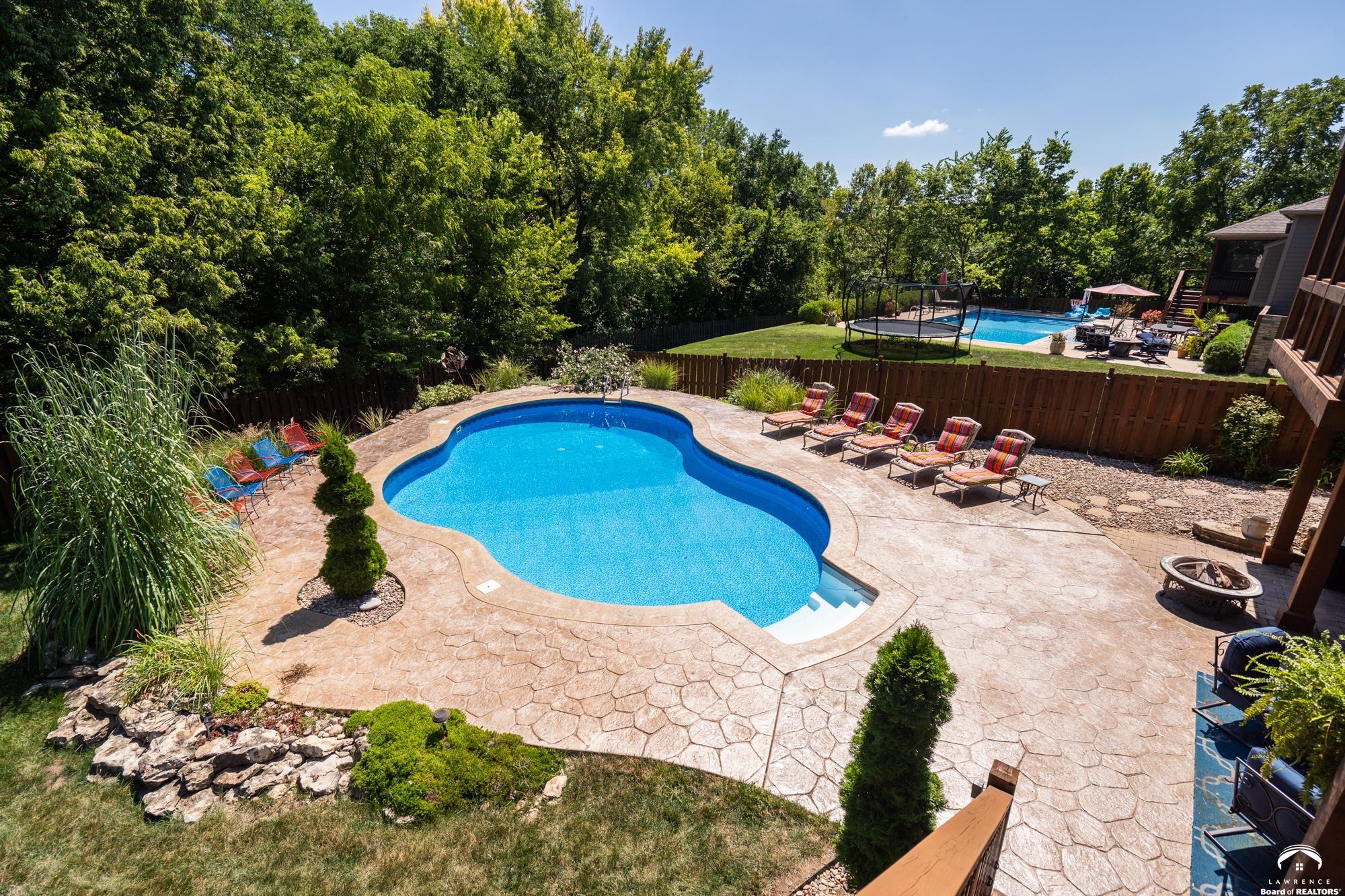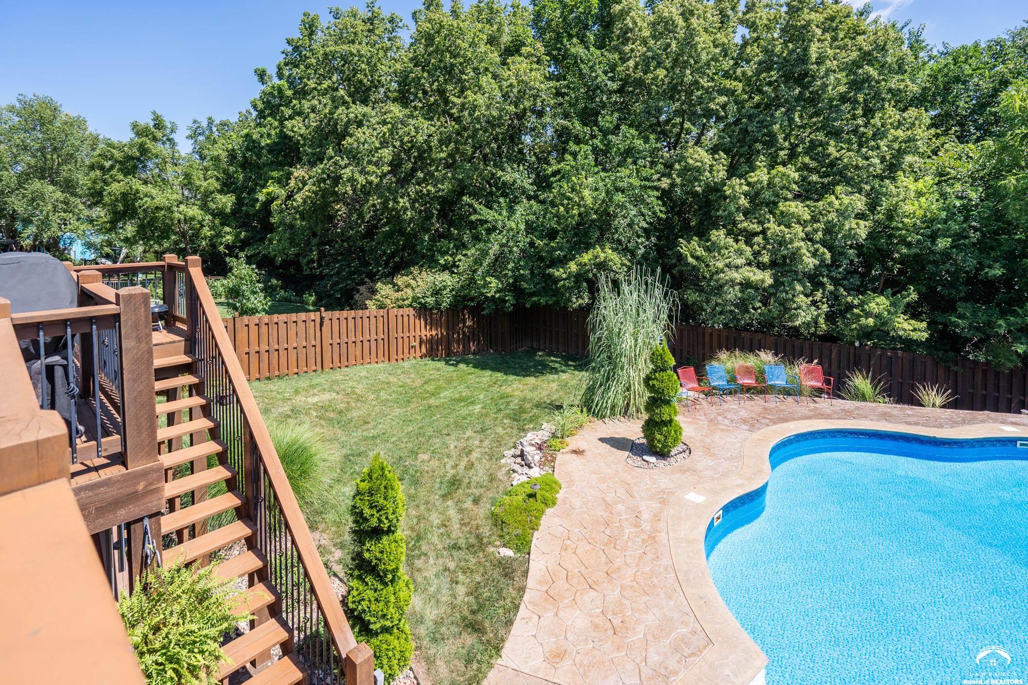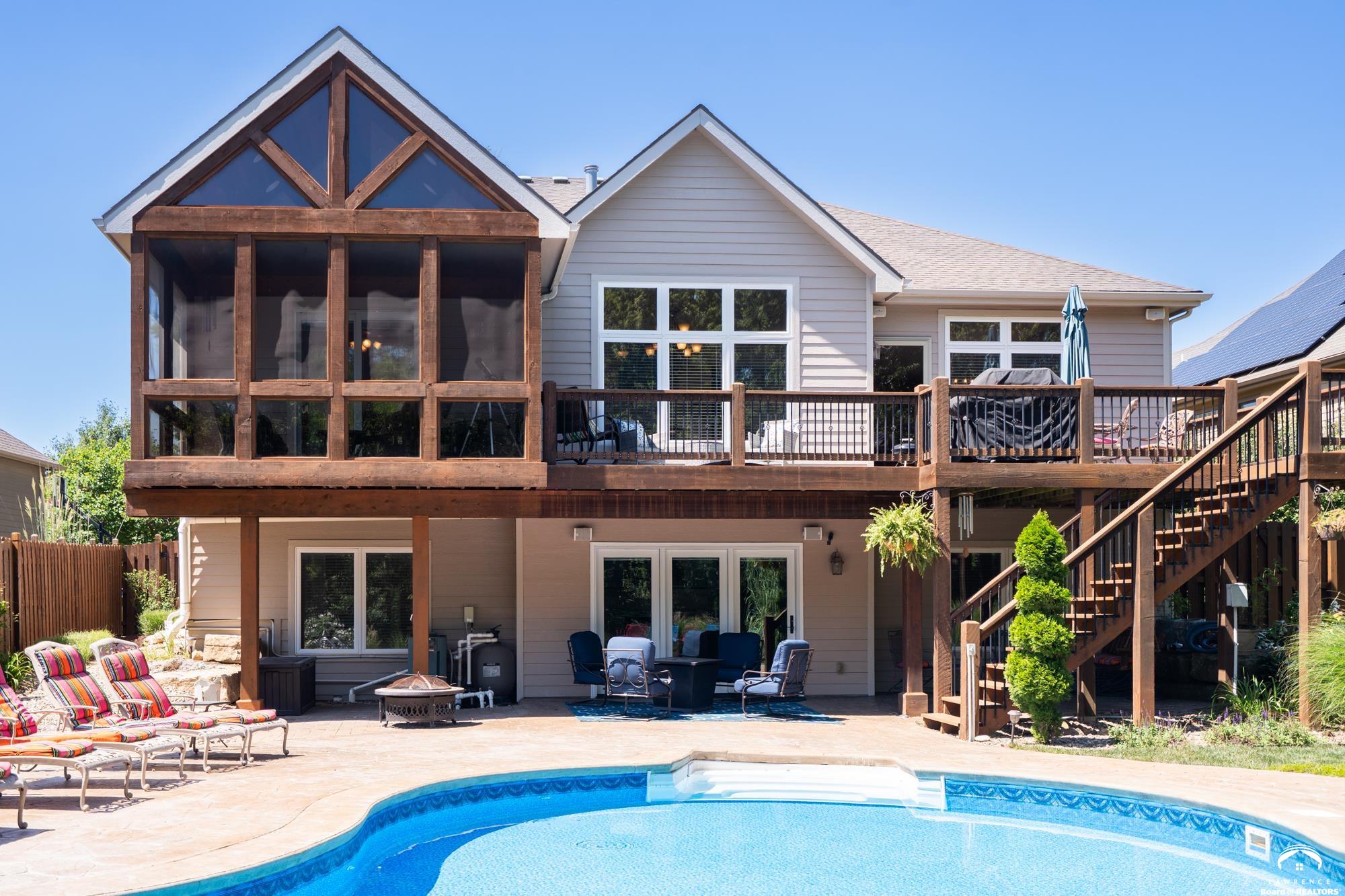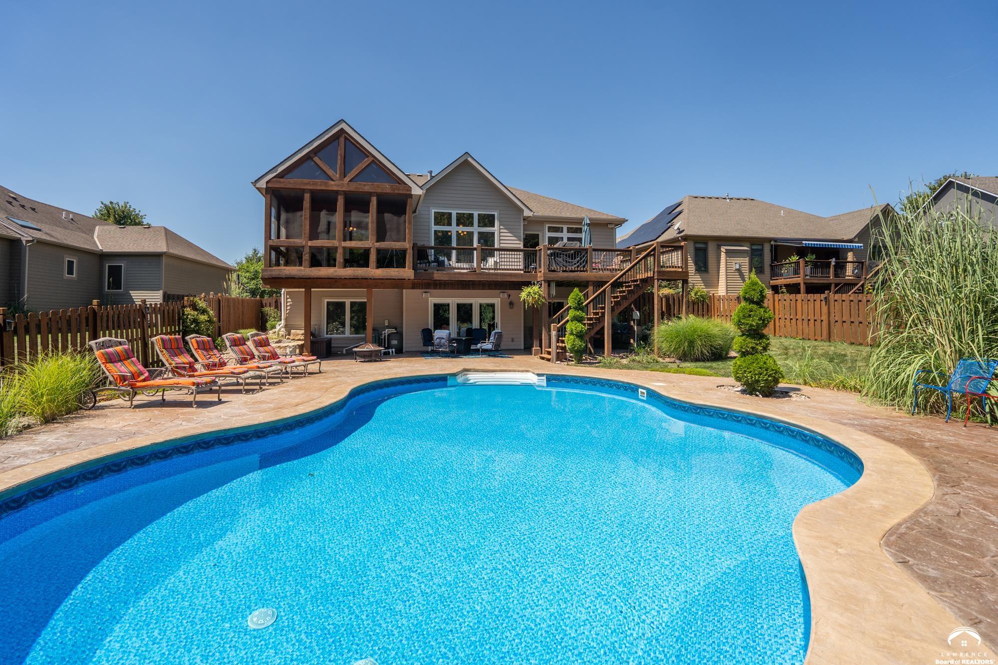 Welcome to your dream home in the desirable Fox Chase South subdivision! This beautifully detailed walk-out rancher offers over 3,400+ feet of thoughtfully designed living space, nestled against lush green space and—perfect if you crave privacy without sacrificing convenience. The main-level includes a Primary Suite with a custom screened porch & spa bath, a thoughtfully updated open kitchen/dining space and a deck with amazing views of the custom salt-water pool and patio. The lower level includes one en-suite bedroom, wet bar, living/sunroom space and two more bedrooms. The expansive storage area could be easily finished for additional office/flex space. Located just minutes from Corpus Christi Catholic Church, Langston Hughes Elementary School, Free State High School and the Rock Chalk Sports Pavilion—everything you need is nearby. Easy access to Kansas City & Topeka, Clinton Lake and the Lawrence Loop Trail will also make your life easier. Enjoy peaceful mornings on your screened porch and evening sunsets on your expanded deck, all while overlooking the serene natural backdrop of the adjacent green space.