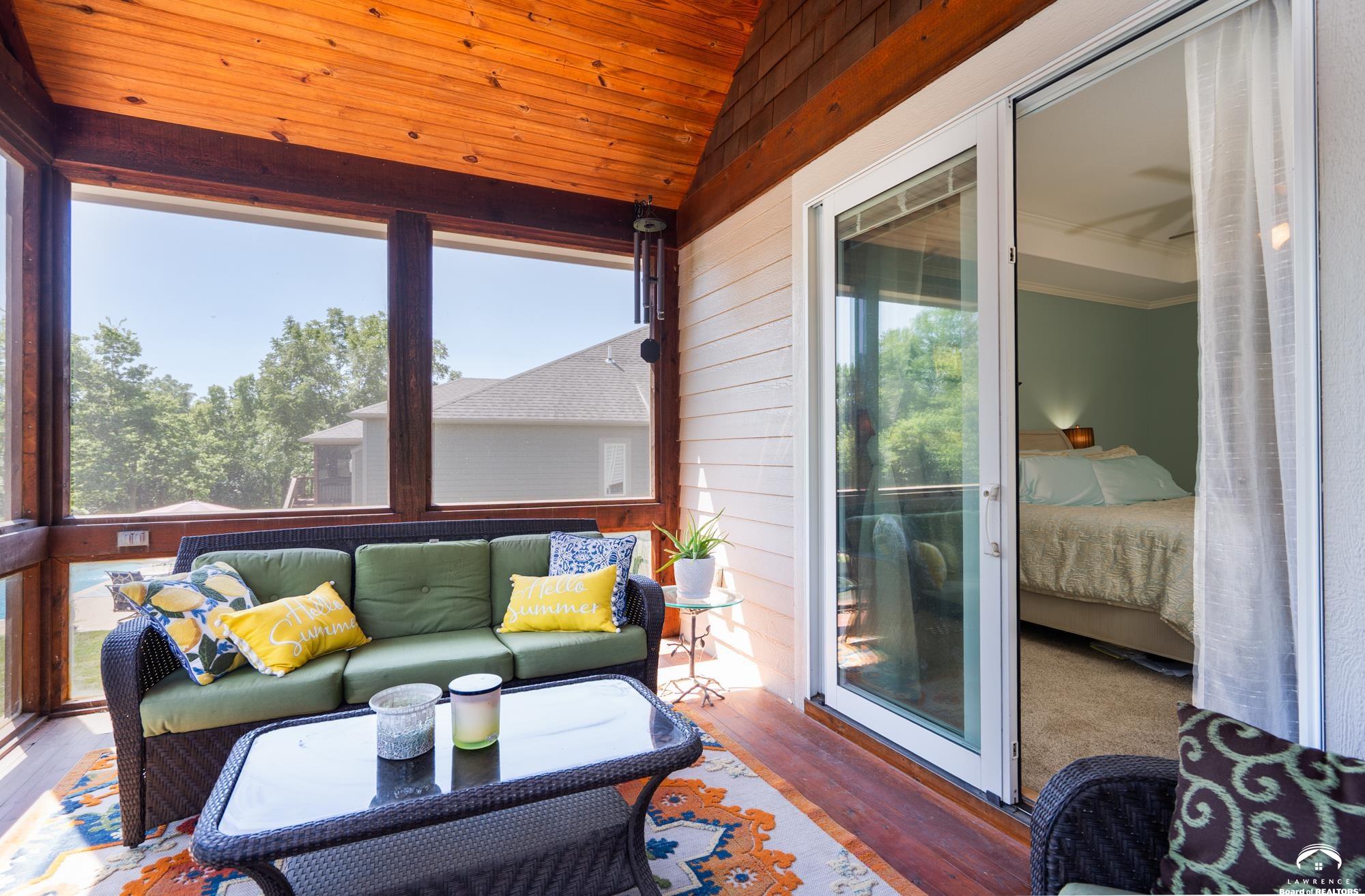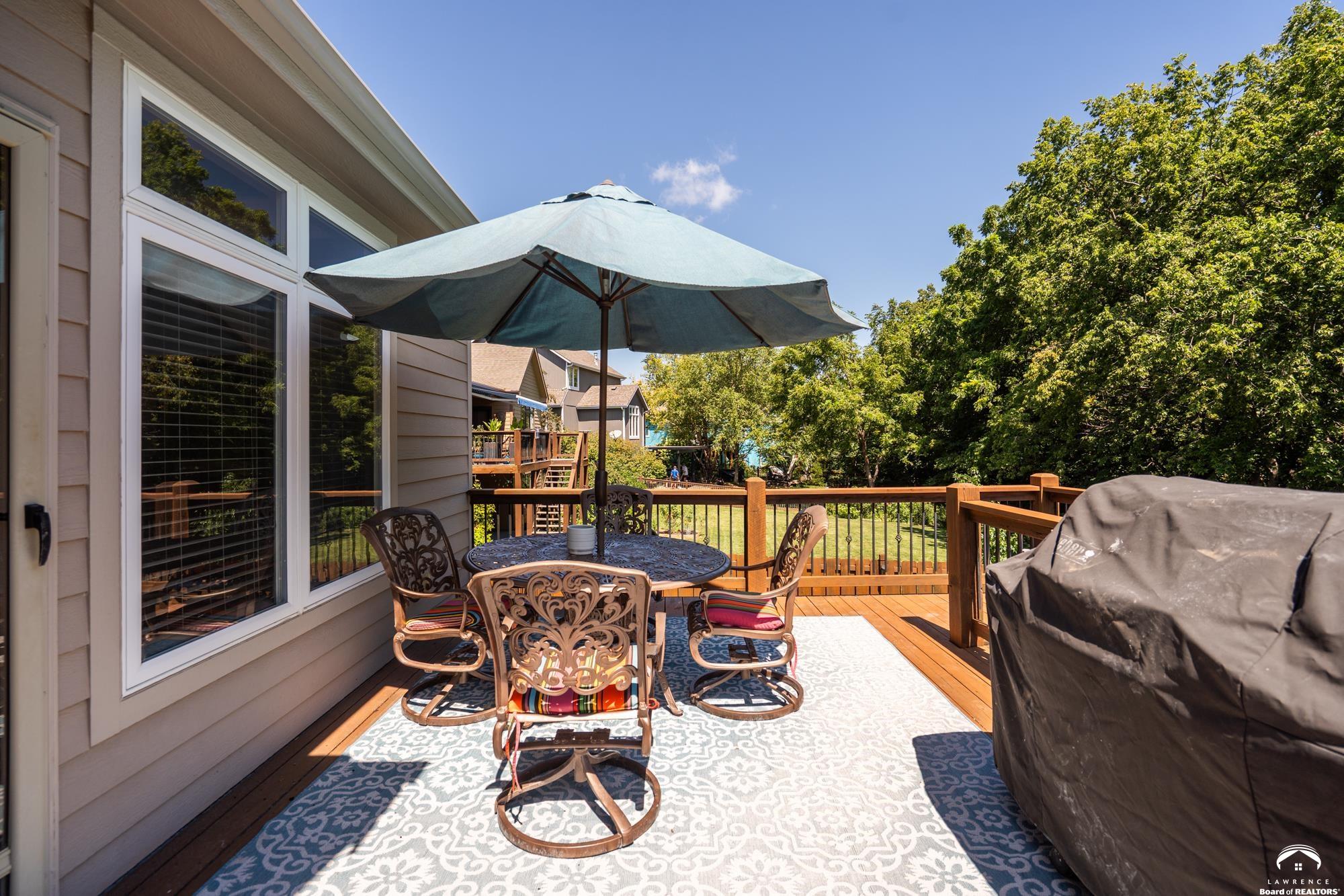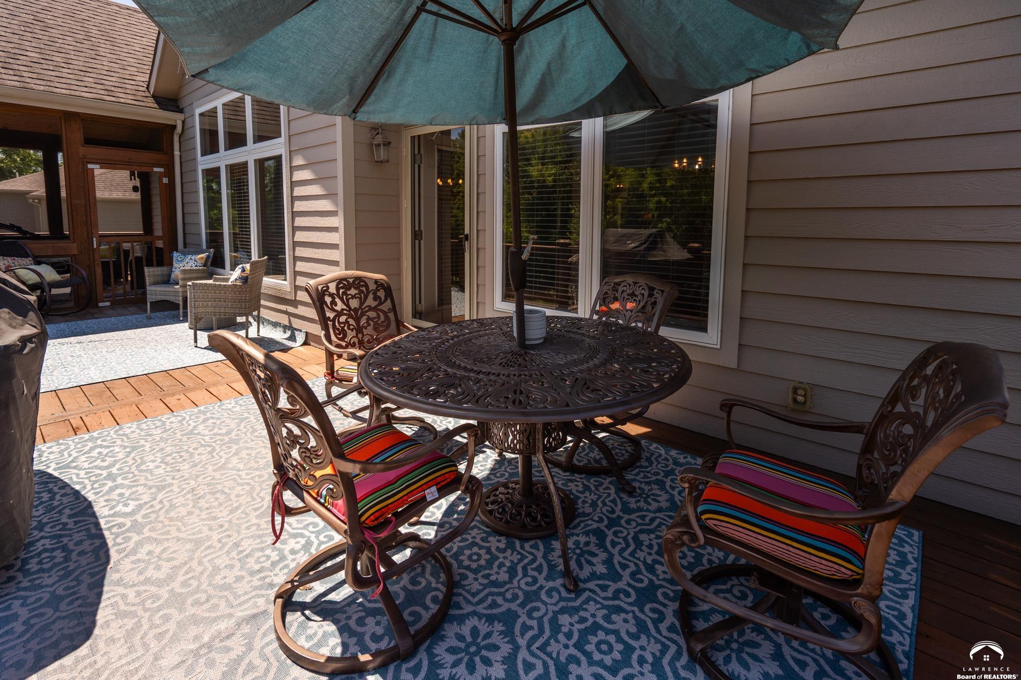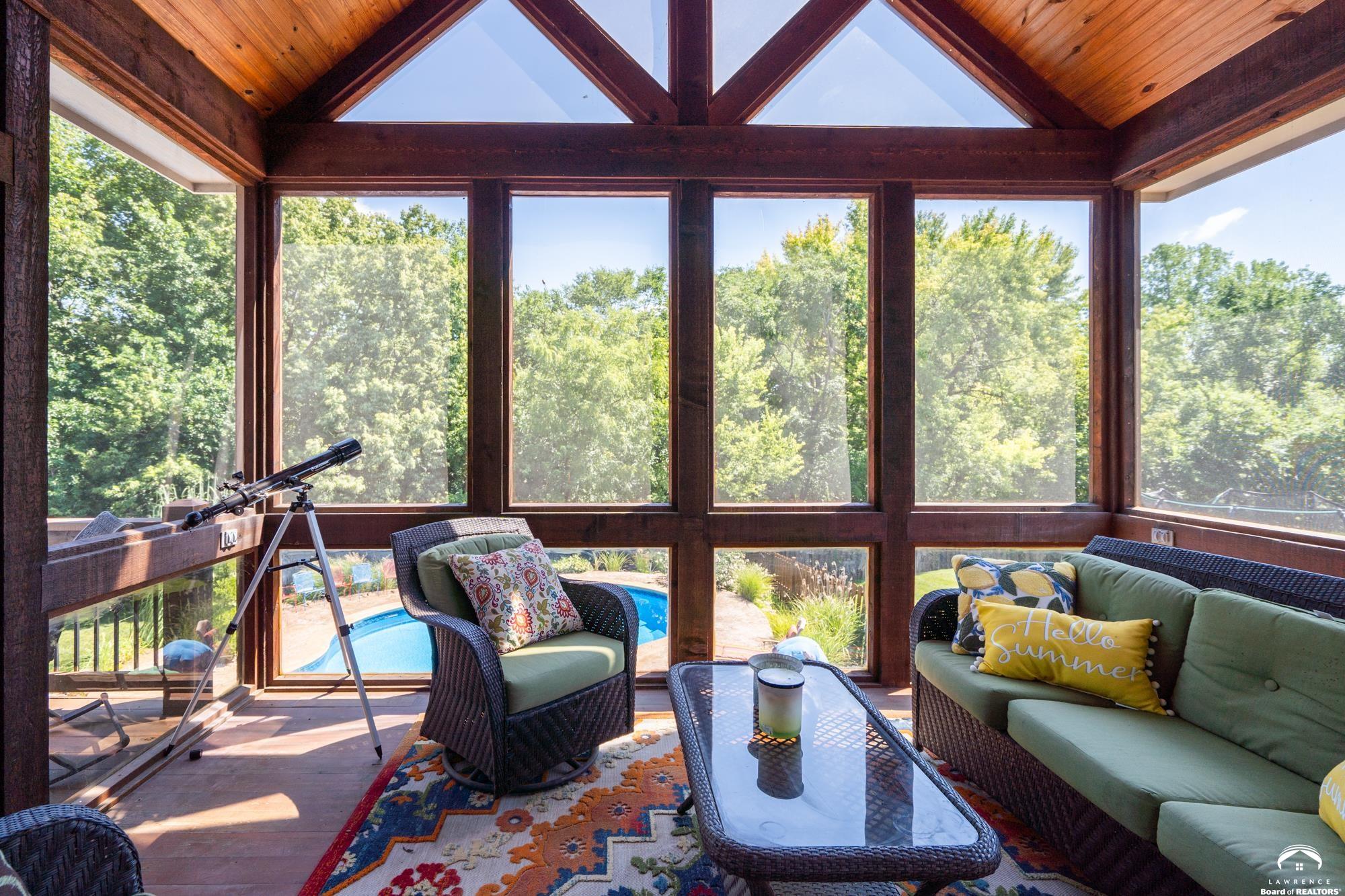 Welcome to your dream home in the desirable Fox Chase South subdivision! This beautifully detailed walk-out rancher offers over 3,400+ feet of thoughtfully designed living space, nestled against lush green space and—perfect if you crave privacy without sacrificing convenience. The main-level includes a Primary Suite with a custom screened porch & spa bath, a thoughtfully updated open kitchen/dining space and a deck with amazing views of the custom salt-water pool and patio. The lower level includes one en-suite bedroom, wet bar, living/sunroom space and two more bedrooms. The expansive storage area could be easily finished for additional office/flex space. Located just minutes from Corpus Christi Catholic Church, Langston Hughes Elementary School, Free State High School and the Rock Chalk Sports Pavilion—everything you need is nearby. Easy access to Kansas City & Topeka, Clinton Lake and the Lawrence Loop Trail will also make your life easier. Enjoy peaceful mornings on your screened porch and evening sunsets on your expanded deck, all while overlooking the serene natural backdrop of the adjacent green space.