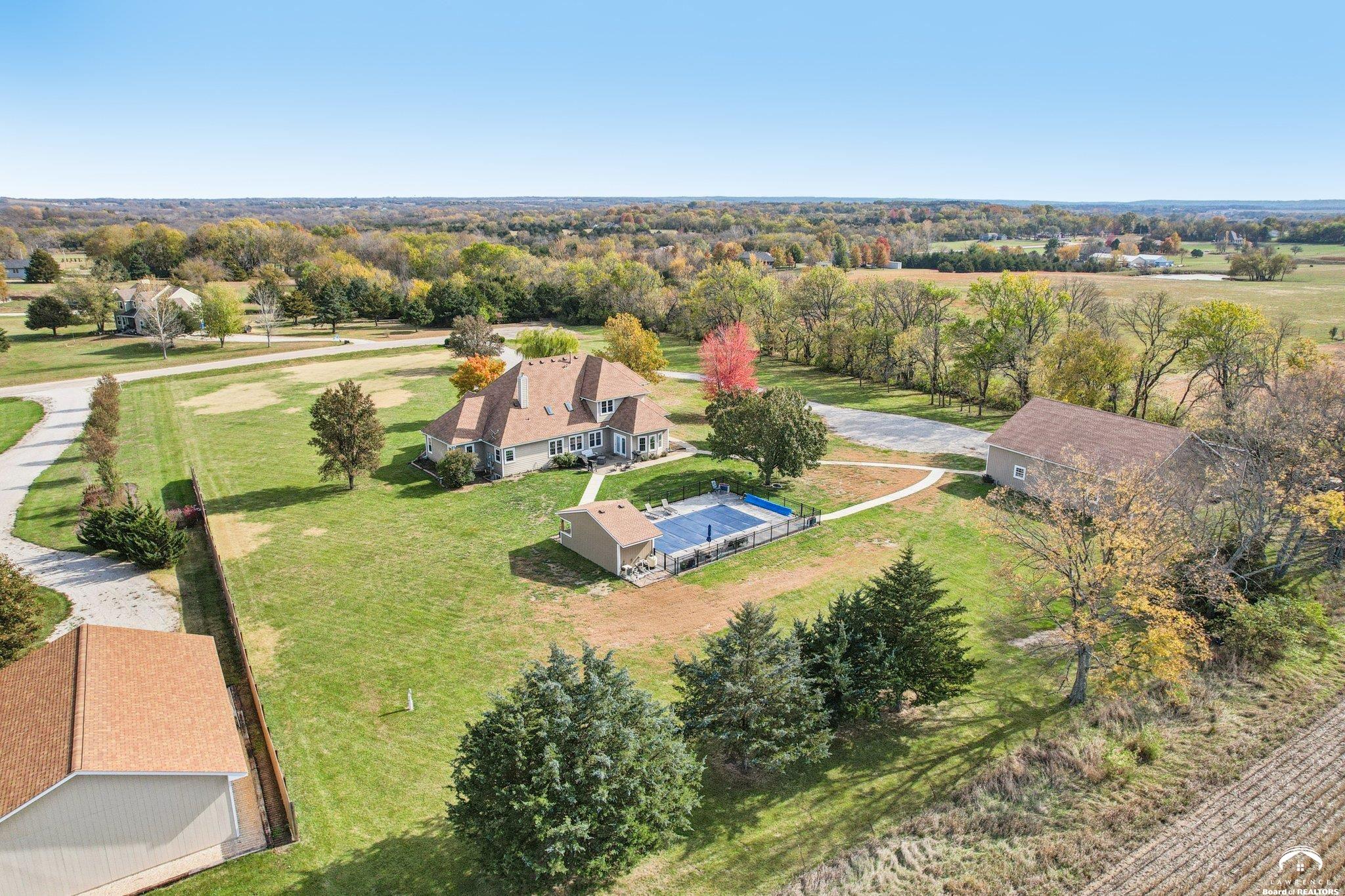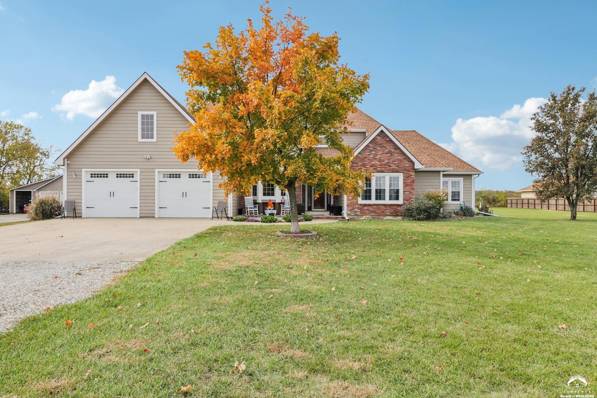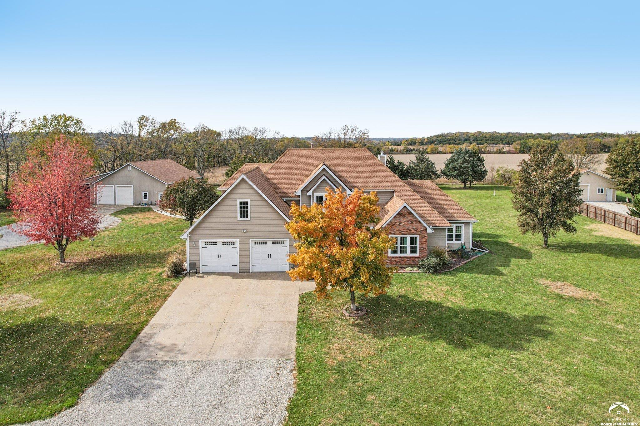 Experience the best of rural living just 2 miles south of Lawrence with this stunning 5-bedroom, 4-bath estate set on 3 beautifully landscaped acres. An inviting open-concept layout welcomes you inside, featuring a spacious kitchen with granite countertops, abundant cabinetry, and seamless flow into the light-filled living areas—perfect for everyday living or entertaining. Recent upgrades include new AC units and furnaces for year-round comfort and efficiency. A standout feature of this property is the impressive 45x46 heated and air-conditioned workshop—ideal for hobbyists, entrepreneurs, or anyone needing exceptional workspace. Step outside to your private oasis with an in-ground saltwater pool, offering the perfect backdrop for summer relaxation and gatherings. The acreage provides ample space for gardening, recreation. Smooth blend of indoor-outdoor living enhance the home’s comfort and functionality. Enjoy peaceful acreage living just minutes from town—this one-of-a-kind property is ready to welcome you home. Key Features: • 5 spacious bedrooms & 4 full bathrooms • Kitchen with granite countertops and generous workspace • New AC units and furnaces • Expansive 45x46 heated/AC workshop • In-ground saltwater pool • Private 3-acre setting just 2 miles from Lawrence Schedule your private tour today and discover the perfect blend of serenity, space, and convenience.