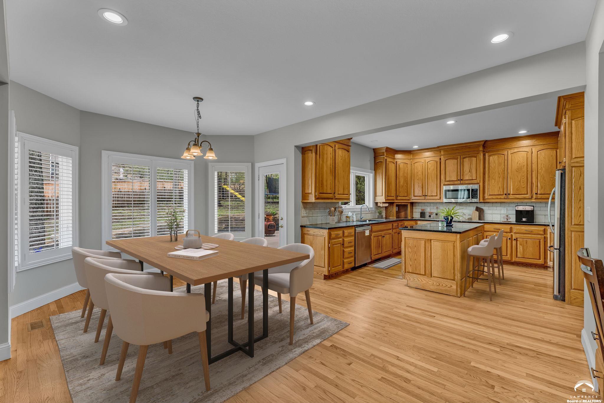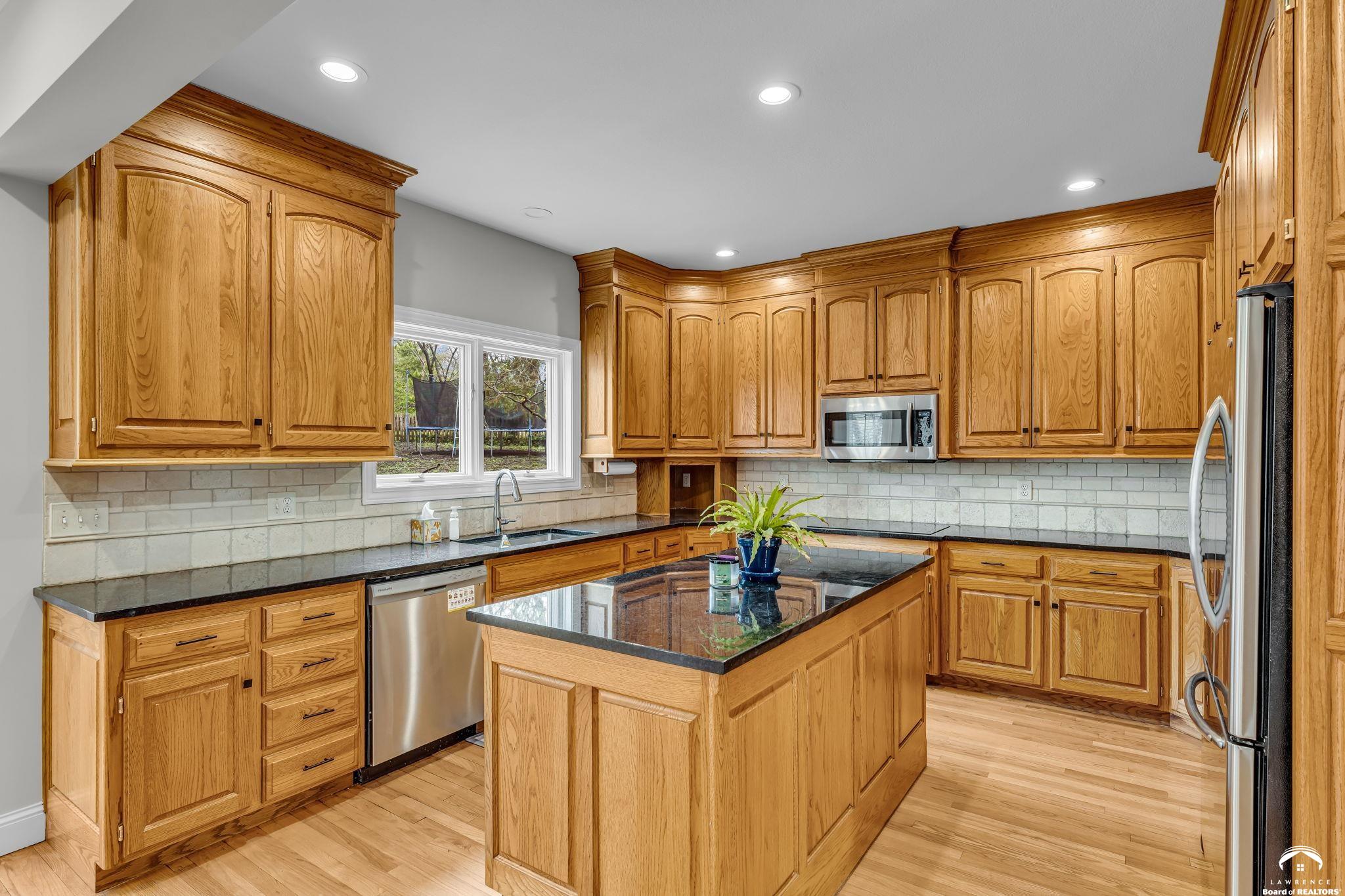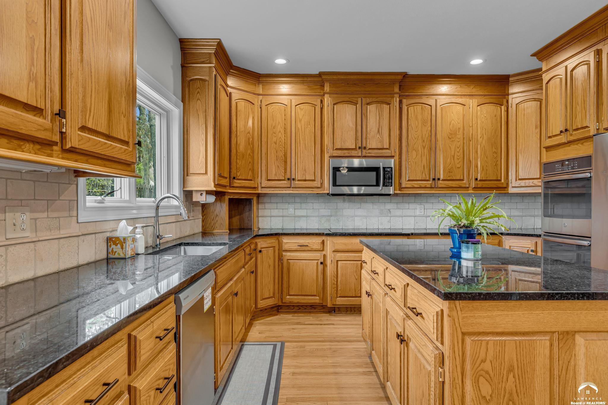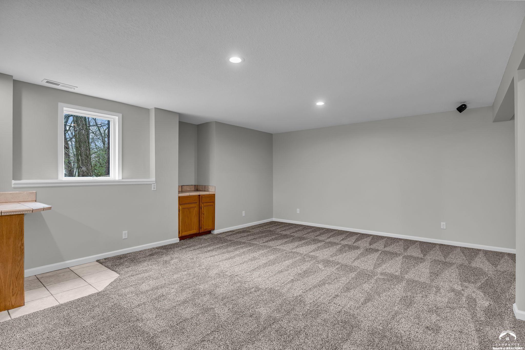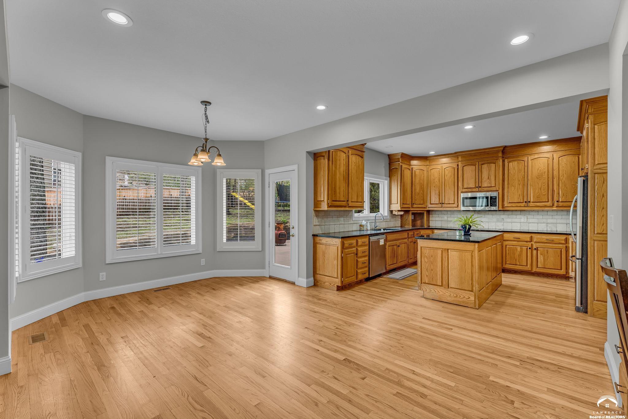 Motivated seller! Priced below county appraised value, this turn-key Quail Run home offers over 4,400 square feet, 5 bedrooms, 5 bathrooms, and an impressive combination of updates, space, and value. Fresh interior paint covers every surface, including the walls, ceilings, garage, trim, and doors, while all new carpet, oiled oak hardwood floors, new vinyl plank flooring in the laundry room, kitchen closet, and pantry, several new ceiling fans, three new toilets, a new hot water heater, whole-house pressure regulator, and updated hardware throughout add to the home’s clean, comfortable, move-in-ready feel. The kitchen is well-equipped with granite countertops, refreshed custom oak cabinets, extra-tall cabinetry with abundant storage, under-cabinet lighting, and a built-in desk area. Downstairs, the daylight basement is filled with natural light and offers a wet bar, plenty of room for the ideal rec space, two large unfinished storage areas, and a reinforced storm shelter room. Outside, the large backyard is shaded by mature trees and provides a peaceful setting to enjoy Kansas evenings on the concrete patio, with the chimenea included.