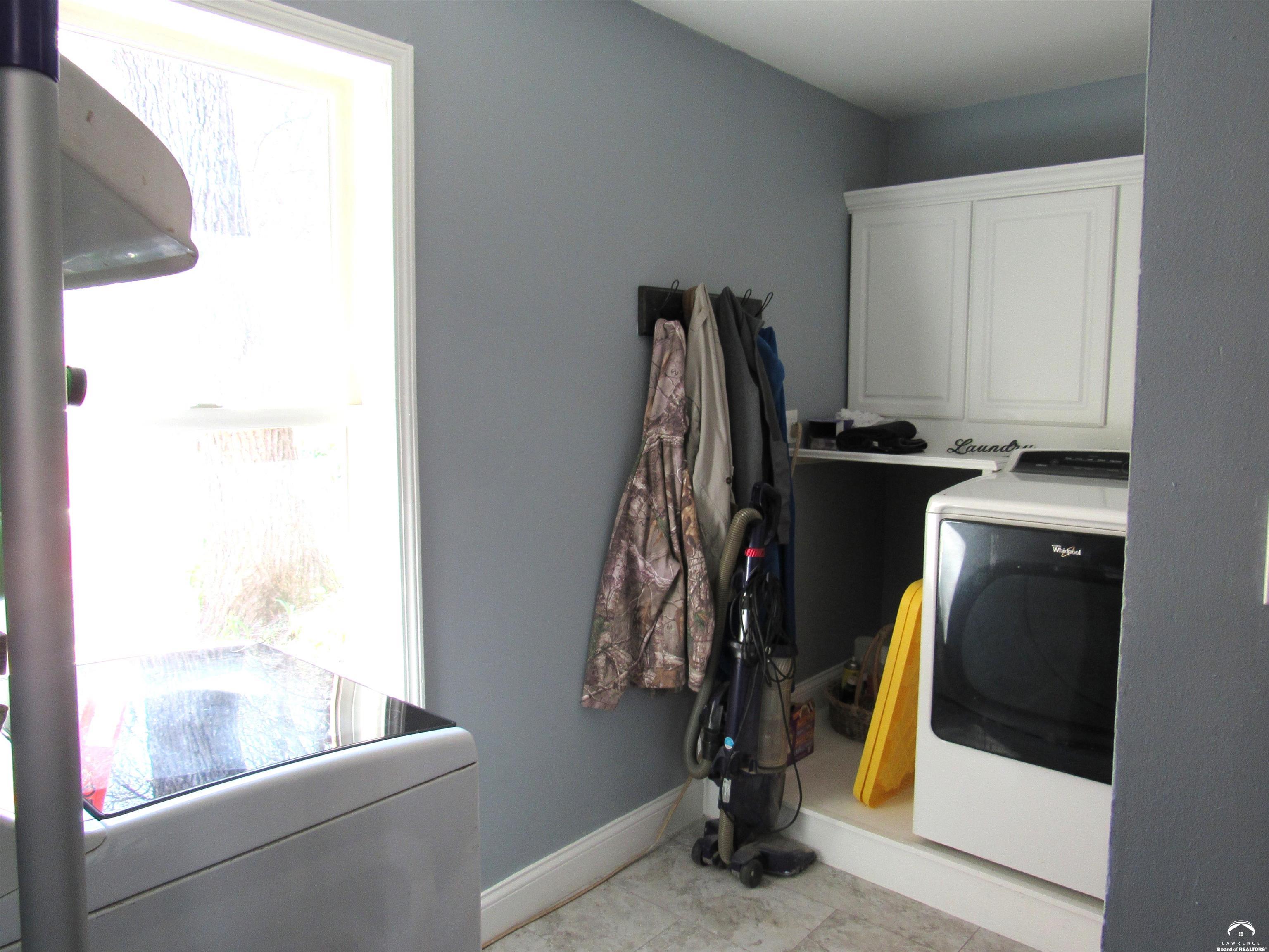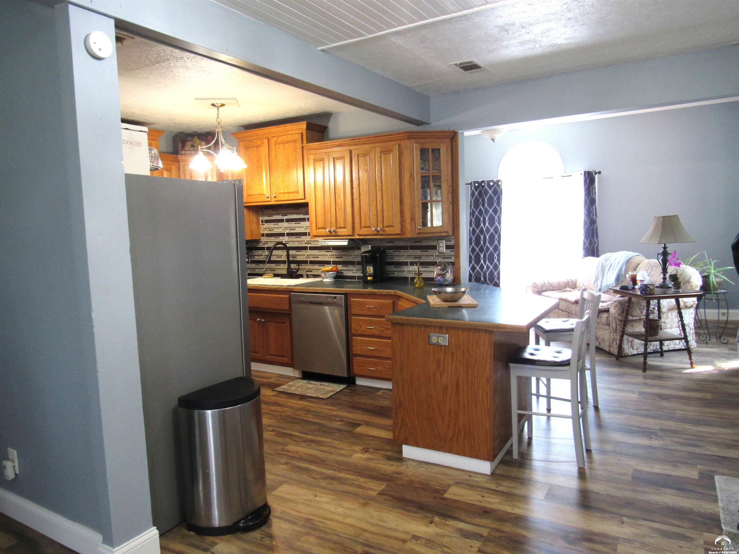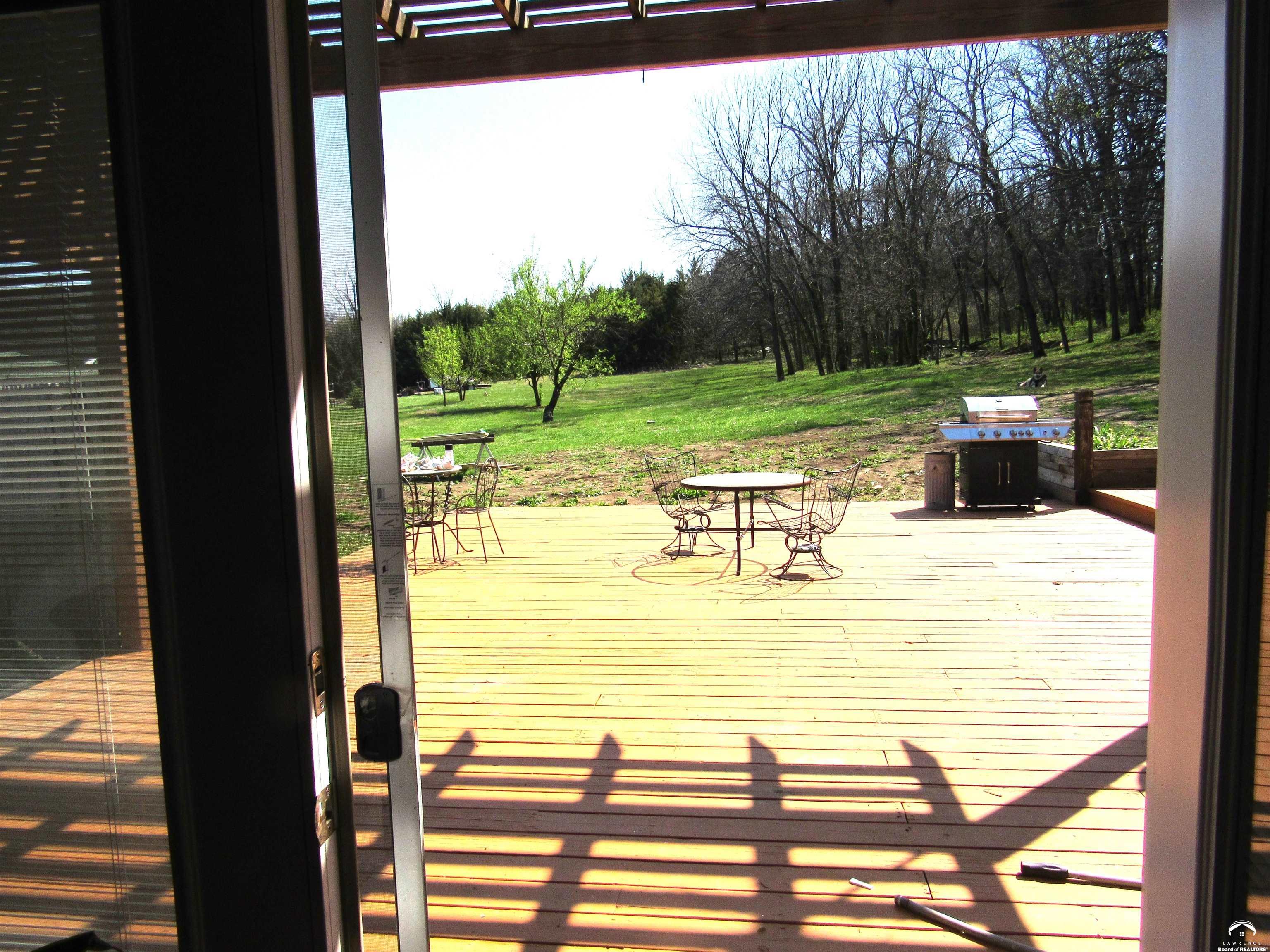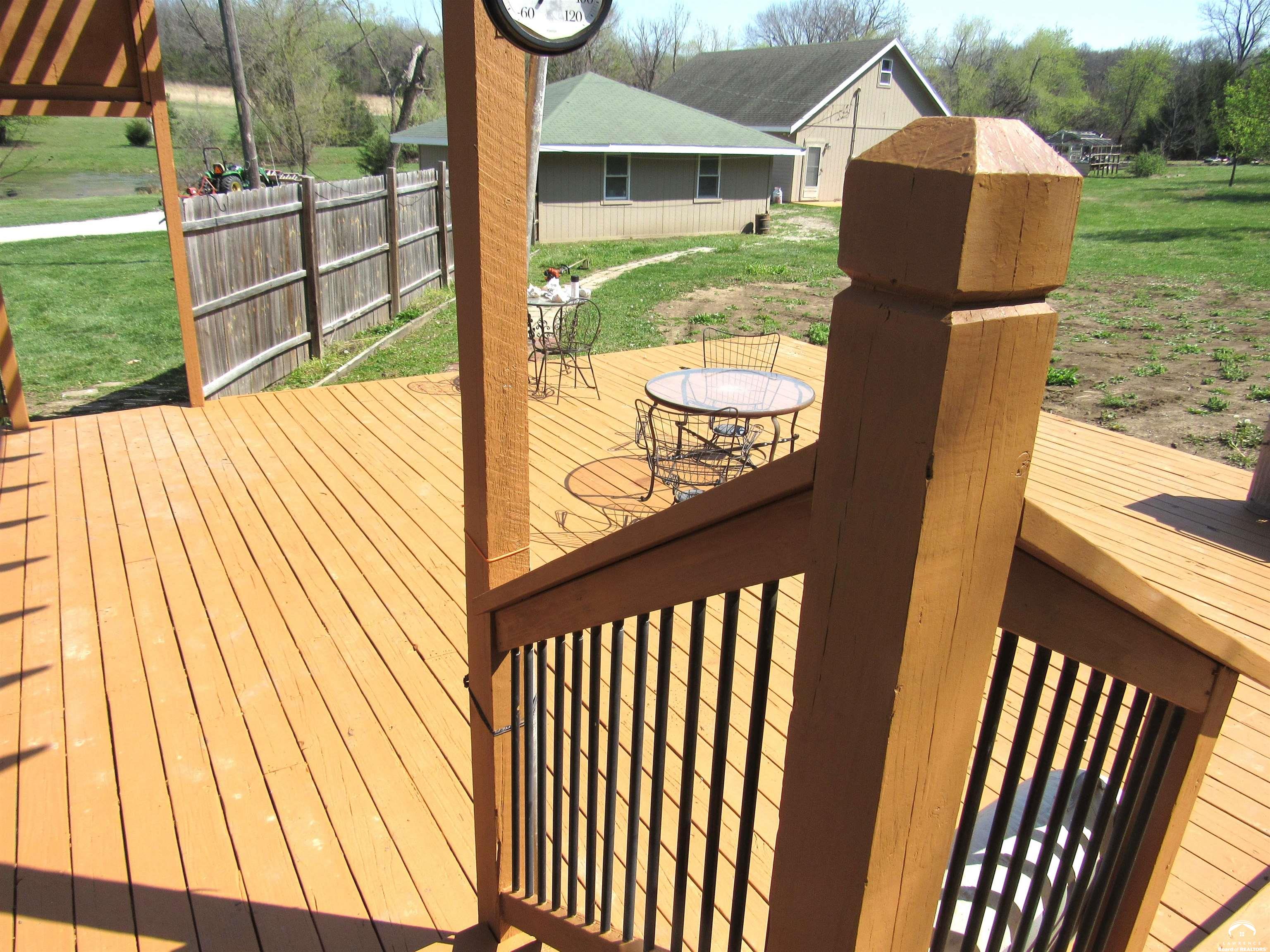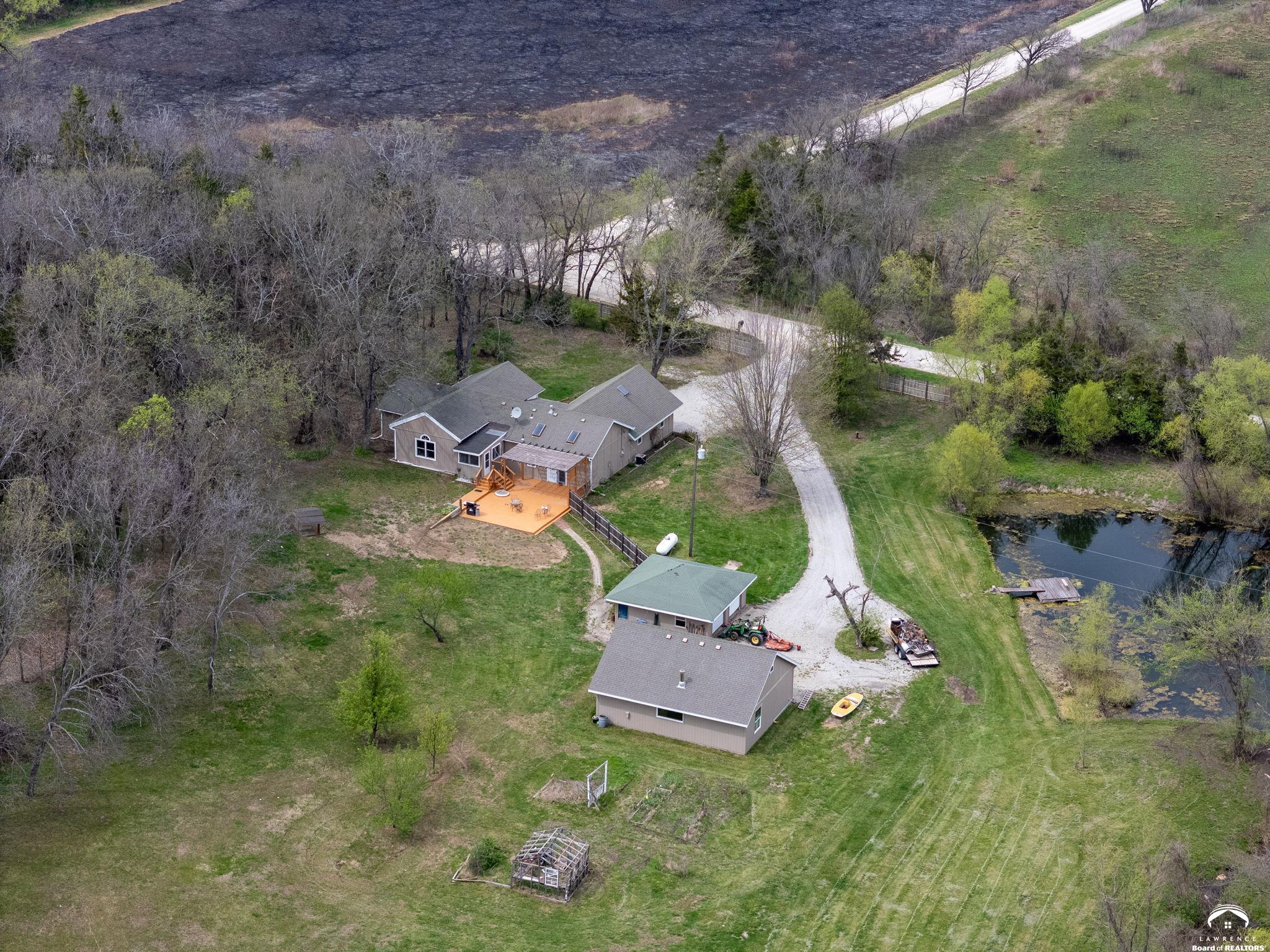 CHARMING COUNTRY PROPERTY ON APPROX. 10 ACRES NEAR K-10 Welcome to your PRIVATE RETREAT near Lawrence, Eudora, Desoto, and Baldwin. Experience the best of country living on this beautiful 10-acre property, ideally located just minutes from K-10 and the communities of Lawrence, Eudora, Desoto, and Baldwin. This updated county home offers 3 bedrooms, 2 baths including a private primary suite featuring a large walk-in closet, skylit remodeled bath, and patio doors opening to a stunning pergola area. Step outside to enjoy a spacious patio perfect for entertaining, a tranquil pond, and a garden bursting with strawberries, asparagus, raspberries, peach and pear trees. Perennials add color, while a wooded area with trails invites you to explore and unwind in nature. The mudroom leads directly to the back patio, providing easy access for outdoor activities. Additional amenities include a bonus room over the attached garage, a separate 24x24 two-car garage, and a generous 36x27 double-door SHOP with 36x15 large man cave or creative space on the upper level. Unfinished basement area. Whether you're gardening, relaxing by the pond, or hosting friends under the pergola, this property offers a peaceful lifestyle with plenty of space for recreation and enjoyment.