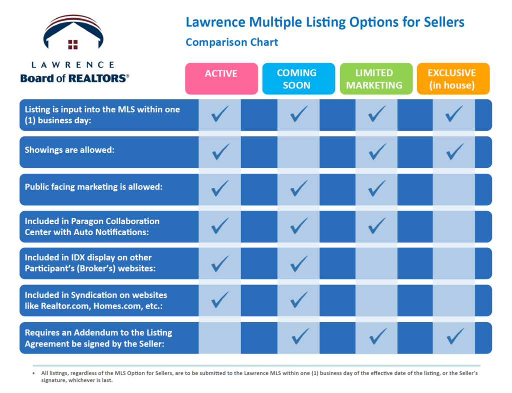 - confirmation of the seller’s decision that their listing not be publicly marketed and disseminated by the MLS as an office exclusive listing or that their listing will not have immediate public marketing through IDX and Syndication as a delayed marketing listing.